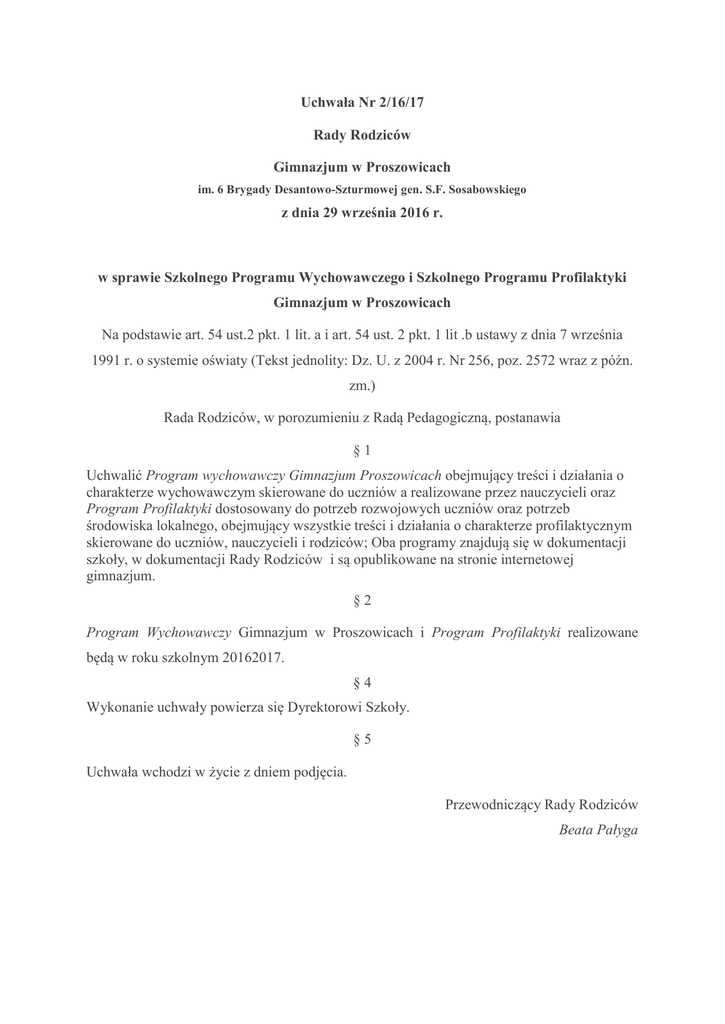 Uchwała Nr 2/16/17 Rady Rodziców Gimnazjum w Proszowicach im. 6 Brygady Desantowo-Szturmowej gen. S.F. Sosabowskiego z dnia 29 września 2016 r. w sprawie Szkolnego Programu Wychowawczego i Szkolnego Programu Profilaktyki Gimnazjum w Proszowicach Na podstawie art. 54 ust.2 pkt. 1 lit. a i art. 54 ust. 2 pkt. 1 lit .b ustawy z dnia 7 września 1991 r. o systemie oświaty (Tekst jednolity: Dz. U. z 2004 r. Nr 256, poz. 2572 wraz z późn. zm.) Rada Rodziców, w porozumieniu z Radą Pedagogiczną, postanawia §1 Uchwalić Program wychowawczy Gimnazjum Proszowicach obejmujący treści i działania o charakterze wychowawczym skierowane do uczniów a realizowane przez nauczycieli oraz Program Profilaktyki dostosowany do potrzeb rozwojowych uczniów oraz potrzeb środowiska lokalnego, obejmujący wszystkie treści i działania o charakterze profilaktycznym skierowane do uczniów, nauczycieli i rodziców; Oba programy znajdują się w dokumentacji szkoły, w dokumentacji Rady Rodziców i są opublikowane na stronie internetowej gimnazjum. §2 Program Wychowawczy Gimnazjum w Proszowicach i Program Profilaktyki realizowane będą w roku szkolnym 20162017. §4 Wykonanie uchwały powierza się Dyrektorowi Szkoły. §5 Uchwała wchodzi w życie z dniem podjęcia. Przewodniczący Rady Rodziców Beata Pałyga