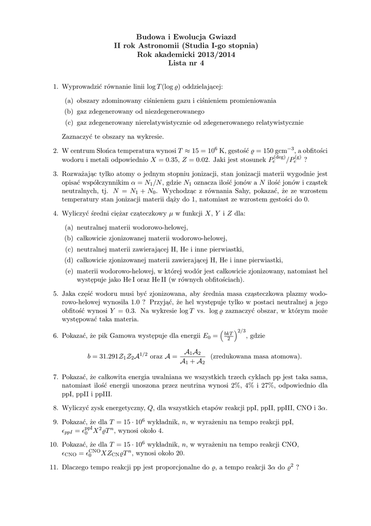 Budowa i Ewolucja Gwiazd II rok Astronomii (Studia I-go stopnia) Rok akademicki 2013/2014 Lista nr 4 1. Wyprowadzić równanie linii log T (log %) oddzielajacej: , (a) obszary zdominowany ciśnieniem gazu i ciśnieniem promieniowania (b) gaz zdegenerowany od niezdegenerowanego (c) gaz zdegenerowany nierelatywistycznie od zdegenerowanego relatywistycznie Zaznaczyć te obszary na wykresie. 2. W centrum SÃlońca temperatura wynosi T ≈ 15 = 106 K, gestość % = 150 gcm−3 , a obfitości , (deg) (g) wodoru i metali odpowiednio X = 0.35, Z = 0.02. Jaki jest stosunek Pe /Pe ? 3. Rozważajac , tylko atomy o jednym stopniu jonizacji, stan jonizacji materii wygodnie jest opisać wspóÃlczynnikim α = N1 /N , gdzie N1 oznacza ilość jonów a N ilość jonów i czastek , neutralnych, tj. N = N1 + N0 . Wychodzac z równania Sahy, pokazać, że ze wzrostem , temperatury stan jonizacji materii daży do 1, natomiast ze wzrostem gestości do 0. , , 4. Wyliczyć średni cieżar czateczkowy µ w funkcji X, Y i Z dla: , , (a) neutralnej materii wodorowo-helowej, (b) caÃlkowicie zjonizowanej materii wodorowo-helowej, (c) neutralnej materii zawierajacej H, He i inne pierwiastki, , H, He i inne pierwiastki, (d) caÃlkowicie zjonizowanej materii zawierajacej , (e) materii wodorowo-helowej, w której wodór jest caÃlkowicie zjonizowany, natomiast hel wystepuje jako He I oraz He II (w równych obfitościach). , 5. Jaka cześć wodoru musi być zjonizowana, aby średnia masa czasteczkowa plazmy wodo, , rowo-helowej wynosiÃla 1.0 ? Przyjać, że hel wyst epuje tylko w postaci neutralnej a jego , , obfitość wynosi Y = 0.3. Na wykresie log T vs. log % zaznaczyć obszar, w którym może wystepować taka materia. , ³ dla energii E0 = 6. Pokazać, że pik Gamowa wystepuje , b = 31.291Z1 Z2 A1/2 oraz A = bkT 2 ´2/3 , gdzie A1 A2 (zredukowana masa atomowa). A1 + A2 7. Pokazać, że caÃlkowita energia uwalniana we wszystkich trzech cyklach pp jest taka sama, natomiast ilość energii unoszona przez neutrina wynosi 2%, 4% i 27%, odpowiednio dla ppI, ppII i ppIII. 8. Wyliczyć zysk energetyczny, Q, dla wszystkich etapów reakcji ppI, ppII, ppIII, CNO i 3α. 9. Pokazać, że dla T = 15 · 106 wykÃladnik, n, w wyrażeniu na tempo reakcji ppI, 2 n ²ppI = ²ppI 0 X %T , wynosi okoÃlo 4. 10. Pokazać, że dla T = 15 · 106 wykÃladnik, n, w wyrażeniu na tempo reakcji CNO, ²CNO = ²CNO XZCN %T n , wynosi okoÃlo 20. 0 11. Dlaczego tempo reakcji pp jest proporcjonalne do %, a tempo reakcji 3α do %2 ? 12. ZakÃladajac , odpowiednie wartości temperatur centralnych, oszacować minimalne masy gwiazd, we wnetrzach których moga, zachodzić poszczególne przemiany jadrowe: ppI, ppII, ppIII, , , CNO, 3α, ,,palenie wegla”, ,,palenie tlenu”, ,,palenie krzemu”. , Jadwiga Daszyńska-Daszkiewicz