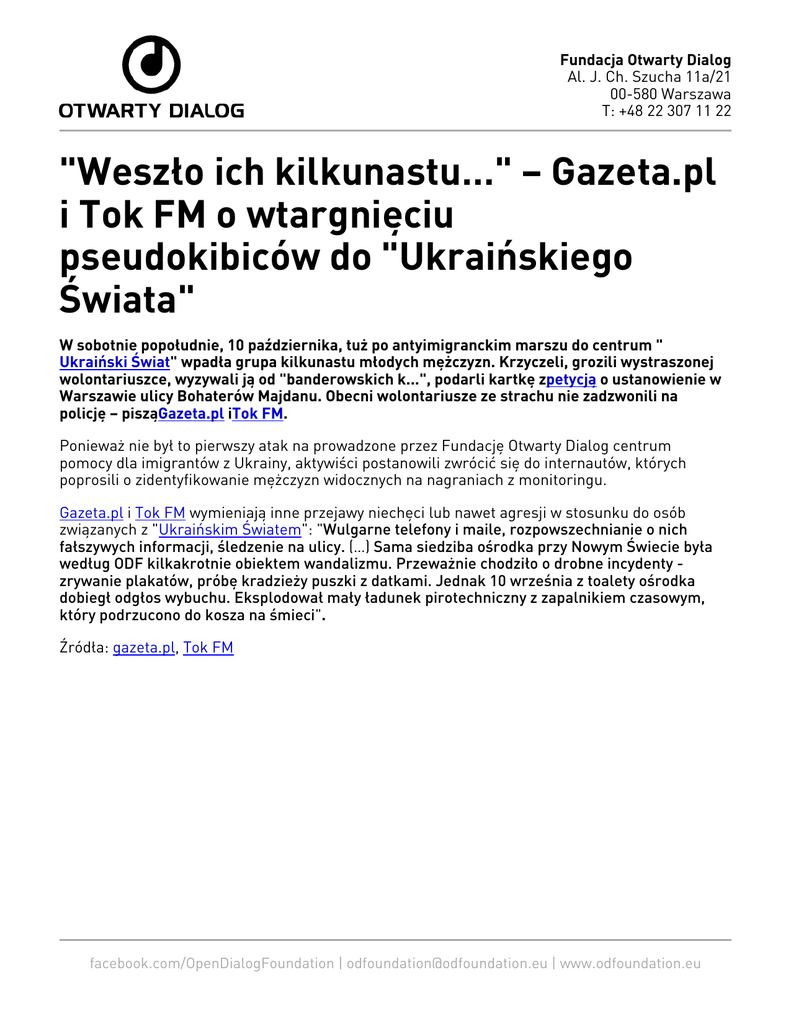Fundacja Otwarty Dialog Al. J. Ch. Szucha 11a/21 00-580 Warszawa T: +48 22 307 11 22 "Weszło ich kilkunastu…" – Gazeta.pl i Tok FM o wtargnięciu pseudokibiców do "Ukraińskiego Świata" W sobotnie popołudnie, 10 października, tuż po antyimigranckim marszu do centrum " Ukraiński Świat" wpadła grupa kilkunastu młodych mężczyzn. Krzyczeli, grozili wystraszonej wolontariuszce, wyzywali ją od "banderowskich k...", podarli kartkę zpetycją o ustanowienie w Warszawie ulicy Bohaterów Majdanu. Obecni wolontariusze ze strachu nie zadzwonili na policję – pisząGazeta.pl iTok FM. Ponieważ nie był to pierwszy atak na prowadzone przez Fundację Otwarty Dialog centrum pomocy dla imigrantów z Ukrainy, aktywiści postanowili zwrócić się do internautów, których poprosili o zidentyfikowanie mężczyzn widocznych na nagraniach z monitoringu. Gazeta.pl i Tok FM wymieniają inne przejawy niechęci lub nawet agresji w stosunku do osób związanych z "Ukraińskim Światem": "Wulgarne telefony i maile, rozpowszechnianie o nich fałszywych informacji, śledzenie na ulicy. (…) Sama siedziba ośrodka przy Nowym Świecie była według ODF kilkakrotnie obiektem wandalizmu. Przeważnie chodziło o drobne incydenty zrywanie plakatów, próbę kradzieży puszki z datkami. Jednak 10 września z toalety ośrodka dobiegł odgłos wybuchu. Eksplodował mały ładunek pirotechniczny z zapalnikiem czasowym, który podrzucono do kosza na śmieci". Źródła: gazeta.pl, Tok FM facebook.com/OpenDialogFoundation | [email protected] | www.odfoundation.eu