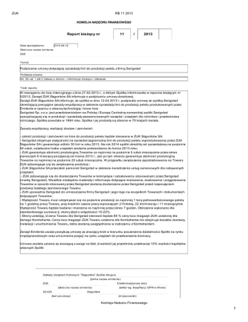 ZUK RB 11 2013 KOMISJA NADZORU FINANSOWEGO Raport bieżący nr 11 / 2013 2013-04-12 Data sporządzenia: Skrócona nazwa emitenta ZUK Temat Podpisanie umowy dotyczącej sprzedaży linii do produkcji peletu z firmą Serigstad Podstawa prawna Art. 56 ust. 1 pkt 2 Ustawy o ofercie - informacje bieżące i okresowe Treść raportu: W nawiązaniu do listu intencyjnego z dnia 27.02.2013 r., o którym Spółka informowała w raporcie bieżącym nr 5/2013, Zarząd ZUK Stąporków SA informuje o podpisaniu umowy docelowej. Zarząd ZUK Stąporków SA informuje, że spółka w dniu 12.04.2013 r. podpisała umowę ze spółką Serigstad określającą precyzyjne zasady współpracy w zakresie sprzedaży linii do produkcji peletu produkowanych przez Emitenta w oparciu o własną technologię i know how. Serigstad Sp. z o.o. jest przedstawicielem na Polskę i Europę Centralną norweskiej spółki Serigstad specjalizującej się w produkcji i sprzedaży zaawansowanych narzędzi i urządzeń dla rolnictwa i przetwórstwa rolniczego. Spółka powstała w 1864 roku. Spółka i jej produkty są obecne w 70 krajach świata. Zasady współpracy, realizacji dostaw i zamówień: - całość produkcji i zamówień na linie do produkcji peletu będzie lokowana w ZUK Stąporków SA; - Serigstad otrzymuje wyłączność na sprzedaż zagraniczną linii do produkcji peletu wyprodukowanej przez ZUK Stąporków SA i gwarantuje odbiór 30 linii w roku 2013. Na rok 2014 spółki określiły cel sprzedażowy na poziomie 50 sztuk, ostateczna liczba urządzeń zostanie potwierdzona do końca 2013 roku; - ZUK gwarantuje zdolność produkcyjną Towarów co najmniej na poziomie 5 sztuk miesięcznie przez okres pierwszych 6 miesięcy począwszy od marca 2013 r., zaś po tym okresie gwarantuje zdolność produkcyjną Towarów co najmniej na poziomie 20 sztuk miesięcznie. W przypadku zwiększenia zapotrzebowania na Towary ZUK zobowiązuje się do zwiększenia produkcji.; - ZUK Stąporków SA przeszkoli personel Serigstad w zakresie świadczenia usług serwisowych dla nabywanych urządzeń; - ZUK zobowiązuje się do dostarczania Towarów w kolorystyce i oznakowaniu stosowanymi przez Serigstad (markę Serigstad). Wszelkie niezbędne materiały i informacje dotyczące malowania, znakowania i przygotowania Towarów w sposób stosowany przez Serigstad zostaną dostarczone przez Serigstad przed rozpoczęciem produkcji każdego zamówionego Towaru; - ZUK upoważnia Serigstad do umieszczania firmy Serigstad i jego logo na wszystkich Towarach i dokumentach dotyczących Towarów; - Wydajność Towaru musi utrzymywać się na poziomie produkcji co najmniej 1 tony pełnowartościowego peletu na 1 godzinę pracy Towaru, przy średnim czasie pracy wynoszącym 21h/dobę, 22 dni/miesiąc i 11 miesięcy/rok. Wydajność Towaru będzie badana i mierzona co najmniej przez okres 7 godzin. Obliczenia wykonano dla standardowego surowca tj. słomy zbóż o wilgotności 15-22%. - Strony ustalają, iż cena Towaru dla Serigstad stanowić będzie 85 % ceny loco magazyn ZUK ustalonej dla danego Kontrahenta. Cena loco magazyn ZUK Towaru ustalona dla Kontrahenta nie obejmuje kosztów dostawy, instalacji i uruchomienia Towaru, które zostaną uwzględnione w rozliczeniu z Kontrahentem. Zarząd Emitenta uważa powyższą umowę za znaczący krok w kierunku poszerzenia działalności Spółki na rynku międzynarodowym oraz umocnienia pozycji na rynku urządzeń do przetwarzania biomasy. Umowa została uznana za znaczącą z uwagi na fakt, iż wartość jej przedmiotu przekracza 10% wartości kapitałów własnych Spółki Zakłady Urządzeń Kotłowych "Stąporków" Spółka Akcyjna (pełna nazwa emitenta) ZUK Elektromaszynowy (ele) (skróc ona nazwa emitenta) 26-220 (kod pocztowy) (sektor wg. klasyfikacji GPW w W-wie) Stąporków (miejscowość) Komisja Nadzoru Finansowego 1 ZUK RB 11 2013 Górnic za 3 (ulica) (numer) 041 3741016 041 3741712 (telefon) (fax) [email protected] om.pl www.zuk.c om.pl (e-mail) (www) 6580001142 290552938 (NIP) (REGON) PODPISY OSÓB REPREZENTUJĄCYCH SPÓŁKĘ Data Imię i Nazwisko Stanowisko/Funkc ja 2013-04-12 Grzegorz Pasturczak Prezes Zarządu 2013-04-12 Mac iej Walkiewic z Wiceprezes Zarządu Podpis Komisja Nadzoru Finansowego 2