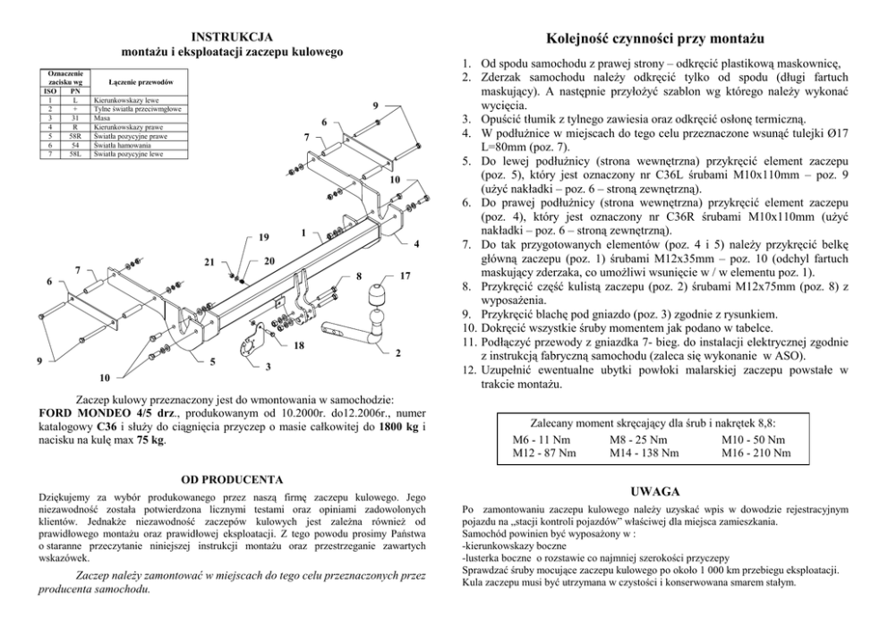 INSTRUKCJA montaŜu i eksploatacji zaczepu kulowego Oznaczenie zacisku wg ISO PN 1 L 2 + 3 31 4 R 5 58R 6 54 7 58L Kolejność czynności przy montaŜu Łączenie przewodów Kierunkowskazy lewe Tylne światła przeciwmgłowe Masa Kierunkowskazy prawe Światła pozycyjne prawe Światła hamowania Światła pozycyjne lewe 9 6 7 10 19 21 7 1 4 20 8 6 18 9 5 17 2 3 10 Zaczep kulowy przeznaczony jest do wmontowania w samochodzie: FORD MONDEO 4/5 drz., produkowanym od 10.2000r. do12.2006r., numer katalogowy C36 i słuŜy do ciągnięcia przyczep o masie całkowitej do 1800 kg i nacisku na kulę max 75 kg. 1. Od spodu samochodu z prawej strony – odkręcić plastikową maskownicę, 2. Zderzak samochodu naleŜy odkręcić tylko od spodu (długi fartuch maskujący). A następnie przyłoŜyć szablon wg którego naleŜy wykonać wycięcia. 3. Opuścić tłumik z tylnego zawiesia oraz odkręcić osłonę termiczną. 4. W podłuŜnice w miejscach do tego celu przeznaczone wsunąć tulejki Ø17 L=80mm (poz. 7). 5. Do lewej podłuŜnicy (strona wewnętrzna) przykręcić element zaczepu (poz. 5), który jest oznaczony nr C36L śrubami M10x110mm – poz. 9 (uŜyć nakładki – poz. 6 – stroną zewnętrzną). 6. Do prawej podłuŜnicy (strona wewnętrzna) przykręcić element zaczepu (poz. 4), który jest oznaczony nr C36R śrubami M10x110mm (uŜyć nakładki – poz. 6 – stroną zewnętrzną). 7. Do tak przygotowanych elementów (poz. 4 i 5) naleŜy przykręcić belkę główną zaczepu (poz. 1) śrubami M12x35mm – poz. 10 (odchyl fartuch maskujący zderzaka, co umoŜliwi wsunięcie w / w elementu poz. 1). 8. Przykręcić część kulistą zaczepu (poz. 2) śrubami M12x75mm (poz. 8) z wyposaŜenia. 9. Przykręcić blachę pod gniazdo (poz. 3) zgodnie z rysunkiem. 10. Dokręcić wszystkie śruby momentem jak podano w tabelce. 11. Podłączyć przewody z gniazdka 7- bieg. do instalacji elektrycznej zgodnie z instrukcją fabryczną samochodu (zaleca się wykonanie w ASO). 12. Uzupełnić ewentualne ubytki powłoki malarskiej zaczepu powstałe w trakcie montaŜu. Zalecany moment skręcający dla śrub i nakrętek 8,8: M6 - 11 Nm M8 - 25 Nm M10 - 50 Nm M12 - 87 Nm M14 - 138 Nm M16 - 210 Nm OD PRODUCENTA Dziękujemy za wybór produkowanego przez naszą firmę zaczepu kulowego. Jego niezawodność została potwierdzona licznymi testami oraz opiniami zadowolonych klientów. JednakŜe niezawodność zaczepów kulowych jest zaleŜna równieŜ od prawidłowego montaŜu oraz prawidłowej eksploatacji. Z tego powodu prosimy Państwa o staranne przeczytanie niniejszej instrukcji montaŜu oraz przestrzeganie zawartych wskazówek. Zaczep naleŜy zamontować w miejscach do tego celu przeznaczonych przez producenta samochodu. UWAGA Po zamontowaniu zaczepu kulowego naleŜy uzyskać wpis w dowodzie rejestracyjnym pojazdu na „stacji kontroli pojazdów” właściwej dla miejsca zamieszkania. Samochód powinien być wyposaŜony w : -kierunkowskazy boczne -lusterka boczne o rozstawie co najmniej szerokości przyczepy Sprawdzać śruby mocujące zaczepu kulowego po około 1 000 km przebiegu eksploatacji. Kula zaczepu musi być utrzymana w czystości i konserwowana smarem stałym. PPUH AUTO-HAK S. J. WyposaŜenie zaczepu: Produkcja Zaczepów Kulowych Henryk & Zbigniew Nejman 76-200 SŁUPSK ul. Słoneczna 16K tel/fax (059) 8-414-414; 8-414-413 E-mail: [email protected] www.autohak.com.pl Zaczep kulowy bez wyposaŜenia elektrycznego C36 Klasa: A50-X Nr kat. Przeznaczony do zamontowania w samochodzie: Producent: FORD Model: MONDEO Typ: 4-5 drz. produkowanego od 10.2000 r. do 12.2006 r. Dane techniczne: Wartość siły D: 9,1 kN maksymalna masa przyczepy: 1800 kg maksymalny nacisk na kulę: 75 kg Numer homologacji zgodnie z wytycznymi regulaminu EKG/ONZ 55.01: E20-55R-01 1150 KARTA GWARANCYJNA Producent udziela gwarancji niniejszą kartą gwarancyjną na okres 24 miesięcy licząc od dnia zakupu zaczepu kulowego do samochodu: FORD MONDEO 4/5 drz. produkowanego od 10.2000 r. do 12.2006 r. Data produkcji .............................. Data zakupu............................................. Zakres gwarancji obejmuje wyłącznie wady jakościowe wynikające z winy producenta. Gwarancja nie obejmuje natomiast uszkodzeń zawinionych przez nabywcę, wynikających z niewłaściwego montaŜu, uŜytkowania lub konserwacji, uszkodzeń mechanicznych, normalnego zuŜycia podczas eksploatacji itp. Gwarancja udzielona na zakupiony towar nie wyłącza, nie ogranicza ani nie zawiesza uprawnień kupującego wynikających z niezgodności towaru z umową. Reklamacje naleŜy zgłaszać w punkcie sprzedaŜy, składając jednocześnie kartę gwarancyjną. Usunięcie "wady" następuje po stwierdzeniu przez punkt sprzedaŜy wspólnie z producentem słuszności złoŜonej reklamacji. Reklamacja powinna być załatwiona w ciągu 14 dni od dnia uznania reklamacji. Karta gwarancyjna jest niewaŜna jeŜeli nie jest wypełniona i podpisana. Data zgłoszenia reklamacji: ................................................................... INFORMACJA WSTĘPNA Zaczep kulowy jest skonstruowany zgodnie z zasadami bezpieczeństwa ruchu drogowego. Zaczep kulowy jest elementem wpływającym na bezpieczeństwo jazdy i moŜe zostać zainstalowany wyłącznie przez personel wyspecjalizowany. Niedopuszczalne jest dokonywanie jakichkolwiek zmian w konstrukcji zaczepu. Powoduje to wygaśniecie dopuszczenia do stosowania. W przypadku obecności masy izolacyjnej lub osłony podwozia w miejscu przylegania zaczepu, naleŜy ją usunąć. Nieosłonięte miejsca karoserii oraz wywiercone otwory naleŜy pomalować farbą antykorozyjną. Informacjami wiąŜącymi odnośnie wartości obciąŜeń są dane podawane przez producenta samochodu, względnie wartości maksymalnej masy przyczepy oraz maksymalnego nacisku na kulę, przy czym wartości parametrów zaczepu kulowego nie mogą być przekroczone. Wzór do obliczania wartości siły D: Maks. masa przyczepy [kg] x Maks. masa 