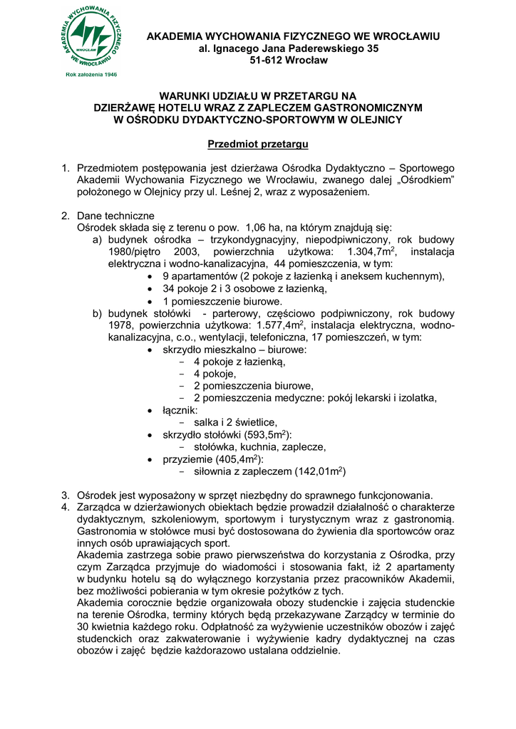 AKADEMIA WYCHOWANIA FIZYCZNEGO WE WROCŁAWIU al. Ignacego Jana Paderewskiego 35 51-612 Wrocław WARUNKI UDZIAŁU W PRZETARGU NA DZIERŻAWĘ HOTELU WRAZ Z ZAPLECZEM GASTRONOMICZNYM W OŚRODKU DYDAKTYCZNO-SPORTOWYM W OLEJNICY Przedmiot przetargu 1. Przedmiotem postępowania jest dzierżawa Ośrodka Dydaktyczno – Sportowego Akademii Wychowania Fizycznego we Wrocławiu, zwanego dalej „Ośrodkiem” położonego w Olejnicy przy ul. Leśnej 2, wraz z wyposażeniem. 2. Dane techniczne Ośrodek składa się z terenu o pow. 1,06 ha, na którym znajdują się: a) budynek ośrodka – trzykondygnacyjny, niepodpiwniczony, rok budowy 1980/piętro 2003, powierzchnia użytkowa: 1.304,7m2, instalacja elektryczna i wodno-kanalizacyjna, 44 pomieszczenia, w tym: 9 apartamentów (2 pokoje z łazienką i aneksem kuchennym), 34 pokoje 2 i 3 osobowe z łazienką, 1 pomieszczenie biurowe. b) budynek stołówki - parterowy, częściowo podpiwniczony, rok budowy 1978, powierzchnia użytkowa: 1.577,4m2, instalacja elektryczna, wodnokanalizacyjna, c.o., wentylacji, telefoniczna, 17 pomieszczeń, w tym: skrzydło mieszkalno – biurowe: 4 pokoje z łazienką, 4 pokoje, 2 pomieszczenia biurowe, 2 pomieszczenia medyczne: pokój lekarski i izolatka, łącznik: salka i 2 świetlice, skrzydło stołówki (593,5m2): stołówka, kuchnia, zaplecze, przyziemie (405,4m2): siłownia z zapleczem (142,01m2) 3. Ośrodek jest wyposażony w sprzęt niezbędny do sprawnego funkcjonowania. 4. Zarządca w dzierżawionych obiektach będzie prowadził działalność o charakterze dydaktycznym, szkoleniowym, sportowym i turystycznym wraz z gastronomią. Gastronomia w stołówce musi być dostosowana do żywienia dla sportowców oraz innych osób uprawiających sport. Akademia zastrzega sobie prawo pierwszeństwa do korzystania z Ośrodka, przy czym Zarządca przyjmuje do wiadomości i stosowania fakt, iż 2 apartamenty w budynku hotelu są do wyłącznego korzystania przez pracowników Akademii, bez możliwości pobierania w tym okresie pożytków z tych. Akademia corocznie będzie organizowała obozy studenckie i zajęcia studenckie na terenie Ośrodka, terminy których będą przekazywane Zarządcy w terminie do 30 kwietnia każdego roku. Odpłatność za wyżywienie uczestników obozów i zajęć studenckich oraz zakwaterowanie i wyżywienie kadry dydaktycznej na czas obozów i zajęć będzie każdorazowo ustalana oddzielnie. 5. Podatek od nieruchomości od dzierżawionej nieruchomości za rok 2014 wynosi 47.340 zł. Warunki udziału w przetargu 1. Prowadzenie działalności gospodarczej. 2. Udokumentowane doświadczenie w prowadzeniu placówek wypoczynkowych o charakterze szkoleniowo – sportowym. 3. Dokonanie wizji lokalnej i zapoznanie się z obiektem. 4. Przedłożenie koncepcji działania Ośrodka. Opis sposobu przygotowania ofert 1. Na ofertę składają się: a) oferta cenowa, b) opis sposobu prowadzenia Ośrodka, c) referencje. Miejsce oraz termin składania ofert 1. Ofertę należy złożyć w Sekretariacie Kanclerza Akademii Wychowania Fizycznego we Wrocławiu przy al. Ignacego Jana Paderewskiego 35 w pok. 61 znajdującym się w Wielofunkcyjnej Hali Sportowej, w terminie najpóźniej do dnia 17.02.2014 do godziny 12.00. 2. Na opakowaniu należy zaznaczyć, iż jest to oferta dot. „DZIERŻAWY HOTELU WRAZ Z ZAPLECZEM GASTRONOMICZNYM W OŚRODKU DYDAKTYCZNOSPORTOWYM W OLEJNICY ”. Opis kryteriów, którymi będzie się kierował Wynajmujący przy wyborze oferty, wraz z podaniem znaczenia tych kryteriów 1. Wydzierżawiający ustala kryterium oceny ofert: a) Roczny czynsz dzierżawny – 100 %. 2. Jeżeli w niniejszym postępowaniu nie będzie można dokonać wyboru oferty najkorzystniejszej ze względu na to, że zostały złożone oferty równorzędne, Wydzierżawiający wezwie Oferentów do ustnej licytacji. Informacje o formalnościach, jakie powinny zostać dopełnione po wyborze oferty w celu zawarcia umowy 1. 2. 3. Po wyborze najkorzystniejszej oferty Wydzierżawiający zawiadamia Oferentów, o wyborze najkorzystniejszej oferty. Wydzierżawiający zawrze umowę (wzór umowy stanowi załącznik nr 1 do warunków udziału w przetargu) z wybranym Oferentem w terminie ustalonym między stronami. W przypadku, gdy Oferent, którego oferta została wybrana uchyla się od zawarcia umowy, Wydzierżawiający może wybrać ofertę najkorzystniejszą spośród pozostałych ofert. 2