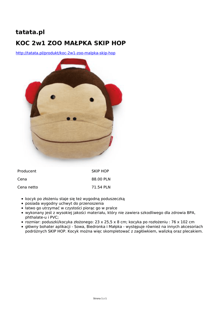 tatata.pl KOC 2w1 ZOO MAŁPKA SKIP HOP http://tatata.pl/produkt/koc-2w1-zoo-malpka-skip-hop Producent SKIP HOP Cena 88.00 PLN Cena netto 71.54 PLN kocyk po złożeniu staje się też wygodną poduszeczką posiada wygodny uchwyt do przenoszenia łatwo go utrzymać w czystości piorąc go w pralce wykonany jest z wysokiej jakości materiału, który nie zawiera szkodliwego dla zdrowia BPA, phthalate-u i PVC; rozmiar: poduszki/kocyka złożonego: 23 x 25,5 x 8 cm; kocyka po rozłożeniu : 76 x 102 cm główny bohater aplikacji - Sowa, Biedronka i Małpka - występuje również na innych akcesoriach podróżnych SKIP HOP. Kocyk można więc skompletować z zagłówkiem, walizką oraz plecakiem. Strona 1 z 1