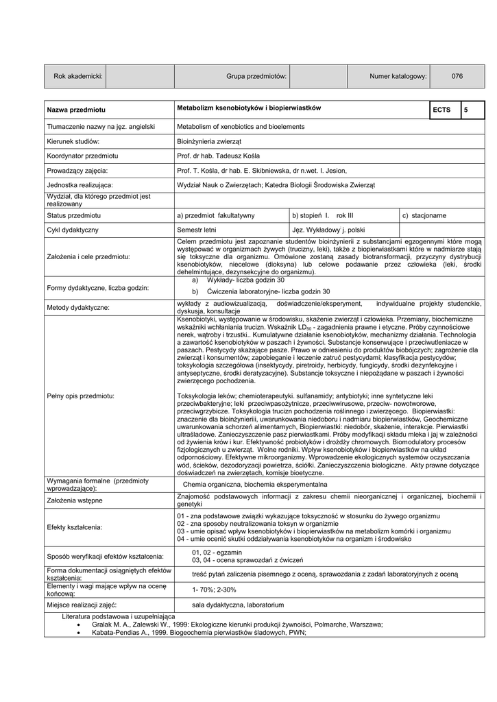 Grupa przedmiotów: Rok akademicki: Numer katalogowy: Nazwa przedmiotu Metabolizm ksenobiotyków i biopierwiastków Tłumaczenie nazwy na jęz. angielski Metabolism of xenobiotics and bioelements Kierunek studiów: Bioinżynieria zwierząt Koordynator przedmiotu Prof. dr hab. Tadeusz Kośla Prowadzący zajęcia: Prof. T. Kośla, dr hab. E. Skibniewska, dr n.wet. I. Jesion, Jednostka realizująca: Wydział Nauk o Zwierzętach; Katedra Biologii Środowiska Zwierząt 076 ECTS 5 Wydział, dla którego przedmiot jest realizowany Status przedmiotu Cykl dydaktyczny Założenia i cele przedmiotu: Formy dydaktyczne, liczba godzin: Metody dydaktyczne: Pełny opis przedmiotu: Wymagania formalne (przedmioty wprowadzające): a) przedmiot fakultatywny Semestr letni b) stopień I. rok III c) stacjonarne : Jęz. Wykładowy j. polski Celem przedmiotu jest zapoznanie studentów bioinżynierii z substancjami egzogennymi które mogą występować w organizmach żywych (trucizny, leki), także z biopierwiastkami które w nadmiarze stają się toksyczne dla organizmu. Omówione zostaną zasady biotransformacji, przyczyny dystrybucji ksenobiotyków, niecelowe (dioksyna) lub celowe podawanie przez człowieka (leki, środki dehelmintujące, dezynsekcyjne do organizmu). a) Wykłady- liczba godzin 30 b) Ćwiczenia laboratoryjne- liczba godzin 30 wykłady z audiowizualizacją, doświadczenie/eksperyment, indywidualne projekty studenckie, dyskusja, konsultacje Ksenobiotyki, występowanie w środowisku, skażenie zwierząt i człowieka. Przemiany, biochemiczne wskaźniki wchłaniania trucizn. Wskaźnik LD50 - zagadnienia prawne i etyczne. Próby czynnościowe nerek, wątroby i trzustki.. Kumulatywne działanie ksenobiotyków, mechanizmy działania. Technologia a zawartość ksenobiotyków w paszach i żywności. Substancje konserwujące i przeciwutleniacze w paszach. Pestycydy skażające pasze. Prawo w odniesieniu do produktów biobójczych; zagrożenie dla zwierząt i konsumentów; zapobieganie i leczenie zatruć pestycydami; klasyfikacja pestycydów; toksykologia szczegółowa (insektycydy, piretroidy, herbicydy, fungicydy, środki dezynfekcyjne i antyseptyczne, środki deratyzacyjne). Substancje toksyczne i niepożądane w paszach i żywności zwierzęcego pochodzenia. Toksykologia leków; chemioterapeutyki. sulfanamidy; antybiotyki; inne syntetyczne leki przeciwbakteryjne; leki przeciwpasożytnicze, przeciwwirusowe, przeciw- nowotworowe, przeciwgrzybicze. Toksykologia trucizn pochodzenia roślinnego i zwierzęcego. Biopierwiastki: znaczenie dla bioinżynieriii, uwarunkowania niedoboru i nadmiaru biopierwiastków, Geochemiczne uwarunkowania schorzeń alimentarnych, Biopierwiastki: niedobór, skażenie, interakcje. Pierwiastki ultraśladowe. Zanieczyszczenie pasz pierwiastkami. Próby modyfikacji składu mleka i jaj w zależności od żywienia krów i kur. Efektywność probiotyków i drożdży chromowych. Biomodulatory procesów fizjologicznych u zwierząt. Wolne rodniki. Wpływ ksenobiotyków i biopierwiastków na układ odpornościowy. Efektywne mikroorganizmy. Wprowadzenie ekologicznych systemów oczyszczania wód, ścieków, dezodoryzacji powietrza, ściółki. Zanieczyszczenia biologiczne. Akty prawne dotyczące doświadczeń na zwierzętach, komisje bioetyczne. Chemia organiczna, biochemia eksperymentalna Założenia wstępne Znajomość podstawowych informacji z zakresu chemii nieorganicznej i organicznej, biochemii i genetyki Efekty kształcenia: 01 - zna podstawowe związki wykazujące toksyczność w stosunku do żywego organizmu 02 - zna sposoby neutralizowania toksyn w organizmie 03 - umie opisać wpływ ksenobiotyków i biopierwiastków na metabolizm komórki i organizmu 04 - umie ocenić skutki oddziaływania ksenobiotyków na organizm i środowisko Sposób weryfikacji efektów kształcenia: Forma dokumentacji osiągniętych efektów kształcenia: Elementy i wagi mające wpływ na ocenę końcową: Miejsce realizacji zajęć: 01, 02 - egzamin 03, 04 - ocena sprawozdań z ćwiczeń treść pytań zaliczenia pisemnego z oceną, sprawozdania z zadań laboratoryjnych z oceną 1- 70%; 2-30% sala dydaktyczna, laboratorium Literatura podstawowa i uzupełniająca Gralak M. A., Zalewski W., 1999: Ekologiczne kierunki produkcji żywnoiści, Polmarche, Warszawa; Kabata-Pendias A., 1999. Biogeochemia pierwiastków śladowych, PWN; Kleczkowski M., Kluciński W., Bartosz G., 2006: Free radical basics of cattle diseases. Wspólnota Polska Assiciation Lomza. 4. Kluczek J.P., 1999: Wybrane zagadnienia z ochrony środowiska, Wyd. ATR Bydgoszcz; Kośla T., 1999: Biologiczne i chemiczne zanieczyszczenia produktów rolniczych. Wydawnictwo SGGW; Saba L., Nowakowicz_Dębek B., Bis-Węcel H., 2000: Ochrona zdrowia zwierząt, Wyd. AR w Lublinie; Siwicki A.K., 1997: Wpływ ksenobiotyków na układ odpornościowy. Wyd. Inst. Rybactwa Śródlądowego w Olsztynie; Włodek S., 1978: Podstawy inżynierii środowiska wyd. Politechnika Warszawska. UWAGI Wskaźniki ilościowe charakteryzujące moduł/przedmiot Szacunkowa sumaryczna liczba godzin pracy studenta (kontaktowych i pracy własnej) niezbędna dla osiągnięcia zakładanych efektów kształcenia- na tej podstawie należy wypełnić pole ECTS: Łączna liczba punktów ECTS, którą student uzyskuje na zajęciach wymagających bezpośredniego udziału nauczycieli akademickich: Łączna liczba punktów ECTS, którą student uzyskuje w ramach zajęć o charakterze praktycznym, takich jak zajęcia laboratoryjne, projektowe, itp.: 125 h 2,5 ECTS 2,0 ECTS Tabela zgodności kierunkowych efektów kształcenia efektami przedmiotu Nr /symbol efektu 01/W 02/W 03/U 04/K Wymienione w wierszu efekty kształcenia: Student zna podstawowe związki wykazujące toksyczność w stosunku do żywego organizmu Student zna sposoby neutralizowania toksyn w organizmie Student umie opisać wpływ ksenobiotyków i biopierwiastków na metabolizm komórki i organizmu Student umie ocenić skutki oddziały