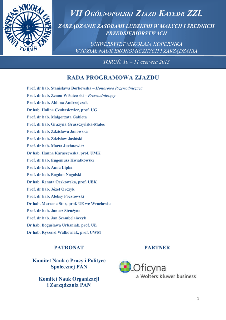 VII VII OGÓLNOPOLSKI ZJAZD KATEDR ZZL ZARZĄDZANIE ZASOBAMI LUDZKIMI W MAŁYCH I ŚREDNICH PRZEDSIĘBIORSTWACH UNIWERSYTET MIKOŁAJA KOPERNIKA WYDZIAŁ NAUK EKONOMICZNYCH I ZARZĄDZANIA TORUŃ, 10 – 11 czerwca 2013 RADA PROGRAMOWA ZJAZDU Prof. dr hab. Stanisława Borkowska – Honorowa Przewodnicząca Prof. dr hab. Zenon Wiśniewski – Przewodniczący Prof. dr hab. Aldona Andrzejczak Dr hab. Halina Czubasiewicz, prof. UG Prof. dr hab. Małgorzata Gableta Prof. dr hab. GraŜyna Gruszczyńska-Malec Prof. dr hab. Zdzisława Janowska Prof. dr hab. Zdzisław Jasiński Prof. dr hab. Marta Juchnowicz Dr hab. Hanna Karaszewska, prof. UMK Prof. dr hab. Eugeniusz Kwiatkowski Prof. dr hab. Anna Lipka Prof. dr hab. Bogdan Nogalski Dr hab. Renata Oczkowska, prof. UEK Prof. dr hab. Józef Orczyk Prof. dr hab. Aleksy Pocztowski Dr hab. Marzena Stor, prof. UE we Wrocławiu Prof. dr hab. Janusz StruŜyna Prof. dr hab. Jan Szambelańczyk Dr hab. Bogusława Urbaniak, prof. UŁ Dr hab. Ryszard Walkowiak, prof. UWM PATRONAT PARTNER Komitet Nauk o Pracy i Polityce Społecznej PAN Komitet Nauk Organizacji i Zarządzania PAN 1 PROGRAM 10 czerwca 2013 PONIEDZIAŁEK 10.00 – 13.00 Zakwaterowanie i rejestracja uczestników Zjazdu w Hotelu Filmar, ul. Grudziądzka 45 12.45 – 13.30 13.30 Obiad - Restauracja hotelowa (2 piętro) Odjazd autobusu sprzed hotelu na Wydział Nauk Ekonomicznych i Zarządzania UMK, ul. Gagarina 13A 14.00 – 14.15 OTWARCIE ZJAZDU – sala Rady Wydziału 14.15 – 17.00 SESJA PLENARNA Przewodniczący – Prof. dr hab. Józef Orczyk – UE Poznań 14.15 – 14.45 Prof. dr hab. Aleksy Pocztowski – UE Kraków Profesjonalizacja zarządzania zasobami ludzkimi w małych i średnich przedsiębiorstwach 14.45 – 15.15 Prof. dr hab. Stanisława Borkowska – IPiSS Warszawa Skuteczne strategie wynagrodzeń w małych i średnich przedsiębiorstwach 15.15 – 15.30 Przerwa kawowa 15.30 – 16.00 Prof. dr hab. Marta Juchnowicz – SGH Warszawa Troska o satysfakcję pracowników – nowy paradygmat czy pragmatyzm? 16.00 – 16.30 Dr hab. Richard Nicholls – University of Worcester Ageing consumers: consequences for Human Resources Management in small and medium enterprises 16.30 – 17.00 Prof. dr hab. Bogdan Nogalski – Uniwersytet Gdański i Członek Prezydium Centralnej Komisji do Spraw Stopni i Tytułów Habilitacja w naukach ekonomicznych w świetle nowych regulacji 17.10 Odjazd autobusu sprzed gmachu Wydziału do Hotelu Filmar 18.00 Obchody Jubileuszu 40-lecia pracy naukowej Prof. dra hab. Zenona Wiśniewskiego Hotel Filmar, Sala Kujawsko-Pomorska, ul. Grudziądzka 45 (parter) Laudacja – Prof. dr hab. Mirosław Szreder Prorektor Uniwersytetu Gdańskiego Wystąpienia i Ŝyczenia 19.30 Uroczysta kolacja z koncertem Bogdana Hołowni i Los Angeles TRIO 2 11 czerwca 2013 WTOREK 7.00 – 8.20 Śniadanie – Restauracja hotelowa (2 piętro) 8.30 Odjazd autobusu sprzed hotelu na Wydział Nauk Ekonomicznych i Zarządzania UMK, ul. Gagarina 13A 9.00 – 10.30 – sala III 9.00 – 10.30 – sala IV Panel I Uwarunkowania zarządzania zasobami pracy w MŚP Panel II Specyfika zarządzania zasobami ludzkimi w MŚP Moderatorzy: Aleksy Pocztowski, GraŜyna Gruszczyńska-Malec Moderatorzy: Janusz StruŜyna, Renata Oczkowska Paneliści: Paneliści: Aldona Andrzejczak, Rafał Marcin Borkowski, Marek Kunasz, Eugeniusz Kwiatkowski, Marzena Stor, Bogusława Urbaniak Urszula Bukowska, Marzena Cichorzewska, Katarzyna Gadomska-Lila, Justyna Kliombka-Jarzyna, Maciej Ławrynowicz, Grzegorz Łukaszewicz, Anna Rakowska, Jan Szambelańczyk, Marzena Syper-Jędrzejak, Anna Rakowska 10.30 – 10.45 Przerwa kawowa 10.45 – 12.15 – sala III 10.40 – 12.00 Panel III Zatrudnienie i zarządzanie wiekiem w MŚP Panel IV Strategie i metody zarządzania zasobami ludzkimi w MŚP Moderatorzy: Zenon Wiśniewski, Bogusława Urbaniak Moderatorzy: Zdzisława Janowska, Ryszard Walkowiak Paneliści: Paneliści: Anna Cierniak-Emerych, Agnieszka FurmańskaMaruszak, Danuta Langer-Babicz, Izabela Kołodziejczyk-Olczak, Jarosław Oczki, Przemysław Piasecki, Beata Radzka, Mariusz Zieliński Marzena Fryczyńska, Alena Iwanowa, Marcin Karwiński, Dorota Molek-Winiarska Grzegorz Myśliwiec, Joanna Samul, Sylwia Saczyńska-Sokół, Zofia Sekuła, Janusz StruŜyna 12.15 – 12.30 – sala IV Przerwa kawowa 3 12.30 – 13.30 – sala III 12.30 – 13.30 – sala IV Panel V Budowanie zaangaŜowania pracowników w MŚP Panel VI Wynagrodzenia w MŚP Moderatorzy: Małgorzata Gableta, Marta Juchnowicz Moderatorzy: Zdzisław Jasiński, Halina Czubasiewicz Paneliści: Paneliści: Krystyna Kmiotek, Dagmara Lewicka, Anna Lipka, Joanna Mesjasz, Sylwia Saczyńska-Sokół, Joanna Samul, Stanisław Waszczyk, Alicja Winnicka-Wejs Zdzisław Czajka, Hanna Karaszewska, Joanna NieŜurawska, Tomasz Sapeta, Sylwia Stachowska 13.30 – 14.30 Przerwa obiadowa 14.30 – 16.00 – sala III 14.30 – 16.00 – sala IV Panel VII Kompetencje pracowników i szkolenia w MŚP Panel VIII Dobre praktyki zzl w małych i średnich przedsiębiorstwach Moderatorzy: Anna Lipka, Aldona Andrzejczak Moderatorzy: Jan Szambelańczyk, Marzena Stor Paneliści: Paneliści: Piotr Górski, Łukasz Haromszeki, Renata Oczkowska, Łukasz Sienkiewicz, Marzena Staszkiewicz, Renata Trochimiuk Michał Bartoszewicz, Ewa Beck-Krala, Joanna Cewińska, Jerzy Krzyszkowski, Anna Rogozińska-Pawełczyk, Jolanta Szaban, Ryszard Walkowiak, Magdalena Wysocka 16.00 – 16.10 Przerwa kawowa 16.10 – 17.30 Podsumowanie paneli i zamknięcie Zjazdu – sala IV 17.30 Kolacja 4