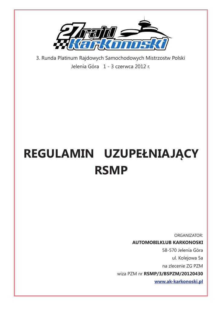 3. Runda Platinum Rajdowych Samochodowych Mistrzostw Polski Jelenia Góra 1 - 3 czerwca 2012 r. REGULAMIN UZUPEŁNIAJĄCY RSMP ORGANIZATOR: AUTOMOBILKLUB KARKONOSKI 58-570 Jelenia Góra ul. Kolejowa 5a na zlecenie ZG PZM wiza PZM nr RSMP/3/BSPZM/20120430 www.ak-karkonoski.pl 3. Runda RSMP 2012 Spis treści 1. WSTĘP .................................................................................................................................................... 3 2. ORGANIZACJA ..................................................................................................................................... 3 3. PROGRAM.............................................................................................................................................. 5 4. ZGŁOSZENIA ........................................................................................................................................ 8 5. UBEZPIECZENIE .................................................................................................................................12 6. REKLAMA I ZNAKOWANIE . ..........................................................................................................12 7. OPONY .................................................................................................................................................13 8. PALIWO ................................................................................................................................................13 9. ZAPOZNANIE Z TRASĄ ..................................................................................................................13 10. BADANIA ADMINISTRACYJNE ....................................................................................................14 2 12. INNE PROCEDURY ...........................................................................................................................16 RSMP 11. BADANIE KONTROLNE, PLOMBOWANIE I ZNAKOWANIE ...............................................15 13. IDENTYFIKACJA OSÓB OFICJALNYCH ....................................................................................18 14. NAGRODY ...........................................................................................................................................18 15. BADANIE KOŃCOWE I PROTESTY ..............................................................................................19 Załącznik Nr 1a - Harmonogram Etap 1 Załącznik Nr 1b - Harmonogram Etap 2 Załącznik Nr 2 - Harmonogram zapoznania z trasą rajdu Załącznik Nr 3 - Odpowiedzialny za kontakty z zawodnikami Załącznik Nr 4 - Rozmieszczenie numerów startowych i reklama 27 Rajd Karkonoski - Regulamin Uzupełniający RSMP 3. Runda RSMP 2012 1. WSTĘP 1.1 27 Rajd Karkonoski - 3. Runda Platinum Rajdowych Samochodowych Mistrzostw Polski 2012 zostanie przeprowadzony zgodnie z postanowieniami: •Międzynarodowego Kodeksu Sportowego na rok 2012 (wraz z załącznikami), •Regulaminu Sportowego Rajdowych Mistrzostw Regionalnych FIA na rok 2012 (wraz z załącznikami) , •Regulaminu Ramowego Rajdowych Samochodowych Mistrzostw Polski 2012 (wraz z załącznikami), •Ustawy „Prawo o Ruchu Drogowym RP”, •Niniejszego Regulaminu Uzupełniającego. Modyfikacje, zmiany i/lub uzupełnienie niniejszego Regulaminu Uzupełniającego będą wprowadzane wyłącznie w numerowanych i datowanych komunikatach ogłaszanych przez organizatora lub ZSS. 1.2 Nawierzchnia Asfalt Całkowita długość OS - 183,10 km 3 Całkowita długość trasy rajdu - 693,10 km RSMP 1.3 Całkowita długość OS i trasy 2. ORGANIZACJA 2.1 Nazwa zawodów PZM, do których zalicza się Rajd 3. Runda Platinum Rajdowych Samochodowych Mistrzostw Polski 2012 2.2 Numer wizy: nr RSMP/3/BSPZM/20120430 2.3 Nazwa organizatora, adres i dane Automobilklub Karkonoski 58-570 Jelenia Góra, ul. Kolejowa 5a tel./fax (075) 75 545 59 2.4 Komitet Organizacyjny Marek Kisiel Prezes Zarządu Automobilklubu Karkonoskiego Józef Kisiel V-ce Prezes ds. sportowych Mieczysław Drabik V-ce Prezes ds. BRD i Ochrony Środowiska Marzena Adamczuk Członek Zarządu Automobilklubu Karkonoskiego – Skarbnik Wiesław Tymiński Członek Zarządu Automobilklubu Karkonoskiego Piotr Kisiel Przewodniczący Komisji Rewizyjnej AK Karkonoskiego Witold Bieńkowski Członek Automobilklubu Karkonoskiego 27 Rajd Karkonoski - Regulamin Uzupełniający RSMP 3. Runda RSMP 2012 2.5 Zespół Sędziów Sportowych Przewodniczący Grzegorz Lewandowski Członek Marek Oziębło Członek Łukasz Biegus Sekretarz Alina Bieńkowska 2.6 Obserwatorzy i Delegaci Obserwator PZM Ryszard Krawczyk Delegat Techniczny PZM Marek Tymiński Delegat PZM ds. bezpieczeństwa Piotr Burdalski 2.7 Główne osoby oficjalne RSMP 4 Dyrektor Rajdu Marek Kisiel Wicedyrektor Sportowy Rajdu Józef Kisiel Wicedyrektor ds. Zabezpieczenia Rajdu Piotr Kisiel Wicedyrektor ds. Sędziów Wiesław Tymiński Wicedyrektor ds. Organizacyjnych Marcin Misiura Wicedyrektor ds. Publiczności Marzena Adamczuk Lekarz zawodów Stanisław Kozłowski Odpowiedzialny za kontakty z zawod. Marek Jaczewski 2.7.1 Kierownicy służb Kierownik Badania Kontrolnego Kontroler Techniczny PZM Dariusz Święs Dariusz Marciniak Asystent Kierownika Badania Kontrolnego Adam Skorupski Centrum Kontroli Rajdu Paweł Owczyński Kierownik Biura Rajdu Tomasz Krukowski Kierownik Biura Prasowego Michał Wojdan Kierownik ds. organizacyjnych Paweł Bańburski Pomiar czasu Ireneusz Miklaszewski Kierownik łączności Andrzej Buziewicz Komisja obliczeń Urszula Starzec Obliczenia komputerowe PZM Jerzy Głuśniewski Kierownik Start-Meta Rajdu Katarzyna Tymińska - Szybajło Kierownik Parku Serwisowego Wojciech Szczodrowski Kierownik Parku Zamkniętego Piotr Szybajło Kierownik ds. finansowych Paweł Bańburski 27 Rajd Karkonoski - Regulamin Uzupełniający RSMP 3. Runda RSMP 2012 2.8 Lokalizacja Biura Rajdu i dane Hotel „ARISTON” 58-535 Miłków 250 e-mail: [email