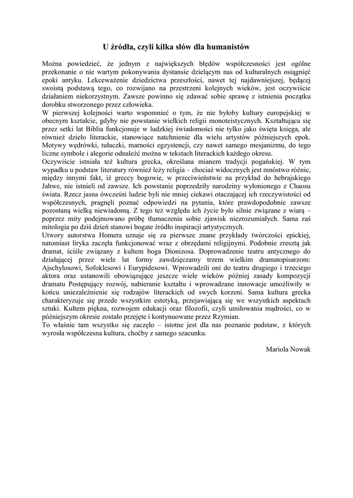 U źródła, czyli kilka słów dla humanistów Można powiedzieć, że jednym z największych błędów współczesności jest ogólne przekonanie o nie wartym pokonywania dystansie dzielącym nas od kulturalnych osiągnięć epoki antyku. Lekceważenie dziedzictwa przeszłości, nawet tej najdawniejszej, będącej swoistą podstawą tego, co rozwijano na przestrzeni kolejnych wieków, jest oczywiście działaniem niekorzystnym. Zawsze powinno się zdawać sobie sprawę z istnienia początku dorobku stworzonego przez człowieka. W pierwszej kolejności warto wspomnieć o tym, że nie byłoby kultury europejskiej w obecnym kształcie, gdyby nie powstanie wielkich religii monoteistycznych. Kształtująca się przez setki lat Biblia funkcjonuje w ludzkiej świadomości nie tylko jako święta księga, ale również dzieło literackie, stanowiące natchnienie dla wielu artystów późniejszych epok. Motywy wędrówki, tułaczki, marności egzystencji, czy nawet samego mesjanizmu, do tego liczne symbole i alegorie odnaleźć można w tekstach literackich każdego okresu. Oczywiście istniała też kultura grecka, określana mianem tradycji pogańskiej. W tym wypadku u podstaw literatury również leży religia – chociaż widocznych jest mnóstwo różnic, między innymi fakt, iż greccy bogowie, w przeciwieństwie na przykład do hebrajskiego Jahwe, nie istnieli od zawsze. Ich powstanie poprzedziły narodziny wyłonionego z Chaosu świata. Rzecz jasna ówcześni ludzie byli nie mniej ciekawi otaczającej ich rzeczywistości od współczesnych, pragnęli poznać odpowiedzi na pytania, które prawdopodobnie zawsze pozostaną wielką niewiadomą. Z tego też względu ich życie było silnie związane z wiarą – poprzez mity podejmowano próbę tłumaczenia sobie zjawisk niezrozumiałych. Sama zaś mitologia po dziś dzień stanowi bogate źródło inspiracji artystycznych. Utwory autorstwa Homera uznaje się za pierwsze znane przykłady twórczości epickiej, natomiast liryka zaczęła funkcjonować wraz z obrzędami religijnymi. Podobnie zresztą jak dramat, ściśle związany z kultem boga Dionizosa. Doprowadzenie teatru antycznego do działającej przez wiele lat formy zawdzięczamy trzem wielkim dramatopisarzom: Ajschylosowi, Sofoklesowi i Eurypidesowi. Wprowadzili oni do teatru drugiego i trzeciego aktora oraz ustanowili obowiązujące jeszcze wiele wieków później zasady kompozycji dramatu Postępujący rozwój, nabieranie kształtu i wprowadzane innowacje umożliwiły w końcu uniezależnienie się rodzajów literackich od swych korzeni. Sama kultura grecka charakteryzuje się przede wszystkim estetyką, przejawiającą się we wszystkich aspektach sztuki. Kultem piękna, rozwojem edukacji oraz filozofii, czyli umiłowania mądrości, co w późniejszym okresie zostało przejęte i kontynuowane przez Rzymian. To właśnie tam wszystko się zaczęło – istotne jest dla nas poznanie podstaw, z których wyrosła współczesna kultura, choćby z samego szacunku. Mariola Nowak