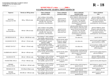 WOJEWÓDZKI INSPEKTORAT OCHRONY ROŚLIN I NASIENNICTWA WE WROCŁAWIU R – 18 Oddział w …………. KOMUNIKAT z dnia ………..2008 r. O ZAPRAWIANIU ZIARNA ZBÓŻ OZIMYCH Zaprawa Zakres działania pszenica ozima Zakres działania pszenżyto ozime 200 g + 900 ml wody śnieć cuchnąca, śnieć gładka, głownia pyląca, zgorzel siewek, pleśń śniegowa, pałecznica traw, (choroby liści: mączniak prawdziwy, rdza brunatna) zgorzel siewek, pleśń śniegowa, pałecznica traw BAYTAN Universal 094 FS 400 ml +200 ml wody śnieć cuchnąca, śnieć gładka, głownia pyląca, zgorzel siewek, pleśń śniegowa, pałecznica traw, (choroby liści: mączniak prawdziwy, rdza brunatna) zgorzel siewek, pleśń śniegowa, pałecznica traw DIVIDEND 030 FS 200 ml + 400-800 ml wody GALMANO 201 FS 450 ml + 150 ml wody JOCKEY 201 FS * 450 ml + 150 ml wody BAYTAN Universal 19,5 WS Dawka na 100 kg ziarna KARBOSAR K 400 FS * 300 ml + 600 ml wody MAXIM 025 FS 200 ml + 400 ml wody PANOCTINE 350 LS 170 ml + 400 ml wody PREMIS TOTAL 325 FS 150-200 ml + 400 ml wody PREMIS 025 FS 150-200ml+400ml wody PREMIS Universal 275 FS 100-200 ml + 400 ml wody śnieć karłowa1), śnieć cuchnąca, śnieć gładka, zgorzel siewek śnieć cuchnąca, zgorzel siewek, pleśń śniegowa, zgorzel podstawy źdźbła zgorzel podstawy źdźbła, zgorzel siewek, śnieć cuchnąca, śnieć gładka, głownia pyląca, pleśń śniegowa śnieć cuchnąca, śnieć gładka, zgorzel siewek, głownia pyląca, pleśń śniegowa pleśń śniegowa, śnieć cuchnąca, śnieć gładka, zgorzel siewek pleśń śniegowa, śnieć cuchnąca, śnieć gładka, zgorzel siewek pleśń śniegowa, śnieć cuchnąca, śnieć gładka, zgorzel siewek, głownia pyląca głownia pyląca, śnieć cuchnąca, śnieć gładka, zgorzel siewek śnieć cuchnąca, głownia pyląca śnieć gładka, zgorzel siewek Zakres działania jęczmień ozimy głownia pyląca, głownia zwarta, pleśń śniegowa, pałecznica traw, zgorzel siewek pasiastość liści, (choroby liści: mączniak prawdziwy, rdza karłowa, rynchosporioza, plamistość siatkowa) głownia pyląca, głownia zwarta, pleśń śniegowa, pałecznica traw, zgorzel siewek, pasiastość liści (choroby liści: mączniak prawdziwy, rdza karłowa, rynchosporioza, plamistość siatkowa) Zakres działania żyto głownia źdźbłowa, pleśń śniegowa, pałecznica traw, zgorzel siewek, (choroby liści: mączniak prawdziwy, rynchosporioza, rdza brunatna) głownia źdźbłowa, pleśń śniegowa, pałecznica traw, zgorzel siewek, (choroby liści: mączniak prawdziwy, rynchosporioza, rdza brunatna) zgorzel siewek nie zaleca się zgorzel siewek zgorzel siewek, pleśń śniegowa, zgorzel podstawy źdźbła nie zaleca się zgorzel siewek, pleśń śniegowa, zgorzel podstawy źdźbła zgorzel podstawy źdźbła, zgorzel siewek, pleśń śniegowa nie zaleca się zgorzel podstawy źdźbła, zgorzel siewek, głownia źdźbłowa, pleśń śniegowa zgorzel siewek, pleśń śniegowa głownia pyląca, rynchosporioza, pasiastość liści, zgorzel siewek, pleśń śniegowa, plamistość siatkowa zgorzel siewek, pleśń śniegowa, głownia źdźbłowa zgorzel siewek, pleśń śniegowa nie zaleca się głownia źdźbłowa, pleśń śniegowa, zgorzel siewek zgorzel siewek, pleśń śniegowa nie zaleca się zgorzel siewek, pleśń śniegowa głownia pyląca, pleśń śniegowa, zgorzel siewek pleśń śniegowa, zgorzel siewek, głownia źdźbłowa głownia zwarta, głownia pyląca, zgorzel siewek rynchosporioza, głownia pyląca, pasiastość liści, głownia zwarta, zgorzel siewek zgorzel siewek, głownia źdźbłowa zgorzel siewek zgorzel siewek zgorzel siewek, pleśń śniegowa zgorzel siewek, głownia źdźbłowa RAXIL GEL 206 500 ml RAXIL 02 DS 150g SARFUN T 65 DS * 200g lub 200g+ 800ml wody SARFUN T 450 FS * 250 ml + 500 ml wody SAROX T 500 FS 300 ml + 700ml wody TRIBENOKS 330 FS 200 ml + 400 ml wody VINCIT 050 FS 200 ml + 400 ml wody VITAVAX 200 FS 5) 300-350 ml + 300-350 ml wody pleśń śniegowa, śnieć cuchnąca, śnieć gładka, głownia pyląca, zgorzel siewek śnieć cuchnąca, śnieć gładka, zgorzel siewek, głownia pyląca pleśń śniegowa, śnieć cuchnąca, śnieć gładka, zgorzel siewek pleśń śniegowa, śnieć cuchnąca, śnieć gładka, zgorzel siewek, śnieć karłowa 2) pleśń śniegowa, śnieć cuchnąca, głownia pyląca, zgorzel siewek, śnieć gładka, śnieć cuchnąca, śnieć gładka, zgorzel siewek, głownia pyląca, pleśń śniegowa, śnieć karłowa 3) pleśń śniegowa, śnieć cuchnąca, śnieć gładka, zgorzel siewek, głownia pyląca, śnieć karłowa 4) śnieć cuchnąca, śnieć gładka, zgorzel siewek, głownia pyląca, pleśń śniegowa pleśń śniegowa, zgorzel siewek zgorzel siewek, pleśń śniegowa, zgorzel siewek, głownia zwarta, głownia pyląca głownia pyląca, głownia zwarta, zgorzel siewek, pleśń śniegowa, głownia źdźbłowa, zgorzel siewek zgorzel siewek, głownia źdźbłowa zgorzel siewek, pleśń śniegowa zgorzel siewek, pleśń śniegowa pleśń śniegowa, zgorzel siewek, głownia źdźbłowa żyta pleśń śniegowa, zgorzel siewek pleśń śniegowa, zgorzel siewek pleśń śniegowa, zgorzel siewek, głownia źdźbłowa żyta zgorzel siewek, pleśń śniegowa zgorzel siewek, pleśń śniegowa zgorzel siewek, pleśń śniegowa zgorzel siewek, pleśń śniegowa głownia pyląca, głownia zwarta, pleśń śniegowa, zgorzel siewek, pasiastość liści głownia pyląca, rynchosporioza, pasiastość liści, plamistość siatkowa, zgorzel siewek, głownia zwarta, pleśń śniegowa pleśń śniegowa głownia pyląca, zgorzel siewek pasiastość liści, rynchosporioza głownia pyląca, głownia zwarta, pasiastość liści, zgorzel siewek, pleśń śniegowa pleśń śniegowa, zgorzel siewek, głownia źdźbłowa zgorzel siewek, pleśń śniegowa głownia źdźbłowa zgorzel siewek, pleśń śniegowa głownia źdźbłowa zgorzel siewek, pleśń śniegowa głownia źdźbłowa 30