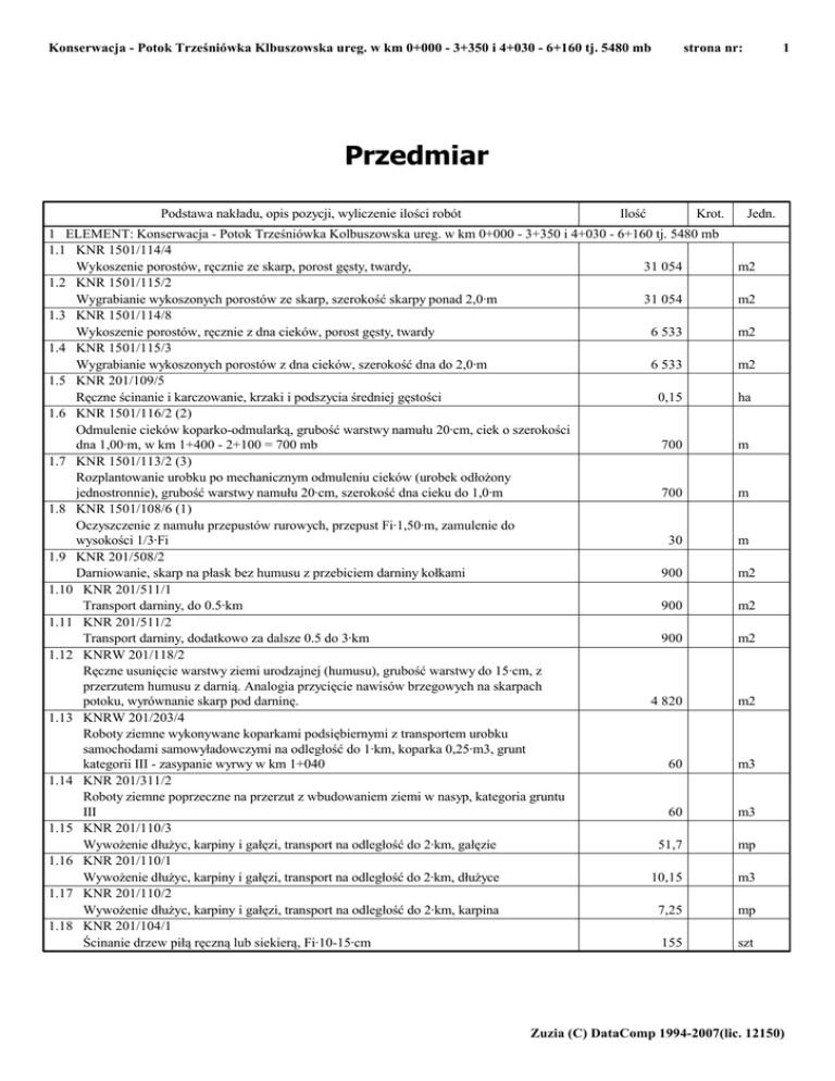 Konserwacja - Potok Trześniówka Klbuszowska ureg. w km 0+000 - 3+350 i 4+030 - 6+160 tj. 5480 mb strona nr: 1 Przedmiar Podstawa nakładu, opis pozycji, wyliczenie ilości robót Ilość Krot. 1 ELEMENT: Konserwacja - Potok Trześniówka Kolbuszowska ureg. w km 0+000 - 3+350 i 4+030 - 6+160 tj. 5480 mb 1.1 KNR 1501/114/4 Wykoszenie porostów, ręcznie ze skarp, porost gęsty, twardy, 31 054 1.2 KNR 1501/115/2 Wygrabianie wykoszonych porostów ze skarp, szerokość skarpy ponad 2,0·m 31 054 1.3 KNR 1501/114/8 Wykoszenie porostów, ręcznie z dna cieków, porost gęsty, twardy 6 533 1.4 KNR 1501/115/3 Wygrabianie wykoszonych porostów z dna cieków, szerokość dna do 2,0·m 6 533 1.5 KNR 201/109/5 Ręczne ścinanie i karczowanie, krzaki i podszycia średniej gęstości 0,15 1.6 KNR 1501/116/2 (2) Odmulenie cieków koparko-odmularką, grubość warstwy namułu 20·cm, ciek o szerokości dna 1,00·m, w km 1+400 - 2+100 = 700 mb 700 1.7 KNR 1501/113/2 (3) Rozplantowanie urobku po mechanicznym odmuleniu cieków (urobek odłożony jednostronnie), grubość warstwy namułu 20·cm, szerokość dna cieku do 1,0·m 700 1.8 KNR 1501/108/6 (1) Oczyszczenie z namułu przepustów rurowych, przepust Fi·1,50·m, zamulenie do wysokości 1/3·Fi 30 1.9 KNR 201/508/2 Darniowanie, skarp na płask bez humusu z przebiciem darniny kołkami 900 1.10 KNR 201/511/1 Transport darniny, do 0.5·km 900 1.11 KNR 201/511/2 Transport darniny, dodatkowo za dalsze 0.5 do 3·km 900 1.12 KNRW 201/118/2 Ręczne usunięcie warstwy ziemi urodzajnej (humusu), grubość warstwy do 15·cm, z przerzutem humusu z darnią. Analogia przycięcie nawisów brzegowych na skarpach potoku, wyrównanie skarp pod darninę. 4 820 1.13 KNRW 201/203/4 Roboty ziemne wykonywane koparkami podsiębiernymi z transportem urobku samochodami samowyładowczymi na odległość do 1·km, koparka 0,25·m3, grunt kategorii III - zasypanie wyrwy w km 1+040 60 1.14 KNR 201/311/2 Roboty ziemne poprzeczne na przerzut z wbudowaniem ziemi w nasyp, kategoria gruntu III 60 1.15 KNR 201/110/3 Wywożenie dłużyc, karpiny i gałęzi, transport na odległość do 2·km, gałęzie 51,7 1.16 KNR 201/110/1 Wywożenie dłużyc, karpiny i gałęzi, transport na odległość do 2·km, dłużyce 10,15 1.17 KNR 201/110/2 Wywożenie dłużyc, karpiny i gałęzi, transport na odległość do 2·km, karpina 7,25 1.18 KNR 201/104/1 Ścinanie drzew piłą ręczną lub siekierą, Fi·10-15·cm 155 Jedn. m2 m2 m2 m2 ha m m m m2 m2 m2 m2 m3 m3 mp m3 mp szt Zuzia (C) DataComp 1994-2007(lic. 12150)