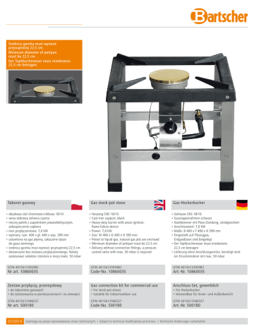 Średnica garnka musi wynosić przynajmniej 22,5 cm. Minimum diameter of pot/pan must be 22,5 cm. Der Topfdurchmesser muss mindestens 22,5 cm betragen. Taboret gazowy • obudowa stal chromowo-niklowa 18/10 • rama żebrowa żeliwna czarna • mocny palnik z zapalnikiem piezoelektrycznym, zabezpieczenie zapłonu • moc przyłączeniowa: 7,0 kW • wymiary: szer. 400 x gł. 400 x wys. 390 mm • ustawiona na gaz płynny, załączone dysze do gazu ziemnego • średnica garnka musi wynosić przynajmniej 22,5 cm • dostarczane bez zestawu przyłączeniowego. Należy zastosować reduktor ciśnienia o mocy maks. 50 mbar Gas stock-pot stove • Housing CNS 18/10 • Cast-iron support, black • Heavy-duty burner with piezo ignition, flame failure device • Power: 7,0 kW • Size: W 400 x D 400 x H 390 mm • Preset to liquid gas, natural gas jets are enclosed • Minimum diameter of pot/pan must be 22,5 cm • Delivery without connection fittings, a pressure control valve with max. 50 mbar is required Gas-Hockerkocher • Gehäuse CNS 18/10 • Gussrippenrahmen schwarz • Starkbrenner mit Piezo-Zündung, zündgesichert • Anschlusswert: 7,0 kW • Maße: B 400 x T 400 x H 390 mm • Eingestellt auf Flüssiggas, Erdgasdüsen sind beigelegt • Der Topfdurchmesser muss mindestens 22,5 cm betragen • Lieferung ohne Anschlussgarnitur, benötigt wird ein Druckminderer mit max. 50 mbar GTIN 4015613395982 GTIN 4015613395982 GTIN 4015613395982 Zestaw przyłączy, przemysłowy Gas connection kit for commercial use Anschluss-Set, gewerblich • do taboretów gazowych • do zastosowania w pomieszczeniach i na zewnątrz • For stock-pot stoves • Suitable for indoor/outdoor use • Für Hockerkocher • Verwendbar für Innen- und Außenbereich GTIN 4015613586557 GTIN 4015613586557 GTIN 4015613586557 Nr art. 1086003S Nr art. 500180 07/2014 Code-No. 1086003S Code-No. 500180 Art.-Nr. 1086003S Art.-Nr. 500180 Zastrzega się prawo wprowadzania zmian technicznych. • Subject to technical modifications and errors. • Technische Änderungen vorbehalten.