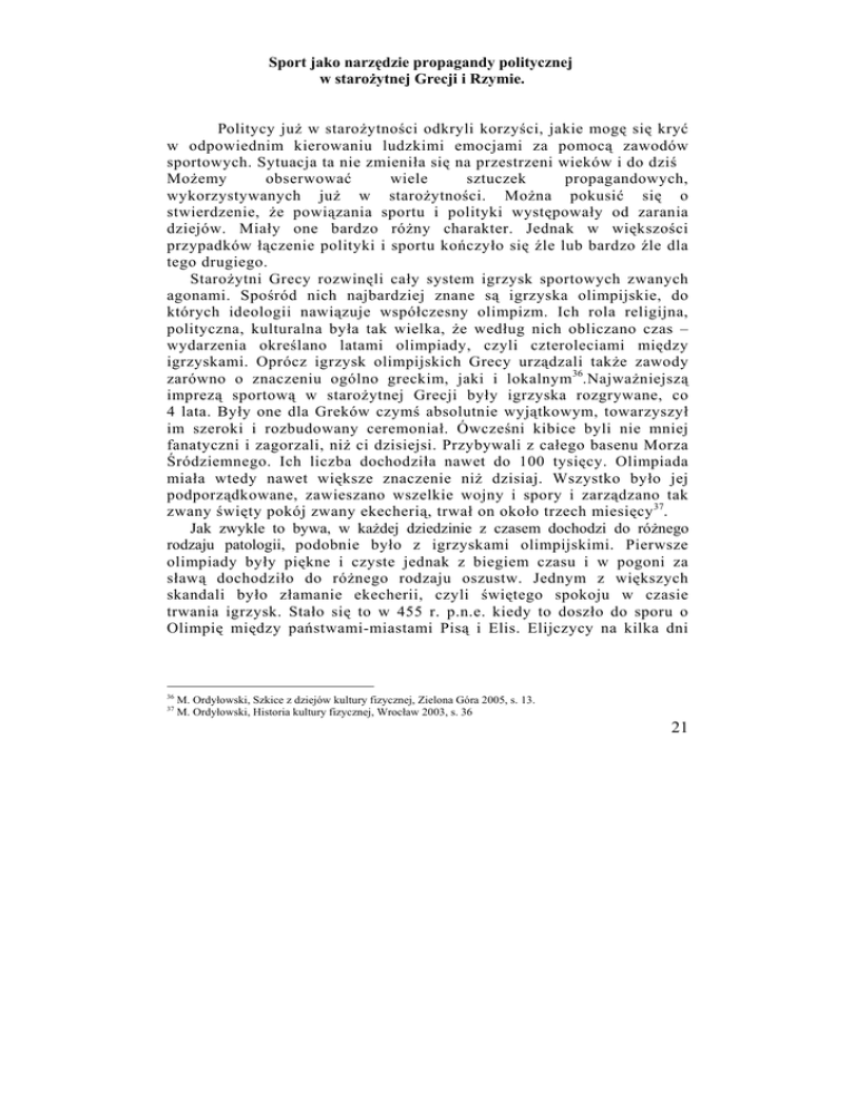 Sport jako narzędzie propagandy politycznej w starożytnej Grecji i Rzymie. Politycy już w starożytności odkryli korzyści, jakie mogę się kryć w odpowiednim kierowaniu ludzkimi emocjami za pomocą zawodów sportowych. Sytuacja ta nie zmieniła się na przestrzeni wieków i do dziś Możemy obserwować wiele sztuczek propagandowych, wykorzystywanych już w starożytności. Można pokusić się o stwierdzenie, że powiązania sportu i polityki występowały od zarania dziejów. Miały one bardzo różny charakter. Jednak w większości przypadków łączenie polityki i sportu kończyło się źle lub bardzo źle dla tego drugiego. Starożytni Grecy rozwinęli cały system igrzysk sportowych zwanych agonami. Spośród nich najbardziej znane są igrzyska olimpijskie, do których ideologii nawiązuje współczesny olimpizm. Ich rola religijna, polityczna, kulturalna była tak wielka, że według nich obliczano czas – wydarzenia określano latami olimpiady, czyli czteroleciami między igrzyskami. Oprócz igrzysk olimpijskich Grecy urządzali także zawody zarówno o znaczeniu ogólno greckim, jaki i lokalnym 36.Najważniejszą imprezą sportową w starożytnej Grecji były igrzyska rozgrywane, co 4 lata. Były one dla Greków czymś absolutnie wyjątkowym, towarzyszył im szeroki i rozbudowany ceremoniał. Ówcześni kibice byli nie mniej fanatyczni i zagorzali, niż ci dzisiejsi. Przybywali z całego basenu Morza Śródziemnego. Ich liczba dochodziła nawet do 100 tysięcy. Olimpiada miała wtedy nawet większe znaczenie niż dzisiaj. Wszystko było jej podporządkowane, zawieszano wszelkie wojny i spory i zarządzano tak zwany święty pokój zwany ekecherią, trwał on około trzech miesięcy 37. Jak zwykle to bywa, w każdej dziedzinie z czasem dochodzi do różnego rodzaju patologii, podobnie było z igrzyskami olimpijskimi. Pierwsze olimpiady były piękne i czyste jednak z biegiem czasu i w pogoni za sławą dochodziło do różnego rodzaju oszustw. Jednym z większych skandali było złamanie ekecherii, czyli świętego spokoju w czasie trwania igrzysk. Stało się to w 455 r. p.n.e. kiedy to doszło do sporu o Olimpię między państwami-miastami Pisą i Elis. Elijczycy na kilka dni 36 37 M. Ordyłowski, Szkice z dziejów kultury fizycznej, Zielona Góra 2005, s. 13. M. Ordyłowski, Historia kultury fizycznej, Wrocław 2003, s. 36 21 przed rozpoczęciem olimpiady zaatakowali i odzyskali Olimpię, a następnie urządzili igrzyska 38. Spotkało się to z falą ostracyzmu ze strony innych państw greckich jednak na zawsze położyło się cieniem na historii tej wielkiej imprezy sportowej. Trudno nie doszukiwać się w tym wydarzeniu pewnych analogii z wydarzeniami nowożytnej historii sportu. Olimpia to było dla Greków święte miejsce mimo tego Elijczycy dokonali najazdu tuż przed olimpiadą i co więcej samemu zorganizowali igrzyska. Nie ma konkretnego przekazu, który tłumaczyłby przyczyny tej napaści, ale biorąc pod uwagę jej czas i miejsce, nie sposób nie snuć domysłów o jej związku ze sportem i polityką, a co za tym idzie propagandą. W pewnym sensie idea starożytnych igrzysk była piękna, rywalizacja toczyła się tylko i wyłącznie o wieniec laurowy, niektórzy ludzie nie mogli tego zrozumieć, ale dla prawdziwych sportowców bezcenne było samo zwycięstwo, a walory materialne nie miały znaczenia. Jednak i ten stan nie trwał zbyt długo, co prawda nie wprowadzono dodatkowych nagród, ale zwycięzcy zdobywali wieczną chwałę, a w swoich miastach byli traktowani jak półbogowie. Stawiano im pomniki, pisano na ich cześć pieśni. Po powrocie z zawodów organizowano im triumfalne wjazdy do miasta, zapraszano na uczty, przyznawano honorowe miejsca w teatrach, zwalniano z podatków 39. W związku z powyższym olimpionicy, dzięki zwycięstwu uzyskiwali wymierne profity, a ich państwa-miasta podnosiły swój prestiż. Jak się można domyślać skrzętnie to wykorzystywały na arenie polityki zagranicznej, gdyż to była ich szansa na wyjście z cienia lub potwierdzenie swojej potęgi. Zawodnicy byli w stanie poświęcić wszystko tylko po to, aby odnieść upragniony sukces, wielu z nich przypłaciło to nawet życiem. Marketing sportowy i reklama narodziły się właśnie w starożytnej Grecji w czasie igrzysk. Wraz z kultem olimpioników do sportu wkroczyły pieniądze. Jak każdy zapewne wie, że tam gdzie zaczyna się gra o pieniądze, kończą się ideały. Przyjazd na olimpiadę 50 tys. kibiców był wielkim wydarzeniem handlowym i turystycznym, na którym zarabiano krocie. Powstał nawet swoisty „przemysł olimpijski” oferujący bogatą gamę produktów, od artykułów spożywczych przez pamiątki po dzieła sztuki. Za napisanie ody na cześć zwycięzcy poeta Pindar otrzymał 3000 drachm. Była to równowartość trzech powozów z zaprzęgiem 40. Z całą pewnością obraz 38 B. Kunicki, Kultura fizyczna antycznej Grecji (ideologia, filozofia, kultura), http://www.wbc.poznan.pl/Content/1490/M-317.html J. Besala, Świętość ze skazą, „Focus” 5/2006, s. 63. 40 Tamże. 39 22 igrzysk olimpijskich w starożytnej Grecji jest wyidealizowany. Warto odnotować takie patologie jak kupowanie meczów, przykładem może być Eupolos z Tesalii, który przekupił trzech bokserów, żeby pozwolili mu wygrać. Korupcja z czasem zataczała coraz szersze kręgi. Jeszcze ciekawsza historia to przekupywanie sportowców przez bogate miasta, które w ten sposób zyskiwały przez swego rodzaju efekt propagandowy. Jednym z wielu przykładów jest Astilos z Krotonu, który po wygranym biegu, przedstawił się jako obywatel Syrakuazu. Sytuacja ta łudząco przypomina czasy współczesne, gdzie bogate kraje arabskie „kupują” zawodników z biednych państw afrykańskich. Również doping nie był obcy ówczesnym sportowcom, stosowano odpowiednią dietę, zażywano grzybki halucynogenne, pito wywary z ziół itd. Jak łatwo dostrzec starożytne igrzyska pa