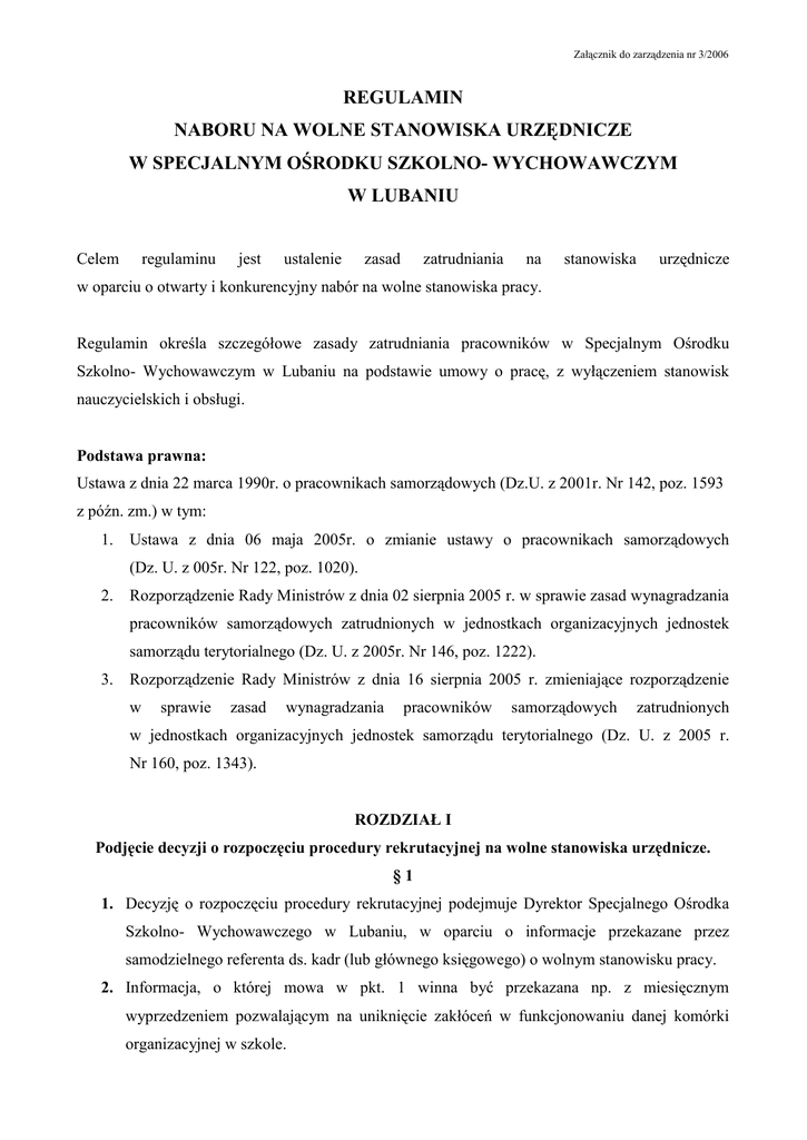 Załącznik do zarządzenia nr 3/2006 REGULAMIN NABORU NA WOLNE STANOWISKA URZĘDNICZE W SPECJALNYM OŚRODKU SZKOLNO- WYCHOWAWCZYM W LUBANIU Celem regulaminu jest ustalenie zasad zatrudniania na stanowiska urzędnicze w oparciu o otwarty i konkurencyjny nabór na wolne stanowiska pracy. Regulamin określa szczegółowe zasady zatrudniania pracowników w Specjalnym Ośrodku Szkolno- Wychowawczym w Lubaniu na podstawie umowy o pracę, z wyłączeniem stanowisk nauczycielskich i obsługi. Podstawa prawna: Ustawa z dnia 22 marca 1990r. o pracownikach samorządowych (Dz.U. z 2001r. Nr 142, poz. 1593 z późn. zm.) w tym: 1. Ustawa z dnia 06 maja 2005r. o zmianie ustawy o pracownikach samorządowych (Dz. U. z 005r. Nr 122, poz. 1020). 2. Rozporządzenie Rady Ministrów z dnia 02 sierpnia 2005 r. w sprawie zasad wynagradzania pracowników samorządowych zatrudnionych w jednostkach organizacyjnych jednostek samorządu terytorialnego (Dz. U. z 2005r. Nr 146, poz. 1222). 3. Rozporządzenie Rady Ministrów z dnia 16 sierpnia 2005 r. zmieniające rozporządzenie w sprawie zasad wynagradzania pracowników samorządowych zatrudnionych w jednostkach organizacyjnych jednostek samorządu terytorialnego (Dz. U. z 2005 r. Nr 160, poz. 1343). ROZDZIAŁ I Podjęcie decyzji o rozpoczęciu procedury rekrutacyjnej na wolne stanowiska urzędnicze. §1 1. Decyzję o rozpoczęciu procedury rekrutacyjnej podejmuje Dyrektor Specjalnego Ośrodka Szkolno- Wychowawczego w Lubaniu, w oparciu o informacje przekazane przez samodzielnego referenta ds. kadr (lub głównego księgowego) o wolnym stanowisku pracy. 2. Informacja, o której mowa w pkt. 1 winna być przekazana np. z miesięcznym wyprzedzeniem pozwalającym na uniknięcie zakłóceń w funkcjonowaniu danej komórki organizacyjnej w szkole. 3. Informacja powinna zawierać w skrócie wymagania w zakresie kwalifikacji, umiejętności i predyspozycji osób, które będą ubiegać się o zatrudnienie oraz zakres obowiązków i odpowiedzialność związaną ze stanowiskiem pracy. 4. Zgoda Dyrektora szkoły powoduje rozpoczęcie procedury naboru kandydatów na wolne stanowisko urzędnicze. ROZDZIAŁ II Powołanie komisji Rekrutacyjnej §2 1. Komisję rekrutacyjną powołuje Dyrektor Specjalnego Ośrodka Szkolno- Wychowawczego w Lubaniu. 2. W skład komisji Rekrutacyjnej mogą wchodzić: a) Dyrektor szkoły lub osoba przez niego upoważniona, b) Kierownik komórki organizacyjnej (np. główny księgowy, kierownik administracyjno – gospodarczy), c) Samodzielny referent ds. kadr, będący jednocześnie Sekretarzem Komisji. ROZDZIAŁ III Etapy naboru §3 1. Ogłoszenie o naborze na wolne stanowisko urzędnicze. 2. Składanie dokumentów. 3. Wstępna weryfikacja kandydatów – analiza dokumentów. 4. Ogłoszenie listy kandydatów, którzy spełniają wymagania formalne. 5. Weryfikacja końcowa kandydatów: a) test kwalifikacyjny, b) rozmowa kwalifikacyjna. 6. Sporządzenie protokołu z przeprowadzonego naboru na wolne stanowisko urzędnicze. 7. Podjęcie decyzji o zatrudnieniu i podpisanie umowy o pracę. 8. Ogłoszenie wyników naboru. ROZDZIAŁ IV Ogłoszenie o naborze na wolne stanowisko urzędnicze §4 1. Ogłoszenie o wolnym stanowisku urzędniczym umieszcza się w Biuletynie Informacji Publicznej (na stronie internetowej ośrodka) oraz na tablicy informacyjnej ośrodka. 2. Możliwe jest także podanie do publicznej wiadomości m. in.: 2 a) w prasie, b) w urzędach pracy, c) telewizji lokalnej. 3. Ogłoszenie o naborze na wolne stanowisko zawiera: a) nazwę i adres jednostki, b) określenie stanowiska urzędniczego, c) określenie wymagań związanych ze stanowiskiem urzędniczym zgodnie z opisem danego stanowiska, ze wskazaniem, które z nich są niezbędne, a które dodatkowe, d) wskazanie wymaganych dokumentów, e) określenie terminu i miejsca składania dokumentów. 4. Ogłoszenie będzie znajdowało się w BIP oraz na tablicy ogłoszeń przez 14 dni kalendarzowych. 5. Przykład ogłoszenia stanowi załącznik Nr 1 do niniejszego regulaminu. ROZDZIAŁ V Przyjmowanie dokumentów §5 1. Po ogłoszeniu umieszczonym w BIP i na tablicy ogłoszeń następuje przyjmowanie dokumentów od kandydatów zainteresowanych praca na wolnym stanowisku urzędniczym w szkole. 2. Na dokumenty składają się: a) list motywacyjny, b) życiorys – curriculum vitae, c) kserokopie świadectw pracy, d) kserokopie dyplomów potwierdzających wykształcenie, e) kserokopie zaświadczeń o ukończonych kursach, szkoleniach, f) referencje. 3. Dokumenty składane przez osoby ubiegające się o zatrudnienie mogą być przyjmowane tylko po umieszczeniu ogłoszenia o organizowanym naborze na wolne stanowisko urzędnicze i tylko w formie pisemnej. 4. Wyłącza się możliwość przyjmowania dokumentów poza ogłoszeniem. ROZDZIAŁ VI §6 1. Analizy dokumentów dokonuje Komisja Rekrutacyjna. 2. Analiza dokumentów polega na zapoznaniu się przez Komisję z dokumentami złożonymi przez kandydatów. 3 3. Celem analizy dokumentów jest porównanie danych, w nich zawartych z wymaganiami formalnymi określonymi w ogłoszeniu. 4. Wynikiem analizy dokumentów jest wstępne określenie możliwości zatrudnienia kandydata do pracy na wolnym stanowisku urzędniczym. ROZDZIAŁ VII Ogłoszenie listy kandydatów, spełniających wymagania formalne §7 1. Po upływie terminu do złożenia dokumentów, określonego w ogłoszeniu o naborze i wstępnej weryfikacji umieszcza się w BIP listę kandydatów, którzy spełniają wymagania formalne określone w ogłoszeniu. 2. Lista, o której mowa w pkt. 1, zawiera imiona i nazwiska kandydatów oraz ich miejsca zamieszkania w rozumieniu przepisów Kodeksu Cywilnego. 3. Lista kandydatów spełniających wymagania formalne będzie umieszczona w BIP do momentu ogłoszenia ostatecznych wyników naboru. 4. Informacje o kandydatach, którzy zgłosili się do naboru, stanowią informacje publiczną w zakresie objętym wymaganiami związanymi ze stanowiskiem urzędniczym, ok