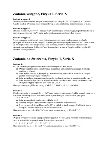 Zadania wstępne, Fizyka I, Seria X Zadanie wstępne 1 Detektory w laboratorium zarejestrowały cząstkę o energii 1,25 GeV i pędzie 0,75 GeV/c. Jaka to cząstka. Oblicz jej masę spoczynkową. Z jaką prędkością porusza się ona w LAB. Zadanie wstępne 2 Elektron o masie 0,5 MeV/c2 i energii 4GeV zderza się ze spoczywającym protonem tarczy o energii spoczynkowej 1GeV. Jaką maksymalną energię może uzyskać proton. Zadanie wstępne 3 Przeprowadzono spektrometryczne badania promieniowania pochodzącego z odległej galaktyki. Linię widmowa o długości fali (zarejestrowanej w spektrometrze) λ=730nm udało się zidentyfikować jako linię wodoru serii Balmera, która w warunkach laboratorium ziemskiego ma długość fali λ0=487nm. Korzystając z wzorów Dopplera oblicz prędkość i kierunek ruchu galaktyki. Zadania na ćwiczenia, Fizyka I, Seria X Zadanie 1. W LHC zderzają się przeciwbieżne wiązki o energiach 7 TeV każda. a) Oblicz współczynniki transformacji Lorentza z układu laboratoryjnego do układu protonu w wiązce. b) Jaka będzie energia mijających go protonów drugiej wiązki w układzie w którym proton pierwszej wiązki spoczywa? c) Jaka jest całkowita energia dostępna dla produkcji cząstek w układzie środka masy? d) Jaka musiałaby być energia wiązki protonów padających na tarczę stacjonarną, aby energia dostępna wynosiła tyle samo co LHC? Masa protonu w przybliżeniu to m p = 1GeV / c 2 , 1TeV = 1012 eV = 10 3 GeV . Zadanie 2. Wiązka mezonów π o energii Eπ = 1GeV pada na tarczę protonową (ciekły wodór). Jednym z procesów zachodzących w zderzeniu pionu z protonem jest rozproszenie sprężyste π + p →π + p a) Jaka jest prędkość środka masy układu π+p? b) Jakie są energie i pędy obydwu cząstek w układzie środka masy? c) Pion rozproszył się pod kątem θ = 90 o w układzie środka masy.; Pod jakim katem nastąpiło rozproszenie w układzie laboratorium? Masa mezonu π, mπ = 0,14GeV / c 2 , zaś masa protonu to m p = 0,94GeV / c 2 . Zadanie 3. Wiązka protonów pada na tarczę protonową (ciekły wodór). Jaka powinna być minimalna energia wiązki aby wyprodukować 5 mezonów π w reakcji: p + p → p + p +π + +π + +π − +π − +π 0 Masy mezonów π, mπ = 0,14GeV / c 2 , zaś masa protonu to m p = 0,94GeV / c 2 . Zadanie 4. Cząstki elementarne, rozpady cząstek w spoczynku i w locie Rozpad kaonu. Mezon K s0 o masie mK=500 (498)MeV/c2 i energii E=833 MeV, rozpada się na dwa piony których masy spoczynkowe to mπ=140 MeV/c2. Wyznacz maksymalna i minimalną energię pionu, która może zostać zmierzona w układzie laboratoryjnym. Jaki kąt zostanie zmierzony między pionami w układzie laboratoryjnym, jeśli w układzie własnym kaonu piony będą emitowane prostopadle do kierunku ruchu? (ew. dla Fizyki) Zadanie 5. Rozpad pionu. Pion o masie mπ =140 MeV/c2 poruszajacy się z energia kinetyczną Ek=35 MeV rozpada się na dwa fotony. Wyznacz maksymalną i minimalną energię fotonu, która może zostać zmierzona w układzie laboratoryjnym. Jaki kąt zostanie zmierzony w układzie laboratoryjnym, jeśli w układzie własnym pionu fotony zostały wyemitowane prostopadle do kierunku ruchu? Zadanie 6. Rakieta lecąca w kierunku Ziemi z prędkością v=0,6c emituje sygnały laserowe. Emitowane fotony mają energię 0,6eV (to podczerwień). Jaką energię zmierzy obserwator na Ziemi? Jak szybko musiałaby lecieć rakieta, żeby fotony obserwowane były jako widzialne (E>1,8eV)? Zadanie 7. Przeprowadzono spektrometryczne badania promieniowania pochodzącego z odległej galaktyki. Linię widmowa o długości fali (zarejestrowanej w spektrometrze) λ=730nm udało się zidentyfikować jako linię wodoru serii Balmera, która w warunkach laboratorium ziemskiego ma długość fali λ0=487nm. Korzystając z wzorów transformacji energii oblicz prędkość i kierunek ruchu galaktyki. Zadanie 8. Obserwacje wskazują, że Wszechświat rozszerza się jednorodnie i nie posiada wyróżnionego punktu. Dla odpowiednio dużych skal w porównaniu z rozmiarami Galaktyki spełniona jest zależność (prawo Hubble’a): v = H 0 r , gdzie: v - prędkość oddalania się obiektu (źródła promieniowania(galaktyki)) od Ziemi, r - odległość do źródła, H0 - stała Hubble’a. λ a) W jaki sposób stosunek λ zależy od odległości źródła od Ziemi (r), przy spełnieniu 0 λ prawa Hubble’a. Oblicz Stałą Hubble’a jako funkcję r i λ . 0 b) W jaki sposób wielkość zdefiniowana jako przesunięcie ku czerwieni (redshift) λ − λ0 ∆λ z= = λ λ zależy od odległości źródła od Ziemi (r), przy spełnieniu prawa 0 0 Hubble’a. c) Policz stałą Hubble’a dla d) Galaktyka w gwiazdozbiorze Panny r1=17Mpc, z1=0,004 e) Galaktyka w Wielkiej Niedźwiedzicy r2=180 Mpc, z2=0,051 Zadanie 9. W procesie Comptona fotony lasera rubinowego (λ=694,3nm) rozpraszają się na swobodnych elektronach, a długość fali zależy jedynie od kąta rozproszenia θ i tzw. h comptonowskiej długości fali elektronu λc = = 2,4 ⋅ 10 −3 nm = 2,4 ⋅ 10 3 fm . Policz długość me c fali wiązki rozproszonej i porównaj wynik z rozproszeniem anihilacyjnych fotonów γ o energii 511 keV. Zadanie 10. „Akcelerator fotonów” – odwrotne rozpraszanie Comptona W procesie Comptona fotony UV padają na spoczywające elektrony i rozpraszają się, a długość fali zależy jedynie od kąta rozproszenia θ: h (1 − cos θ ) = λc (1 − cos θ ) , gdzie λc = h = 2,4 ⋅ 10 −3 nm = 2,4 ⋅ 10 3 fm . ∆λ = λ ′ − λ = me c me c W zderzeniu fotonów z lasera rubinowego (λ=700nm) z elektronami z akceleratora LEP w CERN-ie o energii Ee=45 GeV, zachodzi rozproszenie do tyłu. Oblicz energię rozproszonych fotonów. γ (λ = 700nm ) γ′ e− (45GeV ) e′ Rys. 1 Ilustracja rozpraszania Comptona na relatywistycznym elektronie Zadanie 11. Wiązka fotonów o energii 1eV rozprasza się na przeciwbieżnej wiązce elektronów o energii 250GeV. • wy