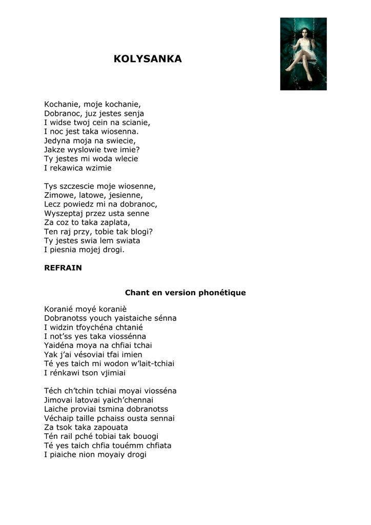 KOLYSANKA Kochanie, moje kochanie, Dobranoc, juz jestes senja I widse twoj cein na scianie, I noc jest taka wiosenna. Jedyna moja na swiecie, Jakze wyslowie twe imie? Ty jestes mi woda wlecie I rekawica wzimie Tys szczescie moje wiosenne, Zimowe, latowe, jesienne, Lecz powiedz mi na dobranoc, Wyszeptaj przez usta senne Za coz to taka zaplata, Ten raj przy, tobie tak blogi? Ty jestes swia lem swiata I piesnia mojej drogi. REFRAIN Chant en version phonétique Koranié moyé koraniè Dobranotss youch yaistaiche sénna I widzin tfoychéna chtanié I not’ss yes taka viossénna Yaidéna moya na chfiai tchai Yak j’ai vésoviai tfai imien Té yes taich mi wodon w’lait-tchiai I rénkawi tson vjimiai Téch ch’tchin tchiai moyai viosséna Jimovai latovai yaich’chennai Laiche proviai tsmina dobranotss Véchaip taille pchaiss ousta sennai Za tsok taka zapouata Tén rail pché tobiai tak bouogi Té yes taich chfia touémm chfiata I piaiche nion moyaiy drogi