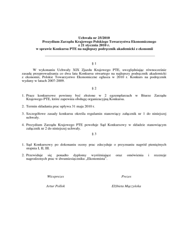 Uchwała nr 25/2010 Prezydium Zarządu Krajowego Polskiego Towarzystwa Ekonomicznego z 21 stycznia 2010 r. w sprawie Konkursu PTE na najlepszy podręcznik akademicki z ekonomii §1 W wykonaniu Uchwały XIX Zjazdu Krajowego PTE, uwzględniając równocześnie zasadę przeprowadzania co dwa lata Konkursu otwartego na najlepszy podręcznik akademicki z ekonomii, Polskie Towarzystwo Ekonomiczne ogłasza w 2010 r. Konkurs na podręcznik wydany w latach 2007-2009. §2 1. Prace konkursowe powinny być złożone w 2 egzemplarzach w Biurze Zarządu Krajowego PTE, które zapewnia obsługę organizacyjną Konkursu. 2. Termin składania prac upływa 31 maja 2010 r. 3. Szczegółowe zasady konkursu określa regulamin stanowiący załącznik nr 1 do niniejszej uchwały. 4. Prezydium Zarządu Krajowego PTE powołuje Sąd Konkursowy w składzie stanowiącym załącznik nr 2 do niniejszej uchwały. §3 1. Sąd Konkursowy po dokonaniu oceny prac zdecyduje o przyznaniu nagród pieniężnych stopnia I, II, III. 2. Przewiduje się ponadto dyplomy wyróżniające nagrodzonych prac w dwumiesięczniku „Ekonomista”. oraz omówienia Wiceprezes Prezes Artur Pollok Elżbieta Mączyńska i recenzje Załącznik nr 1 REGULAMIN KONKURSU Polskiego Towarzystwa Ekonomicznego na najlepszy podręcznik akademicki z ekonomii §1 1. Nagrodę przyznaje się za najlepszy polski podręcznik akademicki z ekonomii. 2. Konkurs przeprowadza się co 2 lata. 3. Prezydium Zarządu Krajowego PTE ogłasza Konkurs, ustala termin składania wniosków, powołuje Przewodniczącego oraz skład Sądu Konkursowego. §2 1. Nagroda przyznawana jest za najlepszy podręcznik akademicki wydany w trzech latach poprzedzających rok ogłoszenia konkursu. 2. Wniosek o przyznanie nagrody wraz z uzasadnieniem oraz podręcznik (2 egzemplarze) może składać każdy profesor nauk ekonomicznych do Zarządu Krajowego Polskiego Towarzystwa Ekonomicznego w Warszawie. 3. Podręcznik członka Sądu Konkursowego nie może być rozpatrywany przez Sąd Konkursowy. §3 1. Sąd Konkursowy po dokonaniu oceny prac decyduje o przyznaniu nagród pieniężnych I, II, III stopnia i o ich wysokości. 2. Sąd Konkursowy może też przyznać dyplomy wyróżniające oraz wydać recenzje nagrodzonych prac w dwumiesięczniku "Ekonomista". 3. Głosowanie w sprawie przyznania nagrody jest tajne. 4. Sąd Konkursowy podejmuje decyzje większością głosów. W przypadku równej liczby głosów za i przeciw rozstrzyga głos przewodniczącego Sądu Konkursowego. 5. Sąd Konkursowy może nie przyznać nagrody. 6. Decyzja Sądu Konkursowego jest ostateczna i nie ma od niej odwołania. §4 1. Budżet Sądu Konkursowego określa Prezydium Zarządu Krajowego Towarzystwa. Budżet Sądu Konkursowego obejmuje koszty zleconych recenzji, koszty delegacji członków Sądu Konkursowego i koszt zakupu książek przedstawionych do nagrody. Załącznik nr 2 Skład Sądu Konkursowego na najlepszy podręcznik akademicki z ekonomii 1. prof. Stanisław Rudolf – przewodniczący 2. prof. Andrzej S. Barczak 3. prof. Stanisława Borkowska 4. prof. Waldemar Grzywacz 5. prof. Zofia Dach 6. prof. Barbara Liberska 7. prof. Jan Lipiński 8. prof. Marek Lubiński 9. prof. Andrzej Matysiak 10. prof. Adam Noga 11. prof. Barbara Polszakiewicz 12. prof. Jan Solarz 13. prof. Andrzej Szplit 14. prof. Leszek Żabiński