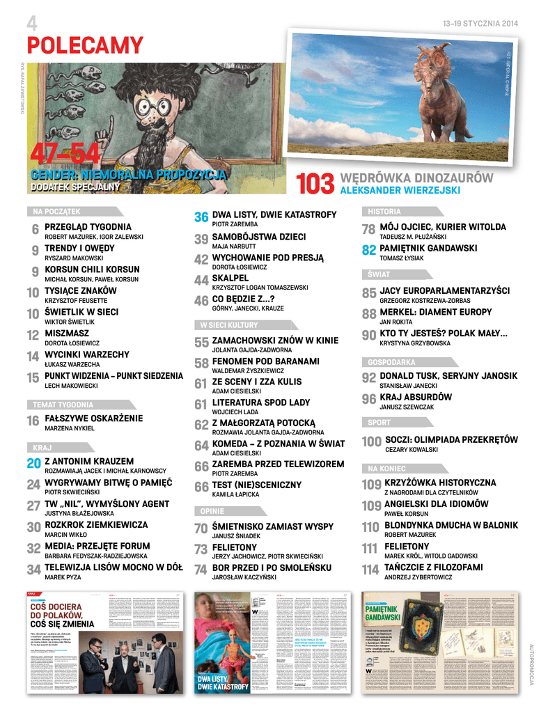 4 13–19 STYCZNIA 2014 RYS. RAFAŁ ZAWISTOWSKI F O T. IMPER M IAL CINE NEPIX X POLECAMY 47–54 GENDER: NIEMORALNA PROPOZYCJA 103 WĘDRÓWKA DINOZAURÓW DODATEK SPECJALNY ALEKSANDER WIERZEJSKI [ NA POCZĄTEK 6 9 9 PRZEGLĄD TYGODNIA TRENDY I OWĘDY 42 RYSZARD MAKOWSKI KORSUN CHILI KORSUN 10 ŚWIETLIK W SIECI 12 MISZMASZ 14 WYCINKI WARZECHY 15 PUNKT WIDZENIA – PUNKT SIEDZENIA LECH MAKOWIECKI [ FAŁSZYWE OSKARŻENIE [ Z ANTONIM KRAUZEM 20 ROZMAWIAJĄ JACEK I MICHAŁ KARNOWSCY 24 WYGRYWAMY BITWĘ O PAMIĘĆ 27 TW „NIL”, WYMYŚLONY AGENT ADAM CIESIELSKI 61 WOJCIECH LADA 73 BARBARA FEDYSZAK-RADZIEJOWSKA LISÓW MOCNO W DÓŁ 34 TELEWIZJA 74 MAREK PYZA Decyzja o dotacji jest kluczowa dla produkcji? W przypadku ewentualnej odmowy realizacja filmu będzie dużo trudniejsza. Liczę jednak na pozytywną decyzję, ale przede wszystkim liczą na nią czekające na nasz film miliony ludzi i te tysiące, które z własnych pieniędzy dokładają się do przedsięwzięcia za pośrednictwem Fundacji Smoleńsk 2010. To wyraźny głos opinii publicznej. To jest też społeczeństwo obywatelskie w działaniu. Wierzę w zawodową uczciwość i niezależność ekspertów PISF, którzy będą ten projekt oceniać, wierzę w kompetencję urzędników tam zatrudnionych. Ale oczywiście nie wiem, jak będzie, to się okaże za kilka tygodni. Na pewno będzie to test, na ile jeszcze państwo jest nasze wspólne, publiczne pieniądze dostępne dla wszystkich na tych samych prawach, zaś wszyscy obywatele równi. Co zatem dotychczas udało się nakręcić? Pierwsze zdjęcia nakręciliśmy 10 kwietnia ub.r. na Krakowskim Przedmieściu w Warszawie, podczas obchodów rocznicy tragedii smoleńskiej. Później na lotnisku w Białej ANGIELSKI DLA IDIOMÓW 109 PAWEŁ KORSUN FELIETONY JERZY JACHOWICZ, PIOTR SKWIECIŃSKI JAROSŁAW KACZYŃSKI 13–19 STYCZNIA 2014 Dwa razy inteligenckie elity wyraziły głęboki sprzeciw wobec rządowej polityki. W służbie zdrowia i edukacji. Czy jednak znów nie skończy się na słowach? Jaki procent filmu można zatem uznać za nakręcony? Reżyserowi zawsze trudno odpowiedzieć na takie pytanie. Szacunkowo mogę tylko PIOTR ZAREMBA komentator, publicysta W [ PROTESTY DWA LISTY, DWIE KATASTROFY Sens trwania Arłukowicza Tymczasem politycy PO objaśniali fakt pozostawienia w rządzie Bartosza Arłukowicza prostą prawidłowością. Oto na przełomie 2013 i 2014 r. nie protestują lekarze. A rok temu nie chcieli wypisywać recept na leki refundowane. Tym razem cisza. Nie zauważyli politycy partii rządzącej jednego. W ekonomii niedoboru, a taka cechuje dziś służbę zdrowia, nie lekarze są głównymi poszkodowanymi. Ba, wycinkowo oni na niej mogą zyskiwać. Ofiarami są pacjenci. Tylko że oni są rozproszeni, pozbawieni możliwości protestowania. Nikt ich nie reprezentuje. się miraż utopii rynkowej – czy ktoś pamięta, że w kampanii parlamentarnej 2011 r. PO wróciła na chwilę do obietnicy stworzenia kilku ubezpieczalni zdrowotnych w miejsce scentralizowanego NFZ? Czy to ma sens? Eksperci od zdrowia zwracają słusznie uwagę, że normalnego rynku tu nie będzie, bo są to usługi wyjątkowo trudno wycenialne. Utopię i tak zarzucono. Pomysł dłubania przy obecnym systemie też utrzymuje się zwykle nie dłużej niż parę miesięcy. Przebąkuje się wciąż o „urealnieniu” składki zdrowotnej (czyli jej podniesieniu), lecz rząd nie ma odwagi zwiększać obciążeń. Nie ma też odwagi, i to już uważam za kuriozalne, powiedzieć społeczeństwu: mamy zdrowotny stan wyjątkowy. Przerywanie nowotworowych kuracji to w praktyce odmowa pomocy w obliczu śmierci, na to są para- JEŚLI RZĄD UWAŻA, ŻE NIE WSZYSTKIM WARTO RATOWAĆ ŻYCIE, NIECH TO NAM POWIE porzucił. Prawdopodobniejsza jest odpowiedź najprostsza: nikt nie chce się podjąć roli figuranta ogłaszającego nowe początki bez jakiegokolwiek pokrycia, bo tu brzmi to wyjątkowo makabrycznie. Możliwe zresztą, że w następstwie kolejkowego ultimatum Arłukowicz odejdzie, a Tusk znajdzie kogoś nowego, kto będzie z fanfarami przez miesiące zapowiadał nienapisane w końcu ustawy. I tak zejdzie do końca kadencji. To nie tylko Arłukowicz, ale cały ten rząd nie ma tu koncepcji, choć może Donald Tusk wymyślił sobie, że taki czarny lud chowający się przed dziennikarzami w gmachu ministerstwa to odgromnik. Dziennikarze czepiają się tylko jego. W medycynie od ściany do ściany W rzeczywistości ten rząd miota się od ściany do ściany. Pojawiał grafy w kodeksie karnym. Skierujmy więc strumień pieniędzy z innych, mniej palących potrzeb. Czy musimy koniecznie finansować tak obficie imprezy sportowe albo eksperymentalne teatry? Naród by zrozumiał. Ta połowiczność w szukaniu rozwiązań widoczna była ostatnio – kiedy Arłukowicz pomachał na chwilę tzw. dodatkowymi ubezpieczeniami zdrowotnymi. PiS natychmiast go zaatakowało z pozycji egalitarnych. Jarosław Kaczyński, który miał niedawno mamę w szpitalu, nie może znieść pomysłu, że jakaś grupa miałaby w publicznej służbie zdrowia mieć systemowo zapewnione lepsze warunki. Sprawa nie jest prosta, bo ludzie o wyższych dochodach nie tylko płacą wyższe składki, ale w praktyce rezygnują z wielu usług publicznej medycyny, choć na nią łożą. Uciekają przed kolejkami do prywatnych gabinetów, co też nie jest sprawiedliwe. 111 MAREK KRÓL, WITOLD GADOWSKI FELIETONY TAŃCZCIE Z FILOZOFAMI Tylko że w ekonomii niedoboru stworzenie komuś lepszych warunków oznacza odebranie komuś innemu. Kładzie się kogoś na lepszej sali, więc kogoś innego na korytarzu. Ktoś czeka krócej, to inny czeka dłużej. A na zoperowanie zaćmy na oku już dziś czeka się… trzy lata. W obliczu takiego dylematu premier odgrywa istną komedię. „Proszę się nie dziwić, że my to chcemy obejrzeć z każdej strony, bo chodzi o to, aby wszyscy Polacy mieli lepszy dostęp do usługi zdrowotnej, a nie tylko ci, których będzie st