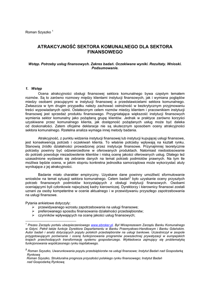 Roman Szyszko 1 ATRAKCYJNOŚĆ SEKTORA KOMUNALNEGO DLA SEKTORA FINANSOWEGO Wstęp. Potrzeby usług finansowych. Zakres badań. Oczekiwane wyniki. Rezultaty. Wnioski. Podsumowanie. 1. Wstęp Ocena atrakcyjności obsługi finansowej sektora komunalnego bywa częstym tematem rozmów. Są to zarówno rozmowy między klientami instytucji finansowych, jak i wymiana poglądów miedzy osobami pracującymi w instytucji finansowej a przedstawicielami sektora komunalnego. Zwłaszcza w tym drugim przypadku należy zachować ostrożność w bezkrytycznym przyjmowaniu treści wypowiadanych opinii. Ostatecznym celem rozmów miedzy klientem i pracownikiem instytucji finansowej jest sprzedaż produktu finansowego. Przygniatająca większość instytucji finansowych wymienia sektor komunalny jako pożądaną grupę klientów. Jednak w praktyce zarówno korzyści uzyskiwane przez komunalnego klienta, jak dostępność pożądanych usług może być daleka od doskonałości. Zatem oficjalne deklaracje nie są skutecznym sposobem oceny atrakcyjności sektora komunalnego. Rzetelna analiza wymaga innej metody badania. Atrakcyjność, z punktu widzenia instytucji finansowej lub instytucji kupującej usługi finansowe, jest konsekwencją potrzeb i oczekiwań klienta. To właśnie potrzeby wpływają na kształt rynku. Stanowią źródło działalności prowadzonej przez instytucje finansowe. Przynajmniej teoretycznie potrzeby powinny być odzwierciedlone w oferowanych produktach. Natomiast niedostosowanie do potrzeb powoduje niezadowolenie klientów i niską ocenę jakości oferowanych usług. Dlatego też uzasadnione wydawało się zebranie danych na temat potrzeb podmiotów prawnych. Na tym tle możliwa będzie ocena, w jakim stopniu konkretna jednostka samorządowa może wykorzystać atuty wynikające z jej atrakcyjności. Badanie miało charakter empiryczny. Uzyskane dane powinny umożliwić sformułowanie wniosków na temat sytuacji sektora komunalnego. Celem badań2 było uzyskanie oceny przyszłych potrzeb finansowych podmiotów korzystających z obsługi instytucji finansowych. Osobami oceniającymi byli członkowie najwyższej kadry kierowniczej. Dyrektorzy i kierownicy finansowi zostali uznani za osoby kompetentne w ocenie aktualnego i w przewidywaniu przyszłego zapotrzebowania na usługi finansowe. Pytania ankietowe dotyczyły: przewidywanego wzrostu zapotrzebowania na usługi finansowe; preferowanego sposobu finansowania działalności przedsiębiorstw; czynników wpływających na ocenę jakości usług finansowych; 1 Prezes Zarządu portalu ubezpieczeniowego www.ebroker.pl. Był Wiceprezesem Zarządu Banku Komunalnego w Gdyni. Pełnił także funkcje Dyrektora Departamentu w Banku Przemysłowo-Handlowym i Banku Gdańskim. Autor badań i analiz dotyczących popytu polskich przedsiębiorstw na usługi bankowe. Uczestniczył w zespole przygotowującym porównanie i ocenę funkcjonowania programów powszechnej prywatyzacji w europejskich krajach przechodzących transformację systemu gospodarczego. Wykładowca zajmujący się problematyką funkcjonowania współczesnego rynku kapitałowego. 2 Roman Szyszko, Uwarunkowania popytu przedsiębiorstw na usługi finansowe; Instytut Badań nad Gospodarką Rynkową Roman Szyszko, Strukturalna prognoza przyszłości polskiego rynku finansowego; Instytut Badań nad Gospodarką Rynkową preferowanego przez klientów sposobu finansowania; stopnia lojalności klientów wobec obsługujących ich instytucji finansowych; poziomu zadowolenia klienta z obsługi finansowej; czynników wpływających na wybór instytucji finansowej. 2. Potrzeby usług finansowych Ocenie kadry kierowniczej podlegała spodziewana przyszła skala wzrost popytu na usługi finansowe. Struktura otrzymywanych ocen wynikała z przyjętego podziału produktów finansowych. Kryterium przyjętego podziału były rodzaje potrzeb finansowych. Usługi finansowe zostały zatem podzielone na cztery grupy: obsługa transakcji finansowych3 - obejmująca usługi związane z dokonywaniem transakcji finansowych, związana z ofertą między innymi takich produktów jak: przelewy bankowe, zarządzanie i ochrona gotówki, akredytywy, bezpośrednie debetowanie, obsługa obrotu czekowego itd.; instytucja finansowa pełni rolę agenta transferu środków finansowych; zarządzanie ryzykiem finansowym4 - obejmujące usługi związane z zarządzaniem płynnością finansową klienta, związane z ofertą między innymi takich produktów jak: gwarancje, poręczenia kredytowe, kontrakty walutowe, opcje finansowe oraz inne transakcje zarządzania ryzykiem walutowym i ryzykiem stopy procentowej; instytucja finansowa dokonuje zmiany profilu ryzyka klienta, przy stosunkowo niewielkiej zmianie zaangażowania środków, zarządzanie ryzykiem finansowym nie wiąże się z istotną zmianą bilansowych zobowiązań i roszczeń klienta wobec instytucji finansowej; finansowanie działalności5 - obejmujące usługi związane z pozyskiwaniem środków finansowych przez klienta, związane z ofertą między innymi takich produktów jak: kredyty i pożyczki, krótkoterminowe papiery dłużne, emisje obligacji i nowych akcji; instytucja finansowa pełni rolę podmiotu finansującego działalność klienta, finansowanie działalności wiąże się ze wzrostem wartości roszczeń instytucji finansowej wobec klienta; zarządzanie środkami finansowymi6 - obejmujące usługi związane z inwestowaniem przez instytucję finansową pozostawionych w jej dyspozycji środków klienta, związane z ofertą między innymi takich produktów jak: przyjmowanie depozytów, przeprowadzanie fuzji i przejęć, zarządzanie funduszem inwestycyjnym; zarządzanie środkami finansowymi wiąże się ze wzrostem wartości roszczeń klienta wobec instytucji finansowej. Metoda klasyfikacji potrzeb i produktów finansowych zaczerpnięta została z analizy perspektyw rozwoju instytucji finansowych7. W dalszej części tekstu pojęcia „potrzeba finansowa” i „pr