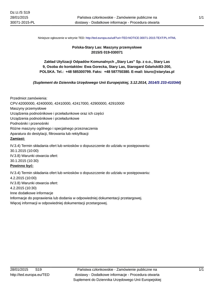 Dz.U./S S19 28/01/2015 30071-2015-PL Państwa członkowskie - Zamówienie publiczne na dostawy - Dodatkowe informacje - Procedura otwarta 1/1 Niniejsze ogłoszenie w witrynie TED: http://ted.europa.eu/udl?uri=TED:NOTICE:30071-2015:TEXT:PL:HTML Polska-Stary Las: Maszyny przemysłowe 2015/S 019-030071 Zakład Utylizacji Odpadów Komunalnych „Stary Las” Sp. z o.o., Stary Las 9, Osoba do kontaktów: Ewa Gorecka, Stary Las, Starogard Gdański83-200, POLSKA. Tel.: +48 585300799. Faks: +48 587750380. E-mail: [email protected] (Suplement do Dziennika Urzędowego Unii Europejskiej, 3.12.2014, 2014/S 233-410344) Przedmiot zamówienia: CPV:42000000, 42400000, 42410000, 42417000, 42900000, 42910000 Maszyny przemysłowe Urządzenia podnośnikowe i przeładunkowe oraz ich części Urządzenia podnośnikowe i przeładunkowe Podnośniki i przenośniki Różne maszyny ogólnego i specjalnego przeznaczenia Aparatura do destylacji, filtrowania lub rektyfikacji Zamiast: IV.3.4) Termin składania ofert lub wniosków o dopuszczenie do udziału w postępowaniu: 30.1.2015 (10:00) IV.3.8) Warunki otwarcia ofert: 30.1.2015 (10:30) Powinno być: IV.3.4) Termin składania ofert lub wniosków o dopuszczenie do udziału w postępowaniu: 4.2.2015 (10:00) IV.3.8) Warunki otwarcia ofert: 4.2.2015 (10:30) Inne dodatkowe informacje Informacje do poprawienia lub dodania w odpowiedniej dokumentacji przetargowej. Więcej informacji w odpowiedniej dokumentacji przetargowej. 28/01/2015 S19 http://ted.europa.eu/TED Państwa członkowskie - Zamówienie publiczne na dostawy - Dodatkowe informacje - Procedura otwarta Suplement do Dziennika Urzędowego Unii Europejskiej 1/1