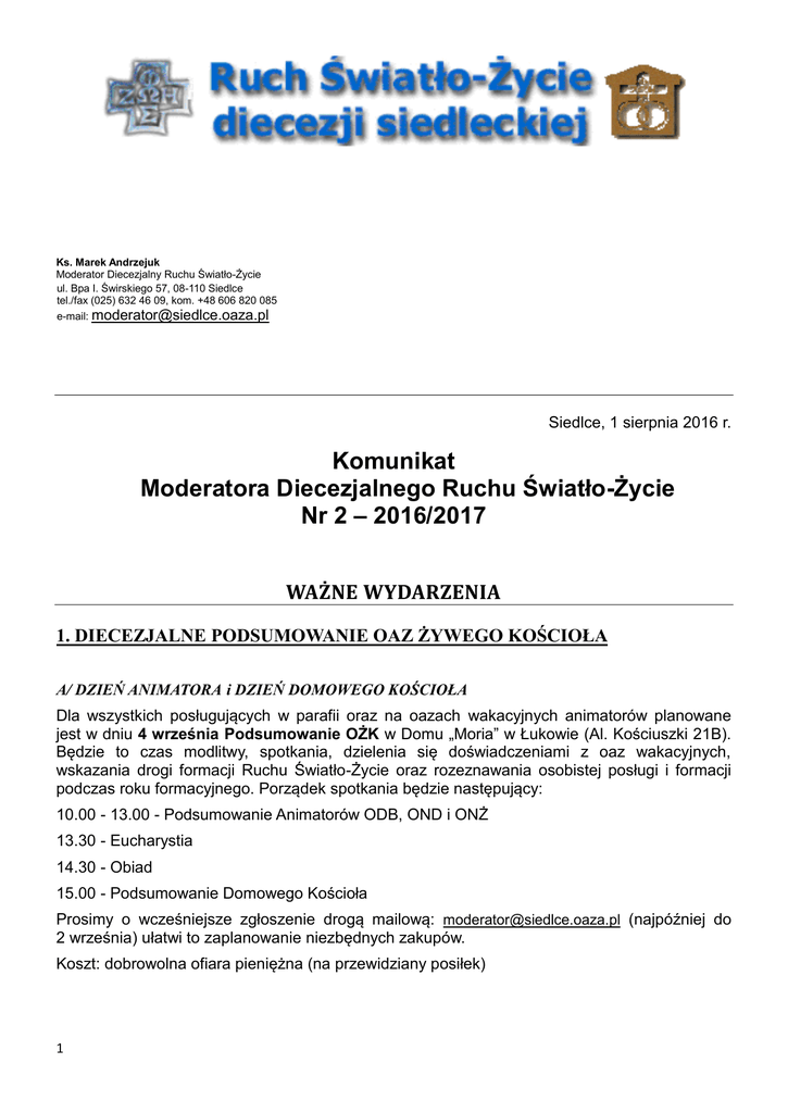 Ks. Marek Andrzejuk Moderator Diecezjalny Ruchu Światło-Życie ul. Bpa I. Świrskiego 57, 08-110 Siedlce tel./fax (025) 632 46 09, kom. +48 606 820 085 e-mail: [email protected] Siedlce, 1 sierpnia 2016 r. Komunikat Moderatora Diecezjalnego Ruchu Światło-Życie Nr 2 – 2016/2017 WAŻNE WYDARZENIA 1. DIECEZJALNE PODSUMOWANIE OAZ ŻYWEGO KOŚCIOŁA A/ DZIEŃ ANIMATORA i DZIEŃ DOMOWEGO KOŚCIOŁA Dla wszystkich posługujących w parafii oraz na oazach wakacyjnych animatorów planowane jest w dniu 4 września Podsumowanie OŻK w Domu „Moria” w Łukowie (Al. Kościuszki 21B). Będzie to czas modlitwy, spotkania, dzielenia się doświadczeniami z oaz wakacyjnych, wskazania drogi formacji Ruchu Światło-Życie oraz rozeznawania osobistej posługi i formacji podczas roku formacyjnego. Porządek spotkania będzie następujący: 10.00 - 13.00 - Podsumowanie Animatorów ODB, OND i ONŻ 13.30 - Eucharystia 14.30 - Obiad 15.00 - Podsumowanie Domowego Kościoła Prosimy o wcześniejsze zgłoszenie drogą mailową: [email protected] (najpóźniej do 2 września) ułatwi to zaplanowanie niezbędnych zakupów. Koszt: dobrowolna ofiara pieniężna (na przewidziany posiłek) 1 B/ DZIEŃ MODERATORA Moderatorów posługujący podczas oaz wakacyjnych oraz tych, którzy będą posługiwać w tym roku wspólnotom Ruchu w parafii (dzieciom, młodzieży, Domowemu Kościołowi) zapraszam na spotkanie w dniu 5 września w Domu „Moria” w Łukowie (Al. Kościuszki 21B). Rozpoczęcie o godzinie 19.30. Podczas spotkania będziemy podsumowywać oazy wakacyjne i nakreślać roczną drogę formacyjną. Spotkanie będzie miało charakter także formacyjny i będzie rozpoczynać comiesięczne spotkania kapłańskie. 2. OAZA MODLITWY „MIŁOSIERNI JAK OJCIEC” Coś byś zrobił dla siebie? Gdzieś byś się wybrał na rekolekcje, a nie chcesz zbyt daleko wyjeżdżać? Chcesz naładować duchowe akumulatory, a nie masz zbyt dużo czasu? Te weekendowe rekolekcje są dla Ciebie! Czeka cię czas pogłębienia wiary, może nawrócenia, budowania wspólnoty poprzez modlitwę, zabawę, pracę, spotkanie z ludźmi, którzy chcą zrobić coś dobrego w temacie rekolekcji. Rekolekcje są skierowane: do osób będących w Ruchu Światło-Życie – młodzież, studenci, dorośli, osoby konsekrowane, kapłani, Domowy Kościół, ale również dorośli, którzy chcą przeżyć krótkie, intensywne rekolekcje, a nie są na drodze formacyjnej Ruchu. Miejsce: „Moria” - Dom Ruchu Światło-Życie Diecezji Siedleckiej w Łukowie (ul. Al. Kościuszki 21B) Czas: 9 – 11 września. Rozpoczęcie w piątek o 18.00, zakończenie w niedzielę ok. 14.00. Prowadzenie: ks. Witold Juszczuk Koszt: 110 zł, osoby do 25 roku życia - 90 zł – opłata już na miejscu Zgłoszenia: imię i nazwisko, parafia, miejscowość - telefonicznie lub sms na nr tel. 500637165 do 5 września. Pod tym numerem również szczegółowe informacje. Należy wziąć ze sobą szczególnie: Pismo święte, śpiwór, dobre nastawienie. W planach: codzienna Eucharystia, Liturgia Godzin, spotkania w grupie, konferencje tematyczne, modlitwa osobista przed Najświętszym Sakramentem, modlitwa wspólnotowa, Celebracja Sakramentu Pojednania, a w sobotę tzw. pogodny wieczór z ciekawymi grami oraz zabawami i oczywiście posiłki 3. DIECEZJALNA PIELGRZYMKA ROZPOCZYNAJĄCA ROK FORMACYJNY RUCHU ŚWIATŁO-ŻYCIE Serdecznie zapraszam członków Ruchu Światło-Życie: dzieci, młodzież, rodziny i dorosłych na Diecezjalną Pielgrzymkę Ruchu Światło-Życie rozpoczynającą rok formacyjny (Powakacyjny Dzień Wspólnoty). Odbędzie się ona w dniu 17 września w Diecezjalnym Sanktuarium Bożego Miłosierdzia w Białej Podlaskiej (ul. Kard. S. Wyszyńskiego 53/55). Plan przedstawia się następująco: 10.00 – ZAWIĄZANIE WSPÓLNOTY 10.30 - „KRUCJATA CZYNEM MIŁOSIERDZIA” - katecheza o Krucjacie Wyzwolenia Człowieka – ks. Wojciech Ignasiak – kierownik Ośrodka Profilaktyczno-Wychowawczego im. ks. Franciszka Blachnickiego w Katowicach 11.15 - GODZINA ŚWIADECTWA z rekolekcji wakacyjnych 12.45 – Przygotowanie do Eucharystii 2 13.00 - EUCHARYSTIA 14.30 - AGAPA Do posługi prosimy następujące wspólnoty: Śpiew i zawiązanie wspólnoty: Diakonia Muzyczna Asysta: Diakonia Liturgiczna Czytanie: Parafia Chrystusa Miłosiernego w Białej Podlaskiej Psalm: Parafia św. Brata Alberta w Łukowie Modlitwa wiernych: Parafia Świętej Rodziny w Sobolewie Dary: Parafia Matki Bożej Częstochowskiej w Gręzówce Służba ładu i taca: Domowy Kościół rejonu bialskiego Listy Jedności: Diecezjalna Diakonia Jedności Taca zbierana podczas Eucharystii będzie przeznaczona na Dom „Moria” w Łukowie – ze szczególnym uwzględnieniem wyposażenia stołówki w nowe krzesła. Podczas Eucharystii będzie miało miejsce przekazanie posługi par rejonowych oraz odpowiedzialności za diakonie diecezjalne. Podczas Powakacyjnego Dnia Wspólnoty będziemy jak co roku gościć Wydawnictwo ŚwiatłoŻycie. 4. OGÓLNOPOLSKA CZŁOWIEKA PIELGRZYMKA KRUCJATY WYZWOLENIA Zapraszamy już teraz na ogólnopolską XXXVI Pielgrzymkę Krucjaty Wyzwolenia Człowieka na Pola Lednickie. Odbędzie się ona 24-25 września 2016 r. Wyjazd dwudniowy z noclegiem. Obok uroczystości na Polach w planach nawiedzenie Włocławka i Płocka. Cena ok. 160 zł. Zgłoszenia i szczegółowe informacje u Romana Jastrzębskiego (tel. 885838727). Jako zachęta niech posłużą słowa relacji z 1980 roku - w rocznicę proklamacji KWC zawarte w pierwszym numerze Eleuterii, pisma-listu skierowanego do członków KWC: Pielgrzymkę uznaliśmy za moment rozpoczęcia ofensywy, po okresie przygotowania i zbierania doświadczeń. Okazała się bardzo potrzebną jako wzajemne umocnienie przez modlitwę, świadectwo, Słowo Boże i Eucharystię w wierności przyjętych zobowiązań i w podejmowaniu czynów wyzwolenia wobec braci w duchu Chrystusowej miłości. 5. DNI SKUPIENIA DLA OSÓB DOROSŁYCH Zapraszamy osoby, któr