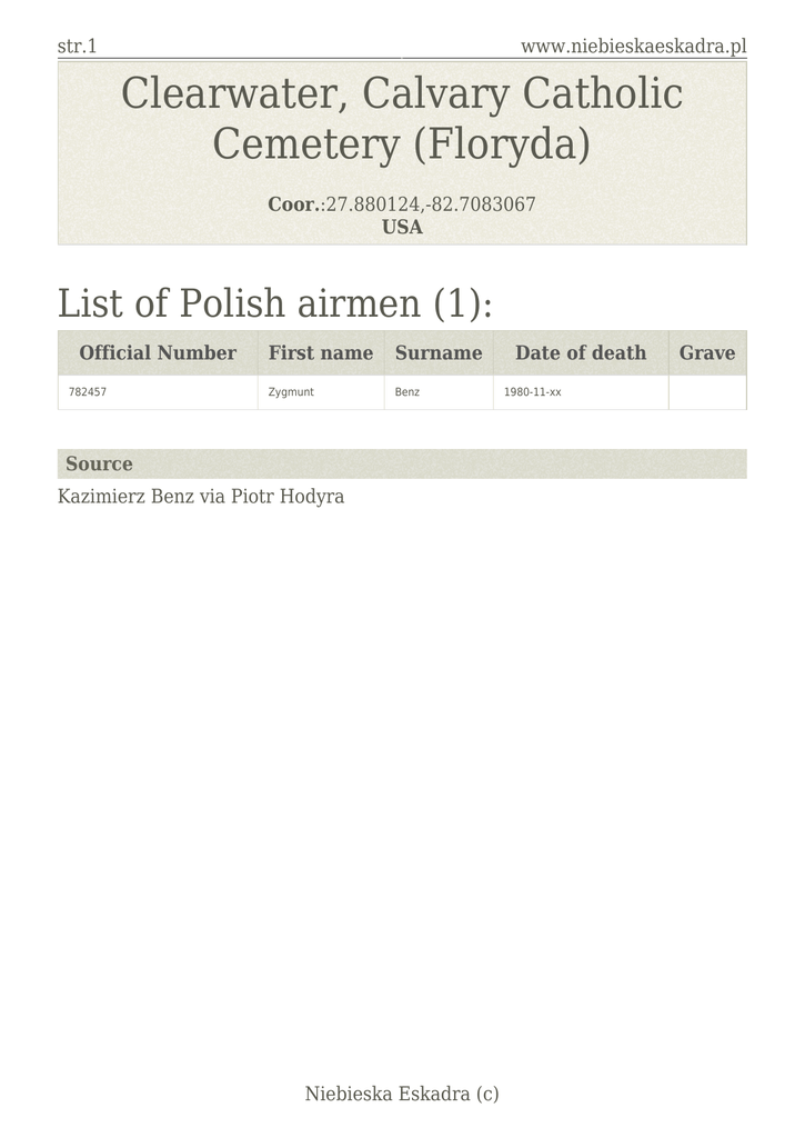 str.1 www.niebieskaeskadra.pl Clearwater, Calvary Catholic Cemetery (Floryda) Coor.:27.880124,-82.7083067 USA List of Polish airmen (1): Official Number 782457 First name Surname Zygmunt Benz Source Kazimierz Benz via Piotr Hodyra Niebieska Eskadra (c) Date of death 1980-11-xx Grave