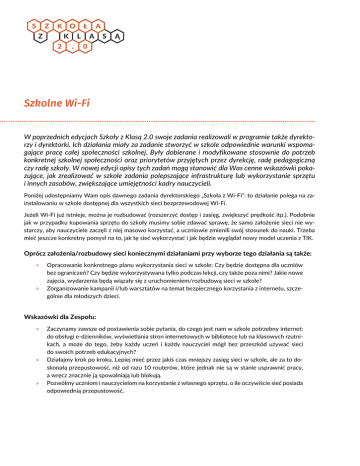 W poprzednich edycjach Szkoły z Klasą 2.0 swoje zadania realizowali w programie także dyrektorzy i dyrektorki. Ich działania miały za zadanie stworzyć w szkole odpowiednie warunki wspomagające pracę całej społeczności szkolnej. Były dobierane i modyfikowane stosownie do potrzeb konkretnej szkolnej społeczności oraz priorytetów przyjętych przez dyrekcję, radę pedagogiczną czy radę szkoły. W nowej edycji opisy tych zadań mogą stanowić dla Was cenne wskazówki pokazujące, jak zrealizować w szkole zadania polepszające infrastrukturę lub wykorzystanie sprzętu i innych zasobów, zwiększające umiejętności kadry nauczycieli. Poniżej udostępniamy Wam opis dawnego zadania dyrektorskiego „Szkoła z Wi-Fi”: to działanie polega na zainstalowaniu w szkole dostępnej dla wszystkich sieci bezprzewodowej Wi-Fi. Jeżeli Wi-Fi już istnieje, można je rozbudować (rozszerzyć dostęp i zasięg, zwiększyć prędkość itp.). Podobnie jak w przypadku kupowania sprzętu do szkoły musimy sobie zdawać sprawę, że samo założenie sieci nie wystarczy, aby nauczyciele zaczęli z niej masowo korzystać, a uczniowie zmienili swój stosunek do nauki. Trzeba mieć jeszcze konkretny pomysł na to, jak tę sieć wykorzystać i jak będzie wyglądał nowy model uczenia z TIK. Oprócz założenia/rozbudowy sieci koniecznymi działaniami przy wyborze tego działania są także: » » Opracowanie konkretnego planu wykorzystania sieci w szkole: Czy będzie dostępna dla uczniów bez ograniczeń? Czy będzie wykorzystywana tylko podczas lekcji, czy także poza nimi? Jakie nowe zajęcia, wydarzenia będą wiązały się z uruchomieniem/rozbudową sieci w szkole? Zorganizowanie kampanii i/lub warsztatów na temat bezpiecznego korzystania z internetu, szczególnie dla młodszych dzieci. Wskazówki dla Zespołu: » » » Zaczynamy zawsze od postawienia sobie pytania, do czego jest nam w szkole potrzebny internet: do obsługi e-dzienników, wyświetlania stron internetowych w bibliotece lub na klasowych rzutnikach, a może do tego, żeby każdy uczeń i każdy nauczyciel mógł bez przeszkód używać sieci do swoich potrzeb edukacyjnych? Działajmy krok po kroku. Lepiej mieć przez jakiś czas mniejszy zasięg sieci w szkole, ale za to doskonałą przepustowość, niż od razu 10 routerów, które jednak nie są w stanie usprawnić pracy, a wręcz znacznie ją spowalniają lub blokują. Pozwólmy uczniom i nauczycielom na korzystanie z własnego sprzętu, o ile oczywiście sieć posiada odpowiednią przepustowość.