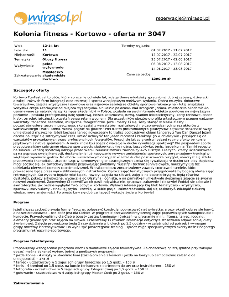 [email protected] Kolonia fitness - Kortowo - oferta nr 3047 Wiek 12-14 lat Ilość dni 11 01.07.2017 - 11.07.2017 Miejscowość Kortowo 12.07.2017 - 22.07.2017 Tematyka Obozy fitness 23.07.2017 - 02.08.2017 Wyżywienie pełne wyżywienie 03.08.2017 - 13.08.2017 Miasteczko Zakwaterowanie akademickie Kortowo Terminy wyjazdu: 14.08.2017 - 23.08.2017 Cena za osobę 1399.00 zł Szczegóły oferty Kortowo FunFestival to obóz, który corocznie od wielu lat, sciąga tłumy młodzieży spragnionej dobrej zabawy, dziesiątki atrakcji, różnych form integracji oraz rekreacji i sportu w najlepszym możlwym wydaniu. Dobra muzyka, doborowe towarzystwo, zajęcia artystyczne i sportowe oraz najnowocześniejsze obiekty sportowo-rekreacyjne - tutaj znajdziesz wszystko czego oczekujesz od miejsca wypoczynku. Unikalnie położone, nad brzegiem jeziora, miasteczko akademickie, uznanawane za najpiękniejszy kampus akademicki w Polsce, posiada na swoim terenie obiekty sportowe na najwyższym poziomie - posiada profesjonalną halę sportową, boisko ze sztuczną trawą, stadion lekkoatletyczny, korty tenisowe, basen kryty, ośrodek jeździecki, przystań ze sprzętem wodnym. Dla uczestników obozów o profilu artystycznym przeporwadzamy warsztaty: taneczne, teatralne, muzyczne, fotograficzne. Jeżeli marzy Ci się, żeby stanąć w blasku fleszy i poczuć atmosferę teatru muzycznego, skorzystaj z warsztatów musicalowych, przeprowadzanych przez aktorów z warszawskiego Teatru Roma. Wolisz pograć na gitarze? Pod okiem profesinoalnych gitarzystów będziesz doskonalić swoje umiejętności muzyczne. Jeżeli kochasz taniec nowoczesny to trafisz pod czujnym okiem tancerzy z You Can Dance! Jeżeli chcesz nauczyć się zatrzymywać czas, umieć uchwycić ten jeden moment i zamknąć go w obiektywie - przyłącz się do warsztatów prowadzonych przez profesjonalnych fotografów. Poczuj się jak za granicą i odczuj realne efekty po kursie językowym z native speakerem. A może chciałbyś spędzić wakacje w duchu rywalizacji sportowej? Dla pasjonatów sportu przygotowaliśmy całą gamę obozów sportowych: siatkówkę, piłkę nożną, koszykówkę, tenis, jazdę konną. Tajniki recepty na sukces i karierę sportową odkryje przed Wami Ireneusz Mazur i zawodnicy AZS Olsztyn. Dla tych, którzy ukierunkowani są na poprawę swojej kondycji, doskonalenie lub nabywanie nowych umiejętności sportowych, zorganizujemy treningi w większym wymiarze godzin. Na obozie survivalowym odkryjesz w sobie ducha poszukiwacza przygód, nauczysz się sztuki przetrwania i kamuflażu. Uczestnicząc w terenowych gier strategicznych czeka Cię rywalizacja w duchu fair play. Będziesz mógł poczuć się jak zawodowy żołnierz przyswajając podstawy musztry i technik survivalowych, nauczymy Cię też udzielania pierwszej pomocy przedmedycznej. W trakcie obozu zorganizujemy zawody sportowe i turnieje, które prowadzone będą przez wykwalifikowanych instruktorów. Oprócz zajęć tematycznych przygotowaliśmy bogatą ofertę zajęć rekreacyjnych. Do wyboru będzie miał kajaki, rowery, zajęcia na siłowni, zajęcia na basenie krytym. Będą również dyskoteki, pokazy artystyczne, wycieczka do Olsztyna i ogniska, a na pamiątkę FunFestivalu dostaniesz zdjęcie ze swoimi nowymi znajomymi. Zapewnimy Ci rozwójTwoich pasji indywidualnie, grupowo, zabawnie i ciekawie! Poddaj się zabawie i sam zdecyduj, jak będzie wyglądał Twój pobyt w Kortowie. Wybierz interesujący Cię blok tematyczny - artystyczny, sportowy, survivalowy , z nauką języka - rozwijaj w sobie pasje i zainteresowania, daj się zaskoczyć, zdobądź ciekawą wiedzę, nowe znajomości. Po prostu baw się dobrze i spędź wakacje życia w Kortowie! Program Jeżeli chcesz zadbać o swoją formę fizyczną, polepszyć kondycję, popracować nad sylwetką, a przy okazji dobrze się bawić, a nawet zrelaksować – ten obóz jest dla Ciebie! W programie przewidzieliśmy szereg zajęć poprawiających samopoczucie i kondycję. Przygotowaliśmy dla Ciebie bogaty zestaw treningów i ćwiczeń -w programie m.in.: fitness, taniec, jogging, elementy gimnastyki oraz zajęcia na siłowni. Przekażemy Ci również informacje dotyczące stosowania odpowiedniej diety żywieniowej. Zajęcia prowadzone będą 2 razy dziennie w blokach po 1,5 godziny - w zależności od potrzeb i wymagań grupy możemy zintensyfikować lub wydłużyć poszczególne treningi. Oprócz zajęć specjalistycznych skorzystasz z bogatego programu rekreacyjno-sportowego. Program fakultatywny Proponujemy wzbogacenie programu obozu o dodatkowe zajęcia fakultatywne. Za dodatkową opłatą (płatne przy zakupie obozu) można dokonać wyboru jednej z poniższych propozycji: * jazda konna - 4 wizyty w stadninie koni (zaznajomienie z koniem i jazda na lonży lub samodzielnie zależnie od umiejętności) – 175 zł * taniec - uczestnictwo w 5 zajęciach grupy tanecznej po 1,5 godz. – 150 zł * tenis - 4 treningi po 1,5 godz. na korcie tenisowym z partnerem do gry oraz instruktorem – 150 zł * fotografia - uczestnictwo w 5 zajęciach grupy fotograficznej po 1,5 godz. – 150 zł * gotowanie - uczestnictwo w 4 zajęciach grupy Master Cook po 2 godz. – 150 zł Zakwaterowanie Dom studencki, pokoje 2 osobowe z łazienkami. W akademiku znajduje się świetlica, sala TV, całodobowa recepcja. Miasteczko akademickie Kortowo należy do Uniwersytetu Warmińsko-Mazurskiego w Olsztynie, położone jest poza miastem nad jeziorem Kortowskim, w otoczeniu lasów i parków. Na terenie miasteczka znajdują się akademiki, budynki uczelni i różnorodne obiekty sportowo-rekreacyjne: boiska ze sztuczną nawierzchnią do piłki nożnej, koszykówki i siatkówki, korty tenisowe, kryta pływalnia, przystań wodna ze sprzętem pływającym, kąpielisko strzeżone, hala sportowa, ośrodek jeździecki, dyskoteki. Świadczenia Zakwaterowanie: 10 noclegów (PPOK0814 - 9 noclegów) Wyżywienie: Całodzienne (3 posiłki) w stołówce ośr