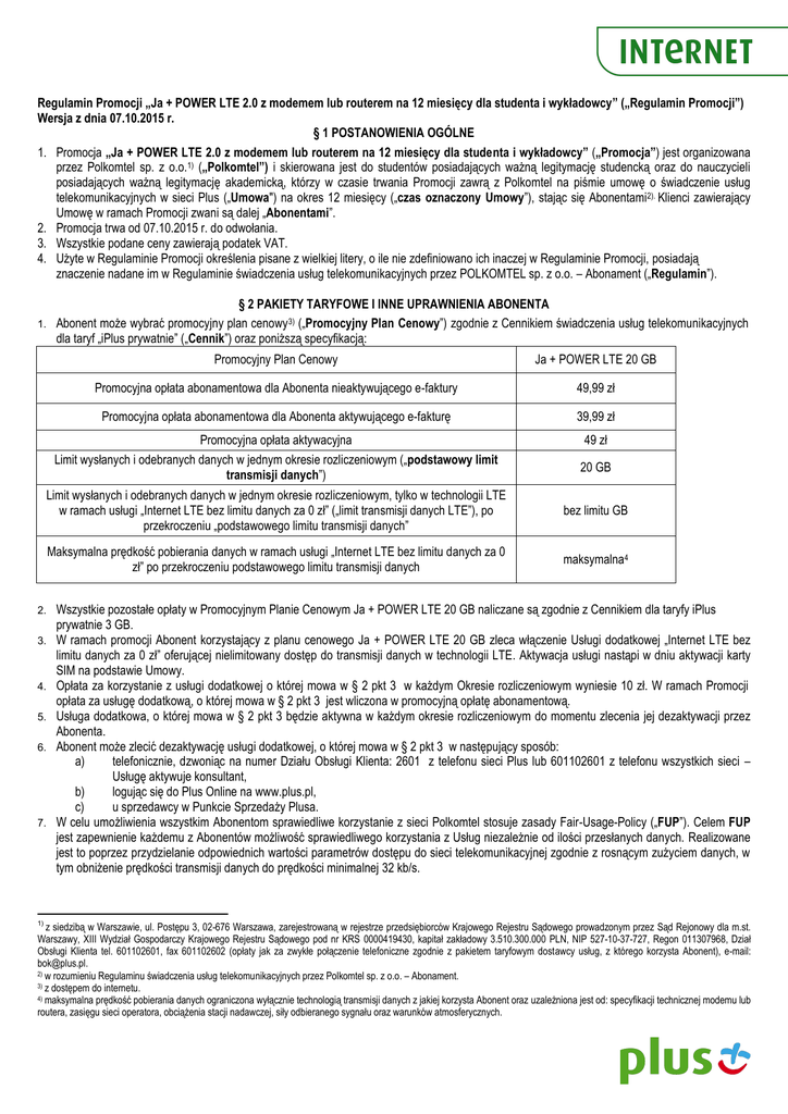 Regulamin Promocji „Ja + POWER LTE 2.0 z modemem lub routerem na 12 miesięcy dla studenta i wykładowcy” („Regulamin Promocji”) Wersja z dnia 07.10.2015 r. § 1 POSTANOWIENIA OGÓLNE 1. Promocja „Ja + POWER LTE 2.0 z modemem lub routerem na 12 miesięcy dla studenta i wykładowcy” („Promocja”) jest organizowana przez Polkomtel sp. z o.o.1) („Polkomtel”) i skierowana jest do studentów posiadających ważną legitymację studencką oraz do nauczycieli posiadających ważną legitymację akademicką, którzy w czasie trwania Promocji zawrą z Polkomtel na piśmie umowę o świadczenie usług telekomunikacyjnych w sieci Plus („Umowa") na okres 12 miesięcy („czas oznaczony Umowy”), stając się Abonentami2). Klienci zawierający Umowę w ramach Promocji zwani są dalej „Abonentami”. 2. Promocja trwa od 07.10.2015 r. do odwołania. 3. Wszystkie podane ceny zawierają podatek VAT. 4. Użyte w Regulaminie Promocji określenia pisane z wielkiej litery, o ile nie zdefiniowano ich inaczej w Regulaminie Promocji, posiadają znaczenie nadane im w Regulaminie świadczenia usług telekomunikacyjnych przez POLKOMTEL sp. z o.o. – Abonament („Regulamin”). 1. 2. 3. 4. 5. 6. 7. 1) § 2 PAKIETY TARYFOWE I INNE UPRAWNIENIA ABONENTA Abonent może wybrać promocyjny plan cenowy 3) („Promocyjny Plan Cenowy”) zgodnie z Cennikiem świadczenia usług telekomunikacyjnych dla taryf „iPlus prywatnie” („Cennik”) oraz poniższą specyfikacją: Promocyjny Plan Cenowy Ja + POWER LTE 20 GB Promocyjna opłata abonamentowa dla Abonenta nieaktywującego e-faktury 49,99 zł Promocyjna opłata abonamentowa dla Abonenta aktywującego e-fakturę 39,99 zł Promocyjna opłata aktywacyjna 49 zł Limit wysłanych i odebranych danych w jednym okresie rozliczeniowym („podstawowy limit transmisji danych”) 20 GB Limit wysłanych i odebranych danych w jednym okresie rozliczeniowym, tylko w technologii LTE w ramach usługi „Internet LTE bez limitu danych za 0 zł” („limit transmisji danych LTE”), po przekroczeniu „podstawowego limitu transmisji danych” bez limitu GB Maksymalna prędkość pobierania danych w ramach usługi „Internet LTE bez limitu danych za 0 zł” po przekroczeniu podstawowego limitu transmisji danych maksymalna4 Wszystkie pozostałe opłaty w Promocyjnym Planie Cenowym Ja + POWER LTE 20 GB naliczane są zgodnie z Cennikiem dla taryfy iPlus prywatnie 3 GB. W ramach promocji Abonent korzystający z planu cenowego Ja + POWER LTE 20 GB zleca włączenie Usługi dodatkowej „Internet LTE bez limitu danych za 0 zł” oferującej nielimitowany dostęp do transmisji danych w technologii LTE. Aktywacja usługi nastąpi w dniu aktywacji karty SIM na podstawie Umowy. Opłata za korzystanie z usługi dodatkowej o której mowa w § 2 pkt 3 w każdym Okresie rozliczeniowym wyniesie 10 zł. W ramach Promocji opłata za usługę dodatkową, o której mowa w § 2 pkt 3 jest wliczona w promocyjną opłatę abonamentową. Usługa dodatkowa, o której mowa w § 2 pkt 3 będzie aktywna w każdym okresie rozliczeniowym do momentu zlecenia jej dezaktywacji przez Abonenta. Abonent może zlecić dezaktywację usługi dodatkowej, o której mowa w § 2 pkt 3 w następujący sposób: a) telefonicznie, dzwoniąc na numer Działu Obsługi Klienta: 2601 z telefonu sieci Plus lub 601102601 z telefonu wszystkich sieci – Usługę aktywuje konsultant, b) logując się do Plus Online na www.plus.pl, c) u sprzedawcy w Punkcie Sprzedaży Plusa. W celu umożliwienia wszystkim Abonentom sprawiedliwe korzystanie z sieci Polkomtel stosuje zasady Fair-Usage-Policy („FUP”). Celem FUP jest zapewnienie każdemu z Abonentów możliwość sprawiedliwego korzystania z Usług niezależnie od ilości przesłanych danych. Realizowane jest to poprzez przydzielanie odpowiednich wartości parametrów dostępu do sieci telekomunikacyjnej zgodnie z rosnącym zużyciem danych, w tym obniżenie prędkości transmisji danych do prędkości minimalnej 32 kb/s. z siedzibą w Warszawie, ul. Postępu 3, 02-676 Warszawa, zarejestrowaną w rejestrze przedsiębiorców Krajowego Rejestru Sądowego prowadzonym przez Sąd Rejonowy dla m.st. Warszawy, XIII Wydział Gospodarczy Krajowego Rejestru Sądowego pod nr KRS 0000419430, kapitał zakładowy 3.510.300.000 PLN, NIP 527-10-37-727, Regon 011307968, Dział Obsługi Klienta tel. 601102601, fax 601102602 (opłaty jak za zwykłe połączenie telefoniczne zgodnie z pakietem taryfowym dostawcy usług, z którego korzysta Abonent), e-mail: [email protected]. 2) w rozumieniu Regulaminu świadczenia usług telekomunikacyjnych przez Polkomtel sp. z o.o. – Abonament. 3) z dostępem do internetu. 4) maksymalna prędkość pobierania danych ograniczona wyłącznie technologią transmisji danych z jakiej korzysta Abonent oraz uzależniona jest od: specyfikacji technicznej modemu lub routera, zasięgu sieci operatora, obciążenia stacji nadawczej, siły odbieranego sygnału oraz warunków atmosferycznych. 8. 9. 10. 11. 12. 13. 14. 15. 16. 17. 18. 19. 20. 21. 22. 23. 24. 25. 26. 27. W celu realizacji FUP Polkomtel zastrzega sobie możliwość zmiany parametrów technicznych transmisji danych po przekroczeniu w jednym Okresie rozliczeniowym 20 GB przesłanych i odebranych danych przy wyborze Promocyjnego Planu Cenowego Ja + POWER LTE 20 GB. Maksymalna prędkość pobierania i wysyłania danych określona w Cenniku nie obowiązuje Abonentów zawierających Umowę w ramach Promocji. W przypadku Abonentów zawierających Umowę w ramach Promocji prędkość ta, z zastrzeżeniem pkt.7, nie jest ograniczana przez Polkomtel, jest ograniczona wyłącznie technologią transmisji danych z jakiej korzysta Abonent. Wysyłanie i odbieranie danych w technologii LTE (Long Term Evolution) jest możliwe przy pomocy karty USIM, będącej własnością Polkomtel oraz z wykorzystaniem sprzętu umożliwiającego wysyłanie i odbieranie danych w technologii LTE dostępnej w sieci Polkomtel. W pr