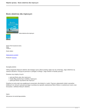 Męskie sprawy : Boże obietnice dla mężczyzn Boże obietnice dla mężczyzn Boże obietnice dla mężczyzn Ocena: Nie ma jeszcze oceny Cena 25,00 zł Kwota rabatu: Zadaj pytanie o produkt Producent: Koinonia Szczegóły produktu Odkryj bogactwo Bożych obietnic dla twojego życia. Boże prawdy nigdy się nie zmieniają, Jego obietnice są zawsze aktualne. Pozycja ta pomoże ci polegać na Bogu i Jego Słowie w każdej sytuacji. Dowiesz się między innymi: jaki jest Boży plan dla mężczyzn, kiedy Bóg wysłuchuje modlitwy mężczyzn, jakie jest Boże wyzwanie dla mężczyn Książka ta może stać się wyjątkowym prezentem dla bliskich ci osób. Poprzez odpowiedni dobór wersetów biblijnych do różnych sytuacji pomaga w praktyczny sposób zastosować Boże Słowo w codziennym życiu oraz korzystać z obfitości Bożych obietnic. Opinie Nikt jeszcze nie oceniał tego produktu. 1/1 Powered by TCPDF (www.tcpdf.org)