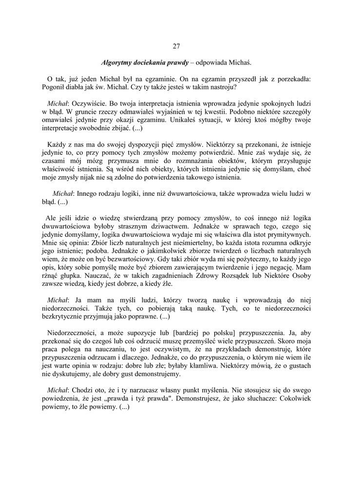 27 Algorytmy dociekania prawdy – odpowiada Michaś. O tak, juŜ jeden Michał był na egzaminie. On na egzamin przyszedł jak z porzekadła: Pogonił diabła jak św. Michał. Czy ty takŜe jesteś w takim nastroju? Michał: Oczywiście. Bo twoja interpretacja istnienia wprowadza jedynie spokojnych ludzi w błąd. W gruncie rzeczy odmawiałeś wyjaśnień w tej kwestii. Podobno niektóre szczegóły omawiałeś jedynie przy okazji egzaminu. Unikałeś sytuacji, w której ktoś mógłby twoje interpretacje swobodnie zbijać. (...) KaŜdy z nas ma do swojej dyspozycji pięć zmysłów. Niektórzy są przekonani, Ŝe istnieje jedynie to, co przy pomocy tych zmysłów moŜemy potwierdzić. Mnie zaś wydaje się, Ŝe czasami mój mózg przymusza mnie do rozmnaŜania obiektów, którym przysługuje właściwość istnienia. Są wśród nich obiekty, których istnienia jedynie się domyślam, choć moje zmysły nijak nie są zdolne do potwierdzenia takowego istnienia. Michał: Innego rodzaju logiki, inne niŜ dwuwartościowa, takŜe wprowadza wielu ludzi w błąd. (...) Ale jeśli idzie o wiedzę stwierdzaną przy pomocy zmysłów, to coś innego niŜ logika dwuwartościowa byłoby strasznym dziwactwem. JednakŜe w sprawach tego, czego się jedynie domyślamy, logika dwuwartościowa wydaje mi się właściwa dla istot prymitywnych. Mnie się opinia: Zbiór liczb naturalnych jest nieśmiertelny, bo kaŜda istota rozumna odkryje jego istnienie; podoba. JednakŜe o jakimkolwiek zbiorze twierdzeń o liczbach naturalnych wiem, Ŝe moŜe on być bezwartościowy. Gdy taki zbiór wyda mi się poŜyteczny, to kaŜdy jego opis, który sobie pomyślę moŜe być zbiorem zawierającym twierdzenie i jego negację. Mam rŜnąć głupka. Nauczać, Ŝe w takich zagadnieniach Zdrowy Rozsądek lub Niektóre Osoby zawsze wiedzą, kiedy jest dobrze, a kiedy źle. Michał: Ja mam na myśli ludzi, którzy tworzą naukę i wprowadzają do niej niedorzeczności. TakŜe tych, co pobierają taką naukę. Tych, co te niedorzeczności bezkrytycznie przyjmują jako poprawne. (...) Niedorzeczności, a moŜe supozycje lub [bardziej po polsku] przypuszczenia. Ja, aby przekonać się do czegoś lub coś odrzucić muszę przemyśleć wiele przypuszczeń. Skoro moja praca polega na nauczaniu, to jest oczywistym, Ŝe na przykładach demonstruję, które przypuszczenia odrzucam i dlaczego. JednakŜe, co do przypuszczenia, o którym nie wiem ile jest warte opinia w rodzaju: dobre lub złe; byłaby kłamliwa. Niektórzy mówią, Ŝe o gustach nie dyskutujemy, ale dobry gust demonstrujemy. Michał: Chodzi oto, Ŝe i ty narzucasz własny punkt myślenia. Nie stosujesz się do swego powiedzenia, Ŝe jest „prawda i tyŜ prawda". Demonstrujesz, Ŝe jako słuchacze: Cokolwiek powiemy, to źle powiemy. (...)