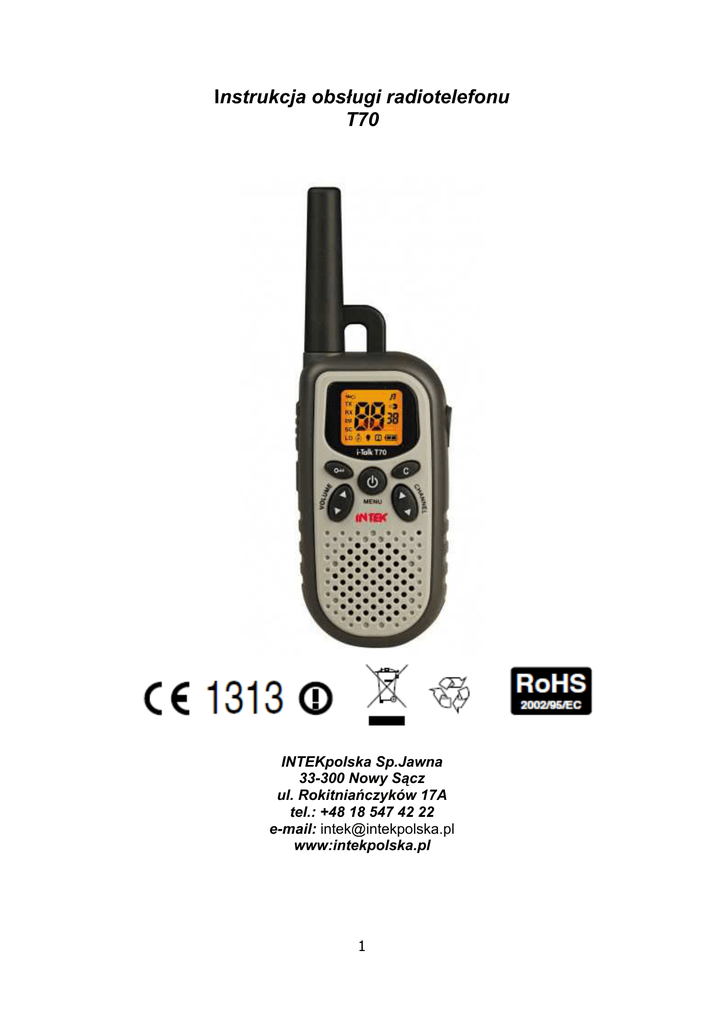 Instrukcja obsługi radiotelefonu T70 INTEKpolska Sp.Jawna 33-300 Nowy Sącz ul. Rokitniańczyków 17A tel.: +48 18 547 42 22 e-mail: [email protected] www:intekpolska.pl 1 UWAGA WAŻNE ! Jest wskazane aby uważnie przeczytać niniejszą instrukcje obsługi do końca przed użyciem produktu. To zabezpieczy użytkownika przed nieprawidłowym zabronionym w danym kraju używaniem radiotelefonu i uniemożliwi zakłócanie pracy innych użytkowników lub serwisów radiowych. UWAGA WAŻNE ! Maksymalny zasięg komunikacji radiowej bardzo zależy od terenu i warunków otoczenia i środowiska. Największy zasięg uzyskuje się w otwartej przestrzeni. Zasięg zawsze jest mniejszy w wypadku zabudowań i występujących w otoczeniu dużych struktur naturalnych lub sztucznych. Urządzenie nie zabezpiecza prywatności rozmów. Gratulujemy! Zakupu i wyboru najnowszej generacji radiotelefonu PMR INTEK. Zawiera on kilka nowoczesnych funkcji i wobec tego jest definitywnie konieczne przeczytanie instrukcji obsługi przed jego użyciem. Ustawienie i użytkowanie radiotelefonu zgodnie z instrukcją zapewni jego kilkuletnie bezawaryjne działanie. INTEK jest zaangażowany nieustannie w dostarczenie najnowszej generacji urządzeń wysokiej jakości zgodnie z życzeniami klientów i ciągle jest otwarty na komentarze ze strony użytkowników. Zastosowanie T-70 jest nowoczesnym urządzeniem dwukierunkowej komunikacji, działającym w dozwolonych w Europie pasmach PMR 446MHz. Radiotelefon musi pracować w zakresie pasma PMR446 i na kanałach dopuszczonych do użytku w kraju użytkownika zgodnie z obowiązującymi regulacjami prawnymi. Umożliwia natychmiastową, dwukierunkową, bezpłatną komunikację zarówno dla sfery biznesowej jak i prywatnej, jest idealnym urządzeniem komunikacyjnym o licznych zastosowaniach: Instytucje sportowe i wypoczynkowe, budowy, wydarzenia sportowe, koncerty, spotkania, sklepy, magazyny, hurtownie, wyścigi rowerowe czy motocyklowe, hotele, obozy wycieczkowe i wspinaczkowe, wszelka działalność zabezpieczająca i ratunkowa, monitorowanie pokoju dziecinnego, żeglarstwo i sporty walki. 2 3 Deklaracja Zgodności (tłumaczenie) (Certyfikat Zgodności CE (zgodny z dyrektywami 2006/95,2004/108,99/5) W niniejszej deklaracji potwierdzamy, że produkt jak niżej: Radiotelefon: INTEK i-Talk T70 Spełnia Dyrektywy EC dotyczące regulacji technicznych stosowanych dla tego typu urządzeń : 2006/95/EC,2004/108/EC,1999/5/EC oraz spełnia zasadnicze wymagania norm: EN 300 296-2 V1.3.1 EN 301 489-1 V1.9.2, EN 301 489-5 V1.3.1, EN 60950 -1:2006 A11,2009+A1, 2010+A12, 2011 Rodzaj produktu: radiotelefon PMR 446 Laboratorium Notyfikacyjne: Bay Area Compliance Laboratories Corp. 1274 Anvilwood Ave. Sunnyvale CA94089,USA Numer Identyfikacyjny; 1313 Producent: INTEK S.R.L.via G.Marconi 16 20090 SEGRATE Milano ITALY, tel: 0039 02 26950451 fax: 0039 02 26952185 E-mail [email protected] Osoba kontaktowa : Armando Zanni tel: 0039 0226950451 E-mail [email protected] Deklarację podpisano w Segrate 15.11.2012 przez : Generalny Dyrektor: dr. Vittorio Zanetti (C/E.O) 4 Funkcje Radiotelefon jest wyposażony w liczne nowoczesne funkcje, niemniej praca z nim jest przyjazna dla użytkownika i można się z nimi zapoznać w kilka minut. > 8 kanałów PMR446 > Moc nadajnika 500mW (wysoka) 10mW (niska) ERP > 38 tonów CTCSS > Wskaźnik baterii > Podświetlany wyświetlacz LCD > Automatyczne skanowanie kanałów > Automatyczna blokada szumów > VOX – nadawanie bez użycia rąk (5 poziomów) i Baby Monitor > Blokada klawiatury > Dual Watch – odsłuch 2 kanałów > 5 melodii sygnału wywołania > Roger Beep – sygnalizacja końca nadawania > Układ oszczędzania energii > 8 poziomów głośności Pełny zestaw zawiera w opakowaniu 2 x Jednostka główna (radiotelefon z anteną) 6 x Akumulator 1,2V Ni-MH AAA 1 x Ładowarka stołowa 2 x Zaczep na pasek 2 x Zestaw mikrofonowo-słuchawkowy 2 x smyczka 1 x Podręcznik (niniejszy) UWAGA! Należy używać wyłącznie oryginalnych akcesorii. Włączanie i używanie innych niż oryginalne może spowodować poważne zniszczenie radiotelefonu i utratę gwarancji. Zawsze przed przyłączeniem zestawu mikrofono-słuchawkowego należy ustawić minimalną głośność, w celu uniknięcia uszkodzenia zestawu lub słuchu użytkownika. 5 Instalacja i sprawdzanie baterii Radiotelefon może być zasilany 3 bateriami alkalicznymi typu AAA lub z Ni-MH 1. Przesuń zamek w górę następnie pociągnij pokrywę do góry . 2. Włóż do pojemnika 3 baterie typu AAA lub akumulatory Ni-MH . Należy zwrócić szczególną uwagę na właściwą polaryzację. Niewłaściwe ułożenie baterii uniemożliwi działanie urządzenia. 3. Ponownie wsuń pokrywę pojemnika. Ładowanie baterii Gdy poziom naładowania baterii jest niski, wyłącz radiotelefon (OFF) włóż radiotelefon do ładowarki stołowej. Przyłącz zasilacz do gniazda i włóż do kontaktu 230VAC. Aby uzyskać najlepsze działania baterii należy je ładować po całkowitym rozładowaniu. Czas ładowania zależy od pojemności używanych baterii i wynosi około 12 godzin dla Ni-MH akumulatorków (600-800mAh). Po naładowaniu, należy wyłączyć ładowarkę z gniazda prądu zmiennego a następnie odłączyć od radiotelefonu. OSTRZEŻENIE ! 1. Należy używać wyłącznie baterii wskazanych w tym podręczniku bądź znajdującego się wyposażeniu Ni-MH pakietu akumulatorowego. 2. Nigdy nie należy próbować ładować alkalicznych baterii, ponieważ może to spowodować zniszczenie radia czy eksplozję tych baterii. 3. Zawsze należy wyłączać (OFF) radiotelefon przed rozpoczęciem ładowania. 4. Nie należy ładować akumulatorków dłużej niż 12-14 godzin, aby uniknąć przeładowania czy przegrzania, co może spowodować uszkodzenie urządzenia. 5. Korzystaj wyłącznie z załączonej ładowarki bądź oryginalnych ładowarek INTEK. 6 Zaczep na pasek 1. Zainstalowanie zaczepu polega na wsunięciu go w dół w specjalne prowad