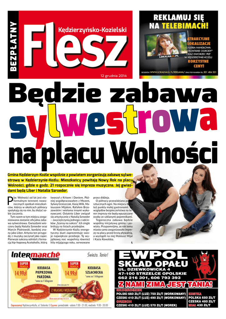 BE Z PŁATNY Kędzierzyńsko-Kozielski 12 grudnia 2014 Będzie zabawa a w o r t s sylwe na placu Wolności Gmina Kędzierzyn-Koźle wspólnie z powiatem zorganizują zabawę sylwestrową w Kędzierzynie-Koźlu. Mieszkańcy powitają Nowy Rok na placu Wolności, gdzie o godz. 21 rozpocznie się impreza muzyczna. Jej gwiazdami będą Liber i Natalia Szroeder. P lac Wolności od lat jest nieformalnym terenem noworocznych spotkań mieszkańców, którzy w okolicach północy spotykają się na nim, by złożyć sobie życzenia. Tym razem w tym miejscu zorganizowana zostanie oficjalna zabawa sylwestrowa. Gwiazdami wieczoru będą Natalia Szroeder oraz Marcin Piotrowski, bardziej znany jako Liber. Artysta ten przygodę z muzyką zaczynał jako raper. Pierwsze sukcesy odniósł z formacją hip-hopową Acetoholix, którą tworzył z Krisem i Doniem. Później współpracowałem z Mezem, Sylwią Grzeszczak, Kasią Wilk, Mateuszem Mijalem, Rafałem Brzozowskim i wieloma innymi wykonawcami. Ostatnio Liber związał się artystycznie z Natalią Szroeder – zwyciężczynią jednego z odcinków „Szansy na sukces”. Ich single królują na listach przebojów. W Kędzierzynie-Koźlu energetyczny duet zaprezentuje swoje największe przeboje. Tę wyjątkową noc wypełnią również hity mijającego roku, serwowane przez didżeja. O północy przewidziano pokaz sztucznych ogni. Na miejscu będą też punkty małej gastronomii. Ze względów bezpieczeństwa na teren imprezy nie będą wpuszczane osoby ze szklanymi pojemnikami. Tegoroczna zabawa będzie wspólną inicjatywą gminy i powiatu. Przypomnijmy, ze rok temu miasto samo zorganizowało imprezę na placu przed krytą pływalnią, a wystąpili na niej Mateusz Mijal i Kasia Kowalska. Ł EWPOL SKŁAD OPAŁU UL. DZIEWKOWICKA 4 47-100 STRZELCE OPOLSKIE 662 216 301, 606 793 393 Z NAMI ZIMA JEST TANIA! EKOGROSZEK POLSKI 660 ZŁ/T (LUZ) 750 ZŁ/T (WORKOWANY) CZESKI 410 ZŁ/T (LUZ) 490 ZŁ/T (WORKOWANY) ORZECH CZESKI 410 ZŁ/T (LUZ) 570 ZŁ/T (WOREK) KOSTKA POLSKA 680 ZŁ/T CZESKA 480 ZŁ/T MIAŁ 430 ZŁ/T 2 12 grudnia 2014 Zbiórka karmy dla schroniska Idzie nowe w magistracie Prezydent zaprzysiężona. Czekają na naszą pomoc Zastępcy powołani Schronisko dla bezdomnych zwierząt w Kędzierzynie-Koźlu, jak co roku, szykuje się do zimy. To najtrudniejszy okres w funkcjonowaniu placówSabina Nowosielska oficjalnie objęła stanowi- ki, ponieważ trzeba zgromadzić karmę. sko prezydenta Kędzierzyna-Koźla. Poznaliśmy zworonogi, jak zawsze, mogą liczyć na wsparcie mieszkańców. też jej zastępców, którymi zostali Artur MaruszPotrzeba naprawdę niewiele, aby czak i Wojciech Jagiełło. zwierzę czuło się kochane i bez- C P rezydent elekt została zaprzysiężona podczas sesji rady miasta, która odbyła się 8 grudnia w kozielskim magistracie. Sabina Nowosielska złożyła przysięgę i tym samym oficjalnie zaczęła pełnić urząd prezydenta miasta. Kilkadziesiąt godzin później oficjalnie przedstawiła swoich współpracowników. Zastępcą prezydenta ds. gospodarki przestrzennej i inwestycyjno-remontowych jest Artur Maruszczak. Były długoletni kierownik wydziału inwestycji i remontów urzędu miasta zastąpił na tym stanowisku Jacka Króla. Z kolei Wojciech Jagiełło będzie zastępcą prezydenta ds. oświatowych i społeczno-gospodarczych. Wieloletni radny i przewodniczący rady miasta w poprzedniej kadencji, a także kontr- kandydat Sabiny Nowosielskiej w wyborach prezydenckich, objął stanowisko po Pawle Ramsie. Formalnie przestał istnieć gabinet prezydencki, powołany przez Tomasza Wantułę. Z jego składu w urzędzie pozostały trzy osoby, ale nie zapadły jeszcze decyzje, co do ich dalej przyszłości w magistracie. Pierwszym, poważnym zadaniem dla nowego prezydenta i zastępców, będzie korekta przyszłorocznego budżetu. Najprawdopodobniej zostanie on uchwalony dopiero w styczniu. Więcej o tematach poruszonych podczas pierwszej konferencji prasowej Sabiny Nowosielskiej będzie można przeczytać w „Nowej Gazecie Lokalnej”. Ł pieczne. – Jeśli chodzi o warunki przebywania zwierząt, to jesteśmy dobrze przygotowani do zimy; zresztą jak co roku. Budy mają podwójne ściany, między którymi znajduje się styropian. Dodatkowo wykładamy je słomą, więc zwierzętom jest ciepło. Jedyne, czego nam brakuje, to karma – mówi Andrzej Zębala, kierownik schroniska. W placówce przebywa około 90 psów. Wykarmienie takiej gromady to nie lada wyzwanie, z którym codziennie muszą się mierzyć pracownicy schroniska. Dlatego każda darowizna jest mile widziana. Potrzebne są przede wszystkim puszki, sucha karma, ryż i kasze. Przydałyby się również małe ręczniki. Pomóc można też w inny sposób – przygarniając jednego z podopiecznych schroniska. Załatwienie formalności trwa około pięciu minut. Czworonogi są zdrowe, odrobaczone i zaczipowane. Adopcja jest darmowa, a jeśli ktoś chciałby zapłacić Czworonogi ze schroniska czekają na naszą pomoc. za pieska, to może to zrobić w formie darowizny. Schronisko przy ul. Gliwickiej 20 czynne jest od poniedziałku do piątku w godz. 7-15, a w weekendy i święta w godz. 8-15. Kontakt telefoniczny: 774838528 lub 604229691. AJ Nagrody dla Grupy Azoty Prezydent Sabina Nowosielska i jej zastępcy: Artur Maruszczak (z lewej) i Wojciech Jagiełło. „Flesz” – ukazuje się w Kędzierzynie-Koźlu i Powiecie Kędzierzyńsko-Kozielskim www.tygodnikflesz.pl Adres redakcji: ul. Grunwaldzka 76, 47-220 Kędzierzyn-Koźle Tel./fax (77) 483-40-49 E-mail: [email protected] Redaktor naczelny: Grzegorz Łabaj Sekretarz redakcji: Grzegorz Stępień Projekt graficzny i skład: greatio.com, tel. 601-422-132; Reklama: tel. 501 404 321, (77) 481-99-76 Wydawca: Lokalna Sp. z o.o. e-mail: [email protected] Adres: ul. Grunwaldzka 76, 47-220 Kędzierzyn-Koźle Tel.: (77) 483-46-59 Redakcja nie zwraca materiałów niezamówionych oraz zastrzega sobie prawo do redagowania i skrac