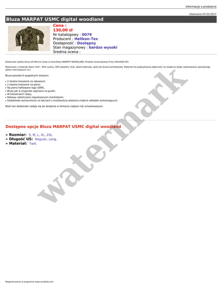 Informacje o produkcie Utworzono 07-03-2017 Bluza MARPAT USMC digital woodland Cena : 130,00 zł Nr katalogowy : 0079 Producent : Helikon-Tex Dostępność : Dostępny Stan magazynowy : bardzo wysoki Średnia ocena : Doskonała replika bluzy US Marine Corps w kamuflażu MARPAT WOODLAND. Produkt renomowanej firmy HEILKON-TEX. Wykonana z materiału Nyco Twill - 50% nylonu, 50% bawełny. Krój, skład materiału, splot jak bluzie kontraktowej. Materiał ma podwyższoną odporność na rozdarcia dzięki zastosowaniu specjalnego splotu mocniejszych nici. Bluza posiada 6 wygodnych kieszeni: ● ● ● ● ● ● 2 skośne kieszenie na rękawach, 2 skośne kieszenie na piersi, Na piersi haftowane logo USMC, Bluza jak w oryginale zapinana na guziki, W kieszenaich rzepy, Rękawy zakończone regulowanymi mankietami, Dodatkowe wzmocnienia na łokciach z możliwością włożenia miękich wkładek ochraniających. er m ar k ● Wzór ten doskonale nadaje się do działania w klimacie ciepłym lub umiarkowanym. Dostępne opcje Bluza MARPAT USMC digital woodland w at » Rozmiar: S, M, L, XL, 2XL. » Długość US: Regular, Long. » Materiał: Twill. Wygenerowano w programie www.oscGold.com