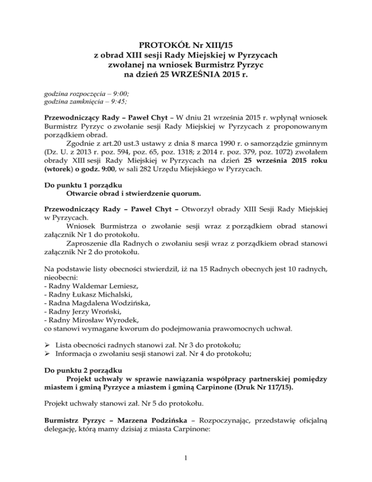 PROTOKÓŁ Nr XIII/15 z obrad XIII sesji Rady Miejskiej w Pyrzycach zwołanej na wniosek Burmistrz Pyrzyc na dzień 25 WRZEŚNIA 2015 r. godzina rozpoczęcia – 9:00; godzina zamknięcia – 9:45; Przewodniczący Rady – Paweł Chyt – W dniu 21 września 2015 r. wpłynął wniosek Burmistrz Pyrzyc o zwołanie sesji Rady Miejskiej w Pyrzycach z proponowanym porządkiem obrad. Zgodnie z art.20 ust.3 ustawy z dnia 8 marca 1990 r. o samorządzie gminnym (Dz. U. z 2013 r. poz. 594, poz. 65, poz. 1318; z 2014 r. poz. 379, poz. 1072) zwołałem obrady XIII sesji Rady Miejskiej w Pyrzycach na dzień 25 września 2015 roku (wtorek) o godz. 9:00, w sali 282 Urzędu Miejskiego w Pyrzycach. Do punktu 1 porządku Otwarcie obrad i stwierdzenie quorum. Przewodniczący Rady – Paweł Chyt – Otworzył obrady XIII Sesji Rady Miejskiej w Pyrzycach. Wniosek Burmistrza o zwołanie sesji wraz z porządkiem obrad stanowi załącznik Nr 1 do protokołu. Zaproszenie dla Radnych o zwołaniu sesji wraz z porządkiem obrad stanowi załącznik Nr 2 do protokołu. Na podstawie listy obecności stwierdził, iż na 15 Radnych obecnych jest 10 radnych, nieobecni: - Radny Waldemar Lemiesz, - Radny Łukasz Michalski, - Radna Magdalena Wodzińska, - Radny Jerzy Wroński, - Radny Mirosław Wyrodek, co stanowi wymagane kworum do podejmowania prawomocnych uchwał. Lista obecności radnych stanowi zał. Nr 3 do protokołu; Informacja o zwołaniu sesji stanowi zał. Nr 4 do protokołu; Do punktu 2 porządku Projekt uchwały w sprawie nawiązania współpracy partnerskiej pomiędzy miastem i gminą Pyrzyce a miastem i gminą Carpinone (Druk Nr 117/15). Projekt uchwały stanowi zał. Nr 5 do protokołu. Burmistrz Pyrzyc – Marzena Podzińska – Rozpoczynając, przedstawię oficjalną delegację, którą mamy dzisiaj z miasta Carpinone: 1 - Pan Burmistrz Carpinone – Pasquale Sarao; - Kierownik Zespołu folklorystycznego Ru Maccature – Michele Castrilli, który był radnym i jest również szefem organizacji folklorystycznej regionu Molise. Przedkładam dzisiaj Państwu uchwałę o nawiązaniu współpracy partnerskiej pomiędzy miastem i Gminą Pyrzyce jak również miastem i Gminą Carpinone. Uchwała ta to jest intencja zawarcia porozumienia, jak również upoważnia mnie – burmistrza do podpisania umowy partnerskiej, w której zawarliśmy wszystkie ważne, ogólne informacje dotyczące współpracy we wszystkich dziedzinach, bo współpraca z miastem Carpinone do tej pory jest to współpraca dwóch zespołów: Zespołu Pieśni i Tańca Pyrzyce (bardzo serdecznie dziś ich tutaj witamy), jak również Zespołu Folklorystycznego miasta Carpinone, czyli zespołu Ru Maccature. Może krótko powiem o historii, bo dłużej powie ktoś inny. W sierpniu 2011 r. został podpisany list intencyjny pomiędzy ówczesnym burmistrzem Jerzym Markiem Olechem i obecnym tutaj burmistrzem Pasquale Sarao. Ten list intencyjny obejmował partnerstwo miasta Pyrzyce i miasta Carpinone, ale po naszej stronie nie zostało to sformalizowane w związku z tym postanowiłam dzisiaj, korzystając z obecności delegacji u nas, przedłożyć Państwu uchwałę, bo zgodnie z ustawą o samorządzie gminnym to Rada Gminy podejmuje uchwały o partnerstwie między państwami. To partnerstwo poszerzyłam o Gminę Pyrzyce, żeby mogli z niej korzystać nie tylko mieszkańcy miasta, ale również mieszkańcy miasta i Gminy Pyrzyce, jak również miasta i Gminy Carpinone. W załączeniu przedłożyłam Państwu umowę o współpracy, która zostanie podpisana. Chciałabym, żeby krótką historię przedstawiła nam Pani Anna Bajon – znana wszystkim Pyrzyczanom ze swojej działalności, jako wieloletni nauczyciel, wychowawca, ale znana przede wszystkim ze swego dorobku dla naszego pyrzyckiego folkloru, bo ponad 27 lat prowadzi zespoły ludowe. Powyżej 20-stu lat Zespół Małe Pyrzyce, jak również Zespół Pieśni i Tańca Pyrzyce. Pani Ania, która te kontakty, tą współpracę rozpoczynała i do dzisiaj utrzymuje bardzo dobre kontakty z korzyścią dla naszego miasta i Gminy, za to jej bardzo serdecznie dziękuję, przedstawi krótką historię tej współpracy, jak również krótką historię miasta i Gminy Carpinone, żebyście Państwo mogli zobaczyć tą drugą stronę, jak również to, co do tej pory zostało osiągnięte, a jak Państwo zobaczycie to tego jest naprawdę wiele i możemy być z tego dumni. Po prezentacji będę chciała, żeby głos zabrał Pan Burmistrz, który będzie chciał z nami podzielić się swoimi wrażeniami pobytu, jak dotychczasowej współpracy i tego jak tą współpracę dalej widzi. Także ja oddaję głos Pani Annie Bajon. Pani Anna Bajon – Omówiła przygotowaną prezentację o mieście Carpinone. Burmistrz Pyrzyc – Marzena Podzińska – Pani Aniu, bardzo serdecznie dziękuję, uważam, że było to potrzebne nam wszystkim i cieszę się, że są media, które o tym będą mogły napisać, że jest tak piękna i bogata historia współpracy naszego zespołu z zespołem Ru Maccature. To prawda, że jak jest się tam na miejscu, ja w tym roku byłam, tak jak Państwo już słyszeliście, otrzymałam zaproszenie od Pana Burmistrza, z którego skorzystałam i faktycznie Pyrzyce kojarzone jest tak jak rodzina. Bardzo mile wspomina się o Pyrzycach, to jest bardzo ważne, że gdzieś, gdzie jesteśmy daleko, ktoś mówi o nas tak dobrze, wspomina nas, mówi o naszym zespole, 2 z którego jesteśmy dumni, a nie zawsze słyszymy to u siebie. Także bardzo ważne jest to, żeby zobaczyć i czasami docenić gdzieś dalej to, co mamy pięknego u nas i z tego się bardzo cieszę i naprawdę wrażenia były bardzo piękne. Jeszcze raz Pani Aniu bardzo serdecznie dziękuję i przekażę teraz głos Panu Burmistrzowi, bo na pewno będzie chciał odnieść się do prezentacji, jak również do tej współpracy. Burmistrz Carpinone – Pasquale Sarao – Dzień dobry, witam wszystkich przedstawicieli gminy, wszystkie 