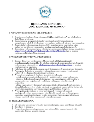 REGULAMIN KONKURSU „MÓJ KAWAŁEK MYSŁOWIC” I POSTANOWIENIA OGÓLNE. CEL KONKURSU. 1. Organizatorem konkursu fotograficznego „Mój kawałek Mysłowic” jest Młodzieżowa Rada Miasta Mysłowice. 2. Celem konkursu jest: podniesienie aktywności społeczności lokalnej poprzez zaangażowanie młodych Mysłowiczan w wyszukanie ulubionych miejsc w naszym mieście. 3. Za uczestnika konkursu uznaję się osobę, która na podany przez organizatora adres mailowy, w określonym w regulaminie terminie prześle „fotografię konkursową”. 4. Komunikaty i informacje związane z konkursem umieszczane będą na fanpage organizatora: https://www.facebook.com/MlodziezowaRadaMiastaMyslowice (jest to zarazem platforma, na której przebiega konkurs). II WARUNKI UCZESTNICTWA W KONKURSIE. 1. Konkurs skierowany jest do uczniów Mysłowickich szkół gimnazjalnych i ponadgimnazjalnych oraz klas 4-6 szkoły podstawowej, którzy prześlą swoją fotografię konkursową na adres mailowy: [email protected] w terminie określonym przez regulamin. 2. Nadesłanie fotografii jest jednoznaczne z potwierdzeniem woli uczestnictwa w konkursie. 3. Przystępując do konkursu uczestnik wyraża zgodę na przetwarzanie swoich danych osobowych w celu prawidłowej realizacji konkursu. 4. W ramach przystąpienia do Konkursu uczestnik oświadcza, że: - posiada pełnię praw autorskich, osobistych i majątkowych do pracy konkursowej, - zgłoszone do Konkursu fotografie konkursowe nie naruszają praw osób trzecich, w szczególności praw majątkowych i osobistych, a także praw autorskich innych podmiotów; - udziela organizatorowi Konkursu bezterminowej i nieodpłatnej zgody na korzystanie z fotografii konkursowych w celu jej publikacji bez ograniczeń czasowych i terytorialnych, z zastrzeżeniem podania nazwiska autora przy publikacji jego fotografii. 5. W przypadku pojawienia się ze strony osób trzecich ewentualnych roszczeń wynikających z tytułu naruszenia praw autorskich lub innych praw osobistych przez uczestnika, uczestnik zobowiązany będzie, jako osoba wyłącznie odpowiedzialna, do pokrycia wszelkich szkód oraz roszczeń odszkodowawczych. III PRACA KONKURSOWA. 1. Jak wcześniej wspomniane było autor musi posiadać pełne prawa autorskie do fotografii. 2. Dowolność w formacie. 3. Fotografia powinna zostać opatrzona w opis miejsca, które przestawia oraz krótkie wyjaśnienie, dlaczego akurat to miejsce. IV KATEGORIE. 1. Prace oceniane będą w 4 kategoriach: a) Szkoła Podstawowa klasy 4-6 b) Gimnazjum c) Szkoła Ponadgimnazjalna d) Nagroda internautów. 2. Wyboru w pierwszych trzech kategoriach dokonają Radni MRMM, natomiast ostatnia z kategorii będzie decyzją internautów, którzy poprzez klikanie „lubię to” zdecydują, która z prac jest najlepsza. V HARMONOGRAM. 1. Termin nadsyłania prac: 15 listopada 2013 roku do godz. 16:00. 2. Czas głosowania dla internautów: od 15 listopada 2013 roku, godz. 16:00 do 22 listopada 2013 roku do godziny 16:00. 3. Ogłoszenie wyników: 22 listopada 2013 roku godz. 16:00. 4. Wręczenie nagród: Najbliższa sesja MRMM po ogłoszeniu wyników. O konkretnym terminie informować będziemy zwycięzców. VI NAGRODY. 1. We wszystkich 4 kategoriach zostaną wybrane 2 najlepsze prace. 2. Dla zwycięzców przygotowane zostaną zaproszenia na sesję MRMM oraz drobne upominki rzeczowe.