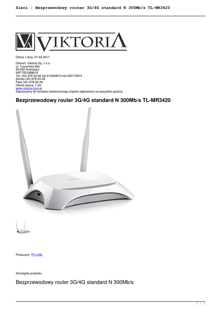 Sieci : Bezprzewodowy router 3G/4G standard N 300Mb/s TL-MR3420 Oferta z dnia: 07-03-2017 Oferent: Viktoria Sp. z o.o. ul. Tuszyńska 28a 95-020 Andrespol NIP:7251888618 Tel. (42) 678-33-60 lub 510209013 lub 500170974 Serwis (42) 678-33-46 Faks (42) 678-33-49 Oferta ważna: 7 dni www.viktoria.com.pl Zapraszamy do kontaktu telefonicznego chętnie odpowiemy na wszystkie pytania. Bezprzewodowy router 3G/4G standard N 300Mb/s TL-MR3420 Producent: TP-LINK Szczegóły produktu Bezprzewodowy router 3G/4G standard N 300Mb/s 1 / 2 Sieci : Bezprzewodowy router 3G/4G standard N 300Mb/s TL-MR3420 TL-MR3420 Wyróżnione funkcje: Kompatybilny z modemami LTE/HSUPA/HSDPA/UMTS/EVDO USB Wykorzystanie zapasowego łącza (3G/4G oraz WAN) zapewnia stałe połączenie z Internetem Przycisk WPS umożliwia szybkie nawiązanie zabezpieczonego połączenia bezprzewodowego Kontrola przepustowości łącza umożliwia administratorom ustalanie limitów ruchu dla poszczególnych stacji roboczych *Kompatybilność z modemami 4G LTE dotyczy WYŁĄCZNIE urządzeń TL-MR3420 w wersji sprzętowej V2 CECHY SPRZĘTOWE Porty Port USB 2.0 do podłączenia modemu USB LTE/HSUPA/HSDPA/UMTS/EVDO 1 port WAN 10/100Mb/s, 4 porty LAN 10/100Mb/s, automatyczna negocjacja szybkości połączeń, automatyczne krosowanie łącza (auto-MDI/MDIX) Przyciski Przycisk WPS/Reset Wyłącznik sieci bezprzewodowej Wyłącznik zasilania Zasilanie 12VDC/1A Wymiary (S x G x W) 204*138*44 mm (8*5.4*1.7 cala) Typ anteny 2 anteny dookólne, dołączalne, złącza SMA RP Zysk anteny 2x5dBi WŁAŚCIWOŚCI TRANSMISJI BEZPRZEWODOWEJ Standardy bezprzewodowe IEEE 802.11n, IEEE 802.11g, IEEE 802.11b Częstotliwość pracy 2,4-2,4835GHz EIRP <20dBm Bezpieczeństwo transmisji bezprzewodowej 64/128 bitowe szyfrowanie WEP, WPA-PSK/WPA2-PSK, filtrowanie adresów MAC FUNKCJE OPROGRAMOWNIA Funkcja Quality of Service WMM Bezpieczeństwo transmisji Zapora sieciowa NAT, SPI, filtrowanie adresów MAC/IP/URL, pakietów i aplikacji; ochrona przed atakami Denial of Service (DoS), SYN Flooding, Ping of Death Zarządzanie Konfiguracja poprzez przeglądarkę internetową (HTTP), aktualizacja oprogramowania przez sieć INNE Certyfikaty CE, FCC, RoHS Zawartość opakowania Bezprzewodowy router 3G/4G, standard N 2 anteny Zasilacz Kabel sieciowy Płyta CD Skrócona instrukcja obsługi Wymagania systemowe Microsoft® Windows® 98SE, NT, 2000, XP, Vista™ lub Windows 7, MAC® OS, NetWare®, UNIX® lub Linux Środowisko pracy Dopuszczalna temperatura pracy: 0℃~40℃ (32℉~104℉) Dopuszczalna temperatura przechowywania: -40℃~70℃ (-40℉~158℉) Dopuszczalna wilgotność powietrza: 10%~90%, niekondensująca Dopuszczalna wilgotność przechowywania: 5%~90%, niekondensująca 2 / 2 Powered by TCPDF (www.tcpdf.org)