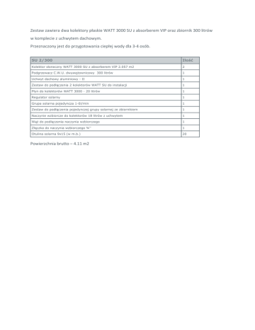 Zestaw zawiera dwa kolektory płaskie WATT 3000 SU z absorberem VIP oraz zbiornik 300 litrów w komplecie z uchwytem dachowym. Przeznaczony jest do przygotowania ciepłej wody dla 3-4 osób. SU 2/300 Ilość Kolektor słoneczny WATT 3000 SU z absorberem VIP 2.057 m2 2 Podgrzewacz C.W.U. dwuwężownicowy 300 litrów 1 Uchwyt dachowy aluminiowy - II 1 Zestaw do podłączenia 2 kolektorów WATT SU do instalacji 1 Płyn do kolektorów WATT 3000 - 20 litrów 1 Regulator solarny 1 Grupa solarna pojedyncza 1-6l/min 1 Zestaw do podłączenia pojedynczej grupy solarnej ze zbiornikiem 1 Naczynie wzbiorcze do kolektorów 18 litrów z uchwytem 1 Wąż do podłączenia naczynia wzbiorczego 1 Złączka do naczynia wzbiorczego ¾'' 1 Otulina solarna 9x15 (w m.b.) 20 Powierzchnia brutto – 4.11 m2