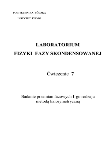 POLITECHNIKA ŁÓDZKA INSTYTUT FIZYKI LABORATORIUM FIZYKI FAZY SKONDENSOWANEJ Ćwiczenie 7 Badanie przemian fazowych I-go rodzaju metodą kalorymetryczną Cel ćwiczenia Celem ćwiczenia jest wyznaczenie temperatury i ciepła właściwego ciał stałych w obecności przejść fazowych . Część teoretyczna Badaną próbkę i substancję wzorcową , w której nie zachodzą żadne przemiany termiczne , ogrzewa się w piecu jednocześnie i w jednakowych warunkach . Zależność temperatury pieca od czasu powinna mieć przy tym charakter liniowy . Dopóki w próbce nie zachodzą żadne reakcje , które przebiegałyby z pochłanianiem lub wydzielaniem ciepła , temperatura próbki i substancji obojętnej są sobie równe ( Ts = Ti ) , a przyrząd pomiarowy nie wykazuje różnicy potencjałów , gdyż T = Ts – Ti = 0 . Jeżeli w próbce zachodzić będzie reakcja endotermiczna , to temperatura próbki będzie utrzymywała się na niższym poziomie niż temperatura substancji obojętnej Ti , Ts Ti ( T = Ts – Ti ) . W przypadkach reakcji egzotermicznej temperatura próbki Ts jest wyższa od temperatury substancji obojętnej . Napięcie odpowiadające różnicy temperatur T ma w tym przypadku znak przeciwny . Wskazania przyrządu pomiarowego rejestruje się automatycznie , otrzymując krzywą T = f ( t ) . E temperatura D C B A czas Przemianom fazowym I-go rodzaju towarzyszy ciepło przemiany ( ilość ciepła , która wydziela się lub jest pochłaniana w stałej temperaturze ) . Jeżeli ogrzewać jakąś substancję w warunkach DTA , tzn. przy stałym doprowadzaniu energii cieplnej z zewnątrz , to jej temperatura rośnie liniowo do temperatury przemiany ( A B ) i utrzymuje się następnie na stałym poziomie do zakłócenia przemiany ( B C ) . Potem podnosi się znowu , początkowo według krzywej wykładniczej ( C D ) , przechodzącej następnie asymetrycznie w linię prostą ( D E ) . Opis układu pomiarowego Prąd elektryczny jest doprowadzany z zasilacza (1) do naczynia wewnętrznego (6) . Zasilacz dostarcza stałej mocy powodując liniowy wzrost temperatury wewnątrz pojemnika miedzianego . Pojemnik aluminiowy na próbkę (7) umieszczony jest w naczyniu wewnętrznym . W badanej substancji umieszczona jest spoina termopary nikiel-chromonikielina , której wolne końce znajdują się w temperaturze odniesienia (mieszanina wody z lodem (9) ). Różnicowa siła elektromotoryczna rejestrowana jest za pomocą rejestratora. Różnica temperatur między naczyniem wewnętrznym (6), a zewnętrznym (5), mierzona za pomocą termopary różnicowej żelazo-konstantan (4), wywołuje reakcję galwanometru (G). Dążymy do tego, aby różnica temperatur między naczyniami była równa zeru. W przypadku, gdy temperatura naczynia zewnętrznego staje się niższa od temperatury naczynia wewnętrznego, następuje przemieszczanie się w lewo ( po skali galwanometru ) plamki świetlnej i w rezultacie oświetlenie czujnika fotoelektrycznego ( fotoopornik FOK ), a dalej włączenie przekaźnika (3). Przekaźnik z kolei zamyka obwód grzejny naczynia zewnętrznego, co w rezultacie prowadzi do wyrównania się temperatur (T= 0). Układ stabilizacji temperatury wolnych końców 00C Rejestrator Galwanometr Przebieg ćwiczenia 1. 2. 3. 4. 5. 6. 7. 8. 9. Zważyć pojemnik aluminiowy oraz badaną substancję Umieścić pojemnik wraz z badaną substancją w naczyniu wewnętrznym Włączyć przesuw papieru w rejestratorze (CHART) Włączyć zasilacze – najpierw od naczynia wewnętrznego, a następnie zewnętrznego Eksperyment prowadzić aż do momentu zakończenia procesu przemiany, kontrolując prawidłowość pracy układu sterowania ( równomiernie powtarzające się załączenia i wyłączenia przekaźnika ) Wyłączyć zasilacze i przesuw papieru Usunąć substancję z pojemnika i ostudzić naczynia Umieścić pusty pojemnik i powtórzyć punkty 3., 4., 5. i 6. Zanotować : masę naczynia, masę próbki, zakres pomiarowy rejestratora, szybkość przesuwu papieru, wartość STE termopary pomiarowej, wartość prądu i napięcia ( mocy) w obwodzie naczynia wewnętrznego Opracowanie sprawozdania 1. W oparciu o obraz zmian temperatury kalorymetru z próbką wyznaczyć temperaturę przejścia fazowego 3. 4. W oparciu o obraz zmian temperatury kalorymetru bez próbki i kalorymetru z próbką, uwidoczniony na rejestrogramach, wykonać wykres pochodnych temperatury po czasie w funkcji czasu ( dT/dt = f(t) ) Określić rodzaj przejścia i typ przemiany Wyznaczyć ciepło przemiany. 1. D. Schultze ,Termiczna analiza różnicowa , PWN, W-wa , 1974 2. Literatura