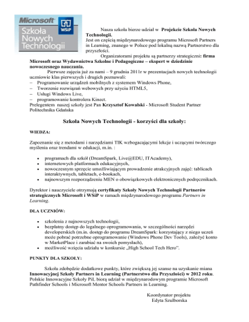 Nasza szkoła bierze udział w Projekcie Szkoła Nowych Technologii. Jest on częścią międzynarodowego programu Microsoft Partners in Learning, znanego w Polsce pod lokalną nazwą Partnerstwo dla przyszłości. Organizatorami projektu są partnerzy strategiczni: firma Microsoft oraz Wydawnictwa Szkolne i Pedagogiczne – ekspert w dziedzinie nowoczesnego nauczania. Pierwsze zajęcia już za nami – 9 grudnia 2011r w prezentacjach nowych technologii uczniowie klas pierwszych i drugich poznawali: Programowanie urządzeń mobilnych z systemem Windows Phone, Tworzenie rozwiązań webowych przy użyciu HTML5, Usługi Windows Live, programowanie kontrolera Kinect. Prelegentem naszej szkoły jest Pan Krzysztof Kowalski - Microsoft Student Partner Politechnika Gdańska Szkoła Nowych Technologii - korzyści dla szkoły: WIEDZA: Zapoznanie się z metodami i narzędziami TIK wzbogacającymi lekcje i uczącymi twórczego myślenia oraz trendami w edukacji, m.in. : programach dla szkół (DreamSpark, Live@EDU, ITAcademy), internetowych platformach edukacyjnych, nowoczesnym sprzęcie umożliwiającym prowadzenie atrakcyjnych zajęć: tablicach interaktywnych, tabletach, e-bookach, najnowszym rozporządzeniu MEN o obowiązkowych elektronicznych podręcznikach. Dyrektor i nauczyciele otrzymają certyfikaty Szkoły Nowych Technologii Partnerów strategicznych Microsoft i WSiP w ramach międzynarodowego programu Partners in Learning. DLA UCZNIÓW: szkolenia z najnowszych technologii, bezpłatny dostęp do legalnego oprogramowania, w szczególności narzędzi developerskich (m.in. dostęp do programu DreamSpark: korzystający z niego uczeń może pobrać potrzebne oprogramowanie (Windows Phone Dev Tools), założyć konto w MarketPlace i zarabiać na swoich pomysłach), możliwość wzięcia udziału w konkursie „High School Tech Hero”. PUNKTY DLA SZKOŁY: Szkoła zdobędzie dodatkowe punkty, które zwiększą jej szanse na uzyskanie miana Innowacyjnej Szkoły Partners in Learning (Partnerstwo dla Przyszłości) w 2012 roku. Polskie Innowacyjne Szkoły PiL biorą udział w międzynarodowym programie Microsoft Pathfinder Schools i Microsoft Mentor Schools Partners in Learning. Koordynator projektu Edyta Szulborska