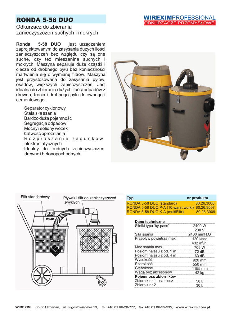 WIREXIMPROFESSIONAL RONDA 5-58 DUO ODKURZACZE PRZEMYS£OWE Odkurzacz do zbierania zanieczyszczeñ suchych i mokrych Ronda 5-58 DUO jest urz¹dzeniem zaprojektowanym do zasysania du¿ych iloœci zanieczyszczeñ bez wzglêdu czy s¹ one suche, czy te¿ mieszanina suchych i mokrych. Maszyna separuje du¿e cz¹stki i ciecze od drobnego py³u bez koniecznoœci martwienia siê o wymianê filtrów. Maszyna jest przystosowana do zasysania py³ów, osadów, wiêkszych zanieczyszczeñ. Jest idealna do zbierania du¿ych iloœci odpadów z drewna, trocin i drobnego py³u drzewnego i cementowego.. ! ! ! ! ! ! ! ! Separator cyklonowy Sta³a si³a ssania Bardzo du¿a pojemnoœæ Segregacja odpadów Mocny i solidny wózek £atwoœæ opró¿niania Rozpraszanie ³adunków elektrostatycznych Idealny do trudnych zanieczyszczeñ drewno i betonopochodnych Typ nr produktu RONDA 5-58 DUO (standard) 80.26.3006 RONDA 5-58 DUO P-A (10-warst worki) 80.26.3007 RONDA 5-58 DUO K-A (multiFiltr) 80.26.3009 Dane techniczne Silniki typu ‘by-pass” Si³a ssania Przep³yw powietrza max. Moc ssania max. Poziom ha³asu z od. 1 m Poziom ha³asu z od. 4 m Wysokoœæ Szerokoœæ G³êbokoœæ Waga bez akcesoriów Pojemnoœæ zbiorników Zbiornik nr 1 - na ciecz Zbiornik nr 2 WIREXIM 60-301 Poznañ, ul. Jugos³owiañska 13, 2400 W 230 V 2400 mmH2O 120 l/sec 432 m3/h. 706 W 72 dB 63 dB 920 mm 550 mm 1155 mm 42 kg 58 l. 30 l. tel. +48 61 66-20-777, fax +48 61 86-55-935, www.wirexim.com.pl WIREXIMPROFESSIONAL RONDA 5-58 DUO Odkurzacz do zbierania zanieczyszczeñ suchych i mokrych ODKURZACZE PRZEMYS£OWE Typ nr produktu Ronda 5-58 DUO RONDA 5-58 DUO (standard) 80.26.3006 RONDA 5-58 DUO P-A (10-warst worki) 80.26.3007 wyposa¿ona jest w dwa zbiorniki 80.26.3009 Zbiornik nr 1 to cyklonowy separator za zwyk³ym filtrem RONDA 5-58 DUO K-A (multiFiltr) separuj¹cym ciecze, zwyk³e zanieczyszczenia, skrawki itp. wiêksze ni¿ 1,5 mm. Tylko najdrobniejsze suche zanieczyszczenia przedostaj¹ siê do zbiornika nr 2. Zbiornik nr 2 wyposa¿ony jest standardowo w zwyk³y filtr tekstylny, który zatrzymuje najmniejsze zanieczyszczenia. Opcjonalnie zbiornik nr 2 mo¿e byæ dostarczony z innym filtrem zaprojektowanym w zale¿noœci od zadania. Filtry standardowe Ronda 5-58 DUO Filtr ciecz/zanieczyszczenie zwyk³e Filtr standardowy 84.67.1058 Filtry standardowe Ronda 5-58 DUO P-A Filtr ciecz/zanieczyszczenie zwyk³e 10-warstwowy worek * Filtr teflonowy Filtr HEPA D-280 RONDA 5-58 DUO P-A z 10 warstwowym workiem do drobnego wilgotnego Filtry standardowe Ronda 5-58 DUO K-A py³u RONDA 5-58 DUO K-A Z Multifiltrem do du¿ych iloœci suchego i bardzo drobnego py³y Do zadañ z du¿¹ iloœci¹ drobnego i/lub niebezpiecznego dla zdrowia py³u najlepszym rozwi¹zaniem jest Ronda z samoczyszcz¹cym Multifiltrem i plastikowym workiem. Maszyna jest dobrze dobrana na przyk³ad dla przemys³u drzewnego w przypadku gdzie wióry jak i drobny py³ musz¹ byæ zassane w du¿ych iloœciach. 84.67.4022 82.64.0051 84.67.1124 84.67.5006 Filtr ciecz/zanieczyszczenie zwyk³e 84.67.4022 84.67.1098 84.67.5007 Zestaw profesjonalny 50 mm 1. Rura metalowa 2. Ssawa szczelinowa 3. Ssawa do py³u 4. Adapter do szczotki do [py³u 5. Rura metalowa 0,25 m 6. Ssawa do pod³óg z w³osiem i kó³kami B-500 7. W¹¿ antystatyczny 5 m, 80.33.5027 80.52.5000 80.34.5000 80.34.5001 80.34.5002 80.52.5020 Wersja jest dobrze dostosowana do zasysania kombinacji MultiFiltr D-440 cieczy i drobnego wilgotnego py³u, Gdzie przeznaczeniem Filtr HEPA D-370 jest zbieranie py³u do jednego worka. 10-warstwowy worek, zatrzymuje wilgoæ, a tak¿e cz¹stki wiêksze ni¿ 3,4 mikrona. Akcesoria standardowe Zbiornik nr 2 jest dostarczany z 10-warstwowym workiem, filtrem powlekanym teflonem i filtrem HEPA, które zapewniaj¹ czystoœæ wydmuchiwanego powietrza nawet w przypadku bardzo drobnych py³ów. 84.67.4022 Akcesoria opcjonalne 84.38.5010 84.54.5022 (Dodatkowo p³atne) ! Rondamatic - kontrola podciœnienia 80.31.0067 ! Licznik godzin pracy 84.31.0022 ! Wê¿yk spustowy do wylewania cieczy, dla zbiornika nr 1 80.30.0020 Zbiornik nr 2 w tej wersji jest montowany z Multifiltrem, zaworem wyrównuj¹cym ciœnienie, certyfikowanym filtrem HEPA i plastikowym workiem. Drobny py³ jest separowany i zbierany do plastikowego worka. WIREXIM 60-301 Poznañ, ul. Jugos³owiañska 13, tel. +48 61 66-20-777, fax +48 61 86-55-935, www.wirexim.com.pl