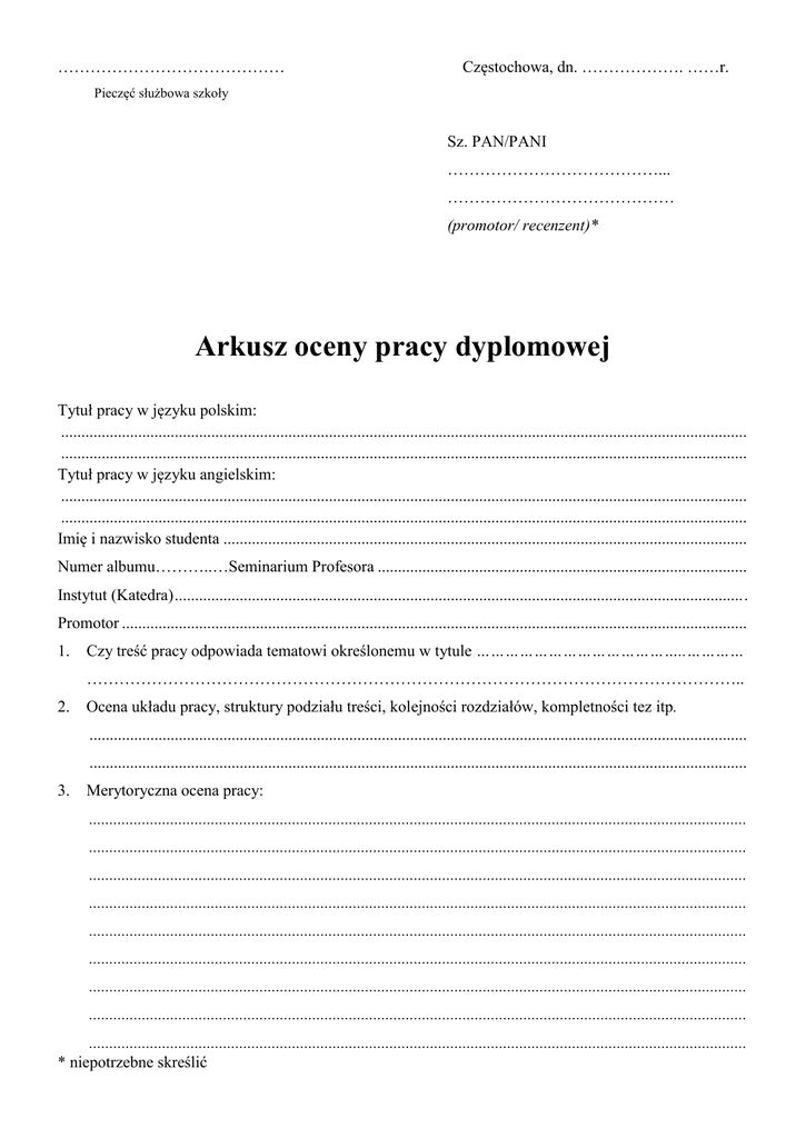 …………………………………… Częstochowa, dn. ………………. ……r. Pieczęć służbowa szkoły Sz. PAN/PANI …………………………………... …………………………………… (promotor/ recenzent)* Arkusz oceny pracy dyplomowej Tytuł pracy w języku polskim: ......................................................................................................................................................................... ......................................................................................................................................................................... Tytuł pracy w języku angielskim: ......................................................................................................................................................................... ......................................................................................................................................................................... Imię i nazwisko studenta ................................................................................................................................. Numer albumu………..…Seminarium Profesora ........................................................................................... Instytut (Katedra) ............................................................................................................................................ . Promotor .......................................................................................................................................................... 1. Czy treść pracy odpowiada tematowi określonemu w tytule ……………………………………..………… ………………………………………………………………………………………………………….. 2. Ocena układu pracy, struktury podziału treści, kolejności rozdziałów, kompletności tez itp. .................................................................................................................................................................. .................................................................................................................................................................. 3. Merytoryczna ocena pracy: .................................................................................................................................................................. .................................................................................................................................................................. .................................................................................................................................................................. .................................................................................................................................................................. .................................................................................................................................................................. .................................................................................................................................................................. .................................................................................................................................................................. .................................................................................................................................................................. .................................................................................................................................................................. * niepotrzebne skreślić 4. Inne uwagi .................................................................................................................................................................. .................................................................................................................................................................. .................................................................................................................................................................. .................................................................................................................................................................. 5. Czy i w jakim zakresie praca stanowi nowe ujęcie problemu .................................................................................................................................................................. .................................................................................................................................................................. .................................................................................................................................................................. 6. Charakterystyka doboru i wykorzystania źródeł .................................................................................................................................................................. .................................................................................................................................................................. .................................................................................................................................................................. 7. Ocena formalnej strony pracy (poprawność języka, opanowanie techniki pisania pracy, spis rzeczy, odsyłacze) .................................................................................................................................................................. .....................................................................................................................................