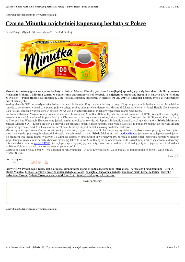Czarna Minutka najchętniej kupowaną herbatą w Polsce - Biznes Śląski | Silesia Business 27.11.2014, 23:27 Wydruk pochodzi ze strony www.biznesslaski.pl Czarna Minutka najchętniej kupowaną herbatą w Polsce Dodał Patryk Młynek, 20 listopada, o 00 : 04 AM Drukuj Mokate to czołowy gracz na rynku herbaty w Polsce. Marka Minutka jest trzecim najlepiej sprzedającym się brandem (nie licząc marek własnych) Mokate, a Minutka czarna w opakowaniu zawierającym 100 torebek to najchętniej kupowana herbata w naszym kraju (Mokate za Nielsen – Panel Handlu Detalicznego, Cała Polska, sprzedaż ilościowa w okresie DJ-AS 2014 w kategorii herbat, rynek z wyłączeniem marek własnych) Według danych GUS, w zeszłym roku Polska sprowadziła łącznie 32 tysiące ton herbaty z czego 28 tysięcy stanowiła herbata czarna. Jej udział w sprzedaży detalicznej wynosi dziś ponad połowę całego rynku, którego wiceliderem jest Mokate (Mokate za Nielsen – Panel Handlu Detalicznego, Cała Polska, sprzedaż wartościowa w okresie DJ-AS 2014 w kategorii herbat, rynek z wyłączeniem marek własnych). Portfolio herbaciane Mokate to trzy popularne marki – ekonomiczne Minutka i Babcia Jagoda oraz brand premium – LOYD. Wszystkie one znajdują uznanie w oczach klientów także poza Polską. – Obecnie nasze herbaty cieszą się olbrzymim uznaniem w Słowenii, Serbii, Słowenii, Czechach czy na Słowacji i na Węgrzech. Eksportujemy jednak bardzo szeroko, bo również do Japonii, Tajlandii, Islandii czy Urugwaju – mówi Sylwia Mokrysz z zarządu Mokate S.A. – Liczba krajów, do których eksportujemy obecnie nasze herbaty, stale rośnie. Dziś jest to ponad 60 państw, do których Mokate regularnie sprzedaje produkty. Co ciekawe, w 99 proc. firmowy eksport herbat stanowią produkty markowe. Mimo zagranicznych sukcesów, to polski rynek jest dla firmy najważniejszy. – Od lat utrzymujemy stabilną, bardzo wysoką pozycję zarówno jeżeli chodzi o sprzedaż poszczególnych produktów, jak i całych marek – mówi Sylwia Mokrysz. I tak marka Minutka jest trzecim najlepiej sprzedającym się brandem (nie licząc marek własnych), a Minutka czarna w opakowaniu zawierającym 100 torebek to najchętniej kupowana herbata w naszym kraju. Dużym uznaniem w oczach klientów cieszy się także ta sama Minutka, tylko w opakowaniu z 40 saszetkami, a także jej wariant cytrynowy. Jeżeli chodzi z kolei o markę LOYD, to najlepiej sprzedają się jej warianty owocowe – malina z truskawką, jeżyna z jagodą oraz truskawka z jabłkiem. Cała marka z roku na rok zyskuje na popularności. Wartość polskiego rynku herbaty – wg Euromonitor International – w 2013 r. wyniosła ok. 2,185 mld zł. W tym roku ma to być ok. 2,183 mld zł. źródło: Mokate Share 0 Podziel się na: Firmy NEWS Produkcyjne Teksty Babcia Jagoda, ekonomiczna marka Minutka, Euromonitor International, herbaciany brand premium – LOYD, Marka Minutka, Mokate - czołowy gracz na rynku herbaty w Polsce, najchętniej kupowana herbata, popularne marki herbat w Polsce, Portfolio herbaciane Mokate, Sylwia Mokrysz z zarządu Mokate S.A., Wartość polskiego rynku herbaty Nasi Partnerzy Wydruk pochodzi ze strony www.biznesslaski.pl http://www.biznesslaski.pl/2014/11/20/czarna-minutka-najchetniej-kupowana-herbata-w-polsce/ Strona 1 z 1