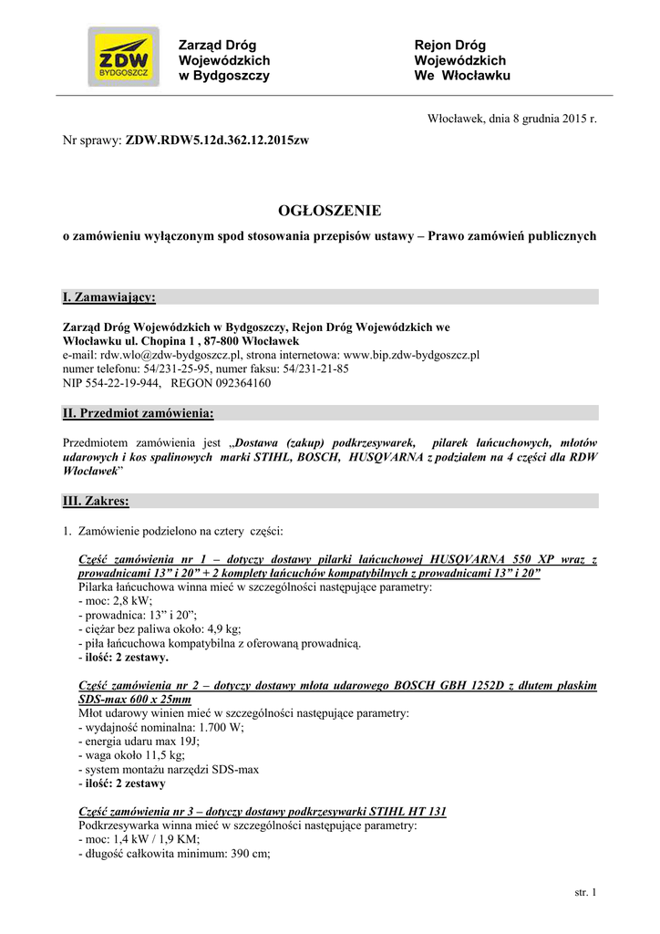 Zarząd Dróg Wojewódzkich w Bydgoszczy Rejon Dróg Wojewódzkich We Włocławku Włocławek, dnia 8 grudnia 2015 r. Nr sprawy: ZDW.RDW5.12d.362.12.2015zw OGŁOSZENIE o zamówieniu wyłączonym spod stosowania przepisów ustawy – Prawo zamówień publicznych I. Zamawiający: Zarząd Dróg Wojewódzkich w Bydgoszczy, Rejon Dróg Wojewódzkich we Włocławku ul. Chopina 1 , 87-800 Włocławek e-mail: [email protected], strona internetowa: www.bip.zdw-bydgoszcz.pl numer telefonu: 54/231-25-95, numer faksu: 54/231-21-85 NIP 554-22-19-944, REGON 092364160 II. Przedmiot zamówienia: Przedmiotem zamówienia jest „Dostawa (zakup) podkrzesywarek, pilarek łańcuchowych, młotów udarowych i kos spalinowych marki STIHL, BOSCH, HUSQVARNA z podziałem na 4 części dla RDW Włocławek” III. Zakres: 1. Zamówienie podzielono na cztery części: Część zamówienia nr 1 – dotyczy dostawy pilarki łańcuchowej HUSQVARNA 550 XP wraz z prowadnicami 13” i 20” + 2 komplety łańcuchów kompatybilnych z prowadnicami 13” i 20” Pilarka łańcuchowa winna mieć w szczególności następujące parametry: - moc: 2,8 kW; - prowadnica: 13” i 20”; - ciężar bez paliwa około: 4,9 kg; - piła łańcuchowa kompatybilna z oferowaną prowadnicą. - ilość: 2 zestawy. Część zamówienia nr 2 – dotyczy dostawy młota udarowego BOSCH GBH 1252D z dłutem płaskim SDS-max 600 x 25mm Młot udarowy winien mieć w szczególności następujące parametry: - wydajność nominalna: 1.700 W; - energia udaru max 19J; - waga około 11,5 kg; - system montażu narzędzi SDS-max - ilość: 2 zestawy Część zamówienia nr 3 – dotyczy dostawy podkrzesywarki STIHL HT 131 Podkrzesywarka winna mieć w szczególności następujące parametry: - moc: 1,4 kW / 1,9 KM; - długość całkowita minimum: 390 cm; str. 1 - wysięgnik teleskopowy; - ciężar bez paliwa, prowadnicy i piły łańcuchowej około: 7,8 kg. - ilość: 2 szt. Część zamówienia nr 4 – dotyczy dostawy kosy mechanicznej STIHL FS 240 Kosa winna mieć w szczególności następujące parametry: - moc: 1,7 kW / 2,3 KM; - standardowe narzędzie tnące: głowica żyłkowa AC 40-2 - pojemność skokowa: 37,7 cm3; - - ciężar bez paliwa, bez narzędzia tnącego i osłony: około: 7,0 kg. - ilość: 3 szt. 2. Zamawiający wymaga dostawy w dniach od poniedziałku do piątku w godzinach pracy RDW Włocławek tj. od 700 do 1500. 3. Oferowany przez Wykonawcę przedmiot zamówienia powinien odpowiadać co do jakości wymogom wyrobów dopuszczonych do obrotu. 4. Koszt transportu i ubezpieczenia towaru na czas transportu obciążają Wykonawcę. Zamówienie ma być dostarczone do siedziby Zamawiającego mieszczącej się pod następującym adresem: Zarząd Dróg Wojewódzkich w Bydgoszczy Rejon Dróg Wojewódzkich we Włocławku, ul. Chopina 1, 87-800 Włocławek. 5. Wymaga się aby dostarczony przedmiot zamówienia był w opakowaniu producenta. 6. Wykonawca udziela 24 miesięcznej gwarancji na przedmiot dostawy. 7. Oferowany przedmiot zamówienia musi być fabrycznie nowy bez śladów użytkowania, posiadać instrukcję oraz dokumenty gwarancyjne w języku polskim. 8. Wykonawca może złożyć ofertę na jedną, dwie, trzy lub cztery części zamówienia. W przypadku złożenia oferty na dwie, trzy lub cztery części Wykonawca nie musi składać dokumentów o których mowa w VIII pkt 3 niniejszego ogłoszenia dla każdej części oddzielnie – skuteczne będzie złożenie w/w dokumentów wyłącznie z ofertą na jedną część. IV. Formularz ofertowy należy przesłać na adres: Zarząd Dróg Wojewódzkich w Bydgoszczy Rejon Dróg Wojewódzkich we Włocławku ul. Chopina 1, 87-800 Włocławek Oferty można składać również poprzez: - złożenie osobiste w sekretariacie RDW Włocławek, - za pośrednictwem fax-u (54 231-21-85), - za pośrednictwem poczty elektronicznej (e-mail: [email protected]). V. Osoba prowadząca sprawę: - w sprawach merytorycznych Sławomir Woźniak – kierownik RDW Włocławek, - w sprawach proceduralnych Wojciech Barganowski – kontakt codziennie w godz. pracy RDW: 700-1500. VI. Termin realizacji zamówienia: Wymaga się zrealizowania zamówienia w terminie od dnia podpisania umowy do 21.12.2015 r. VII. Warunki płatności: str. 2