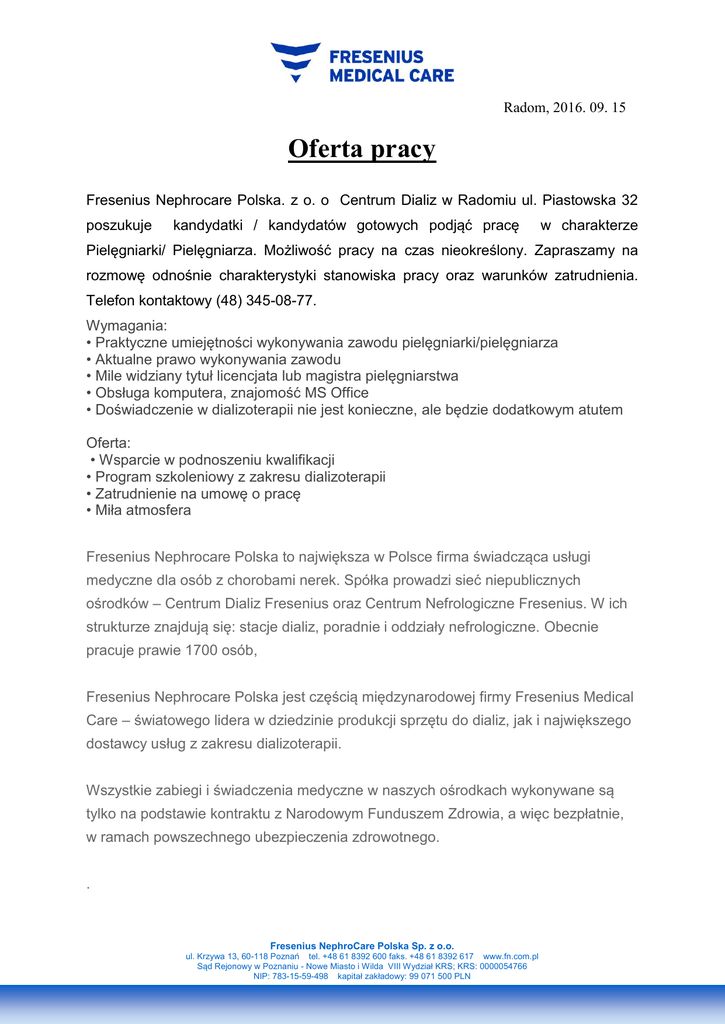 Radom, 2016. 09. 15 Oferta pracy Fresenius Nephrocare Polska. z o. o Centrum Dializ w Radomiu ul. Piastowska 32 poszukuje kandydatki / kandydatów gotowych podjąć pracę w charakterze Pielęgniarki/ Pielęgniarza. Możliwość pracy na czas nieokreślony. Zapraszamy na rozmowę odnośnie charakterystyki stanowiska pracy oraz warunków zatrudnienia. Telefon kontaktowy (48) 345-08-77. Wymagania: • Praktyczne umiejętności wykonywania zawodu pielęgniarki/pielęgniarza • Aktualne prawo wykonywania zawodu • Mile widziany tytuł licencjata lub magistra pielęgniarstwa • Obsługa komputera, znajomość MS Office • Doświadczenie w dializoterapii nie jest konieczne, ale będzie dodatkowym atutem Oferta: • Wsparcie w podnoszeniu kwalifikacji • Program szkoleniowy z zakresu dializoterapii • Zatrudnienie na umowę o pracę • Miła atmosfera Fresenius Nephrocare Polska to największa w Polsce firma świadcząca usługi medyczne dla osób z chorobami nerek. Spółka prowadzi sieć niepublicznych ośrodków – Centrum Dializ Fresenius oraz Centrum Nefrologiczne Fresenius. W ich strukturze znajdują się: stacje dializ, poradnie i oddziały nefrologiczne. Obecnie pracuje prawie 1700 osób, Fresenius Nephrocare Polska jest częścią międzynarodowej firmy Fresenius Medical Care – światowego lidera w dziedzinie produkcji sprzętu do dializ, jak i największego dostawcy usług z zakresu dializoterapii. Wszystkie zabiegi i świadczenia medyczne w naszych ośrodkach wykonywane są tylko na podstawie kontraktu z Narodowym Funduszem Zdrowia, a więc bezpłatnie, w ramach powszechnego ubezpieczenia zdrowotnego. . Fresenius NephroCare Polska Sp. z o.o. ul. Krzywa 13, 60-118 Poznań tel. +48 61 8392 600 faks. +48 61 8392 617 www.fn.com.pl Sąd Rejonowy w Poznaniu - Nowe Miasto i Wilda VIII Wydział KRS; KRS: 0000054766 NIP: 783-15-59-498 kapitał zakładowy: 99 071 500 PLN