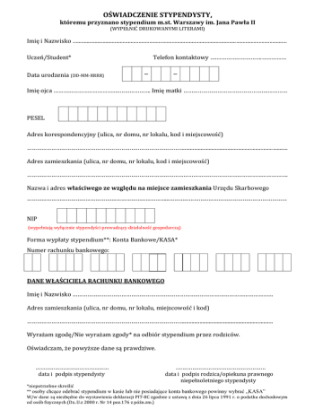 OŚWIADCZENIE STYPENDYSTY, któremu przyznano stypendium m.st. Warszawy im. Jana Pawła II (WYPEŁNIĆ DRUKOWANYMI LITERAMI) Imię i Nazwisko …............................................................................................................................................................. Uczeń/Student* Data urodzenia (DD-MM-RRRR) Telefon kontaktowy ….……………………….…………… Imię ojca …………………………………..………………. Imię matki …………………………………………….………… PESEL Adres korespondencyjny (ulica, nr domu, nr lokalu, kod i miejscowość) …………………………………………………………………………………….............................................................................. Adres zamieszkania (ulica, nr domu, nr lokalu, kod i miejscowość) ……………………………………………………………………………………………………………………………………………. Nazwa i adres właściwego ze względu na miejsce zamieszkania Urzędu Skarbowego ……………………………………………….…………………………...……………………………………………………………… NIP (wypełniają wyłącznie stypendyści prowadzący działalność gospodarczą) Forma wypłaty stypendium**: Konta Bankowe/KASA* Numer rachunku bankowego: DANE WŁAŚCICIELA RACHUNKU BANKOWEGO Imię i Nazwisko …………………………………………………………………………………………………………… Adres zamieszkania (ulica, nr domu, nr lokalu, miejscowość i kod) ……………………………………………………………………………………................................................................... Wyrażam zgodę/Nie wyrażam zgody* na odbiór stypendium przez rodziców. Oświadczam, że powyższe dane są prawdziwe. ……………………………………… data i podpis stypendysty .……………………………………………… data i podpis rodzica/opiekuna prawnego niepełnoletniego stypendysty *niepotrzebne skreślić ** osoby chcące odebrać stypendium w kasie lub nie posiadające konta bankowego powinny wybrać „KASA” W/w dane są niezbędne do wystawienia deklaracji PIT-8C zgodnie z ustawą z dnia 26 lipca 1991 r. o podatku dochodowym od osób fizycznych (Dz..U.z 2000 r. Nr 14 poz.176 z późn.zm.)