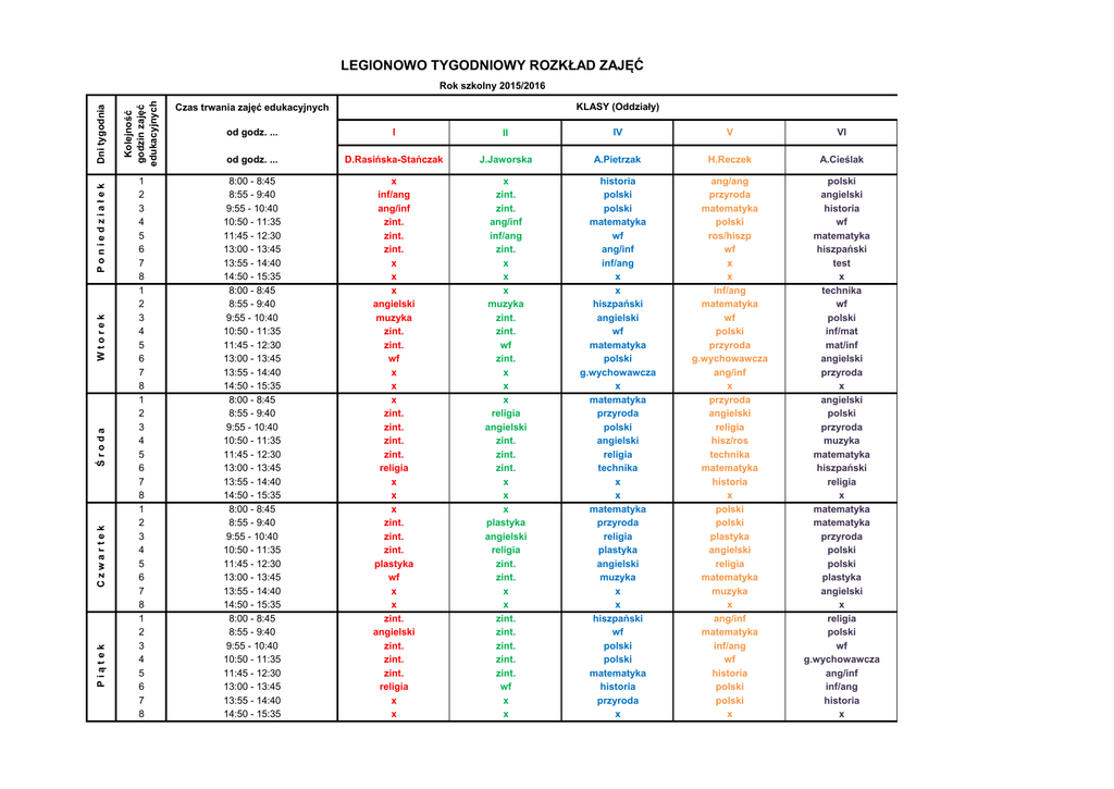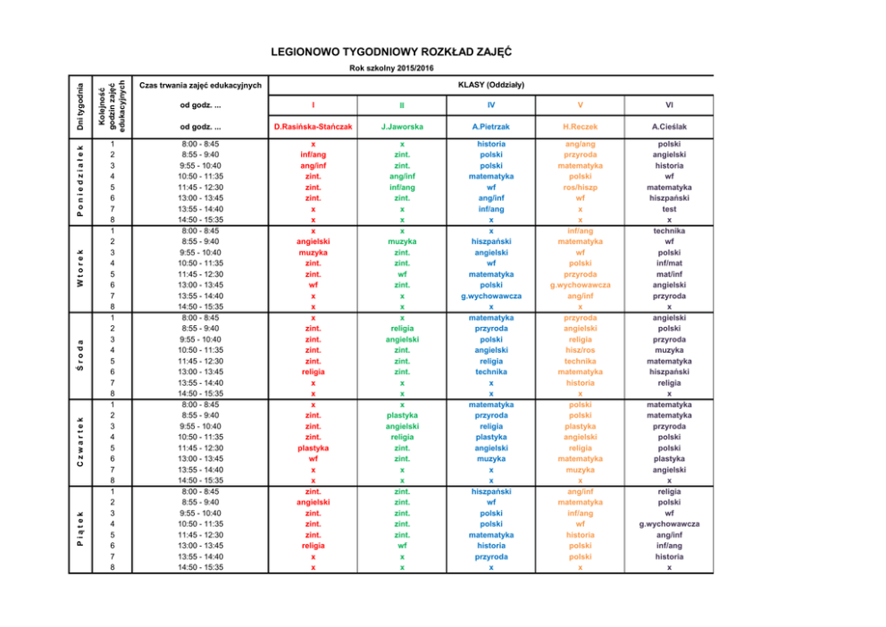 LEGIONOWO TYGODNIOWY ROZKŁAD ZAJĘĆ Kolejność godzin zajęć edukacyjnych Piątek Czwartek Środa Wtorek Poniedziałek Dni tygodnia Rok szkolny 2015/2016 Czas trwania zajęć edukacyjnych od godz. ... I II IV V VI od godz. ... D.Rasińska-Stańczak J.Jaworska A.Pietrzak H.Reczek A.Cieślak 1 2 3 4 5 6 7 8 1 2 3 4 5 6 7 8 1 2 3 4 5 6 7 8 1 2 3 4 5 6 7 8 1 2 3 4 5 6 7 8 8:00 - 8:45 8:55 - 9:40 9:55 - 10:40 10:50 - 11:35 11:45 - 12:30 13:00 - 13:45 13:55 - 14:40 14:50 - 15:35 8:00 - 8:45 8:55 - 9:40 9:55 - 10:40 10:50 - 11:35 11:45 - 12:30 13:00 - 13:45 13:55 - 14:40 14:50 - 15:35 8:00 - 8:45 8:55 - 9:40 9:55 - 10:40 10:50 - 11:35 11:45 - 12:30 13:00 - 13:45 13:55 - 14:40 14:50 - 15:35 8:00 - 8:45 8:55 - 9:40 9:55 - 10:40 10:50 - 11:35 11:45 - 12:30 13:00 - 13:45 13:55 - 14:40 14:50 - 15:35 8:00 - 8:45 8:55 - 9:40 9:55 - 10:40 10:50 - 11:35 11:45 - 12:30 13:00 - 13:45 13:55 - 14:40 14:50 - 15:35 x inf/ang ang/inf zint. zint. zint. x x x angielski muzyka zint. zint. wf x x x zint. zint. zint. zint. religia x x x zint. zint. zint. plastyka wf x x zint. angielski zint. zint. zint. religia x x x zint. zint. ang/inf inf/ang zint. x x x muzyka zint. zint. wf zint. x x x religia angielski zint. zint. zint. x x x plastyka angielski religia zint. zint. x x zint. zint. zint. zint. zint. wf x x historia polski polski matematyka wf ang/inf inf/ang x x hiszpański angielski wf matematyka polski g.wychowawcza x matematyka przyroda polski angielski religia technika x x matematyka przyroda religia plastyka angielski muzyka x x hiszpański wf polski polski matematyka historia przyroda x ang/ang przyroda matematyka polski ros/hiszp wf x x inf/ang matematyka wf polski przyroda g.wychowawcza ang/inf x przyroda angielski religia hisz/ros technika matematyka historia x polski polski plastyka angielski religia matematyka muzyka x ang/inf matematyka inf/ang wf historia polski polski x polski angielski historia wf matematyka hiszpański test x technika wf polski inf/mat mat/inf angielski przyroda x angielski polski przyroda muzyka matematyka hiszpański religia x matematyka matematyka przyroda polski polski plastyka angielski x religia polski wf g.wychowawcza ang/inf inf/ang historia x KLASY (Oddziały)