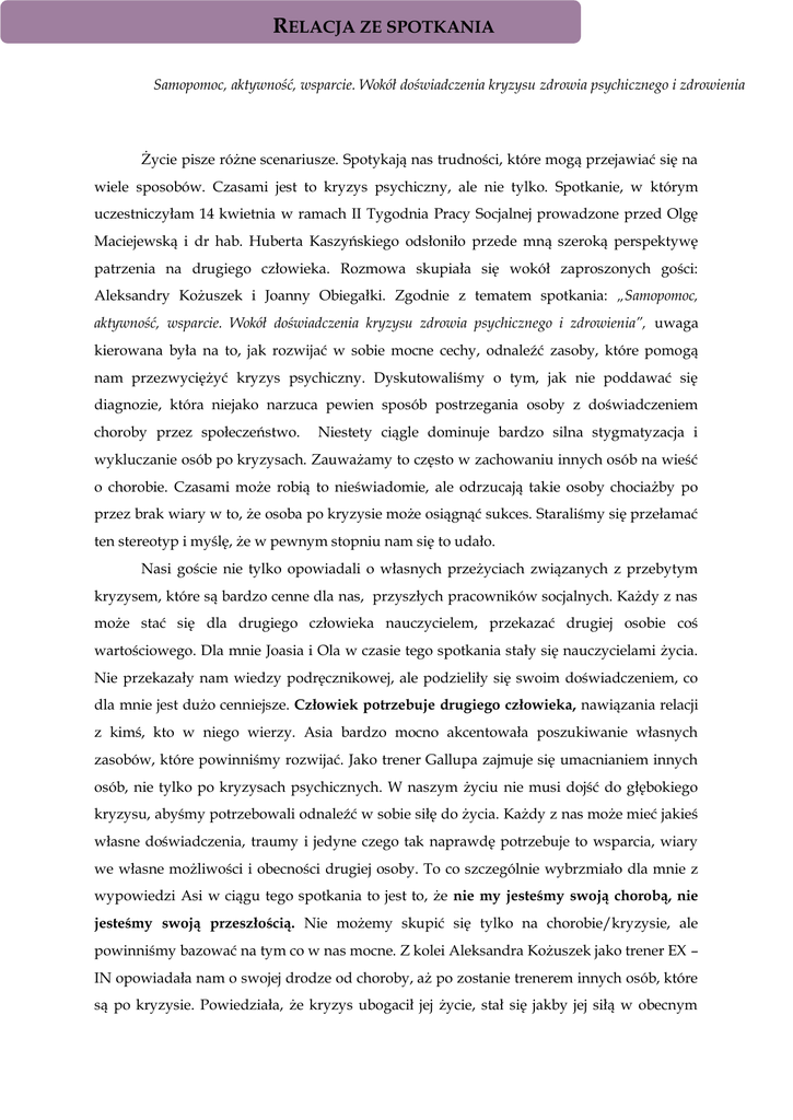 RELACJA ZE SPOTKANIA Samopomoc, aktywność, wsparcie. Wokół doświadczenia kryzysu zdrowia psychicznego i zdrowienia Życie pisze różne scenariusze. Spotykają nas trudności, które mogą przejawiać się na wiele sposobów. Czasami jest to kryzys psychiczny, ale nie tylko. Spotkanie, w którym uczestniczyłam 14 kwietnia w ramach II Tygodnia Pracy Socjalnej prowadzone przed Olgę Maciejewską i dr hab. Huberta Kaszyńskiego odsłoniło przede mną szeroką perspektywę patrzenia na drugiego człowieka. Rozmowa skupiała się wokół zaproszonych gości: Aleksandry Kożuszek i Joanny Obiegałki. Zgodnie z tematem spotkania: „Samopomoc, aktywność, wsparcie. Wokół doświadczenia kryzysu zdrowia psychicznego i zdrowienia”, uwaga kierowana była na to, jak rozwijać w sobie mocne cechy, odnaleźć zasoby, które pomogą nam przezwyciężyć kryzys psychiczny. Dyskutowaliśmy o tym, jak nie poddawać się diagnozie, która niejako narzuca pewien sposób postrzegania osoby z doświadczeniem choroby przez społeczeństwo. Niestety ciągle dominuje bardzo silna stygmatyzacja i wykluczanie osób po kryzysach. Zauważamy to często w zachowaniu innych osób na wieść o chorobie. Czasami może robią to nieświadomie, ale odrzucają takie osoby chociażby po przez brak wiary w to, że osoba po kryzysie może osiągnąć sukces. Staraliśmy się przełamać ten stereotyp i myślę, że w pewnym stopniu nam się to udało. Nasi goście nie tylko opowiadali o własnych przeżyciach związanych z przebytym kryzysem, które są bardzo cenne dla nas, przyszłych pracowników socjalnych. Każdy z nas może stać się dla drugiego człowieka nauczycielem, przekazać drugiej osobie coś wartościowego. Dla mnie Joasia i Ola w czasie tego spotkania stały się nauczycielami życia. Nie przekazały nam wiedzy podręcznikowej, ale podzieliły się swoim doświadczeniem, co dla mnie jest dużo cenniejsze. Człowiek potrzebuje drugiego człowieka, nawiązania relacji z kimś, kto w niego wierzy. Asia bardzo mocno akcentowała poszukiwanie własnych zasobów, które powinniśmy rozwijać. Jako trener Gallupa zajmuje się umacnianiem innych osób, nie tylko po kryzysach psychicznych. W naszym życiu nie musi dojść do głębokiego kryzysu, abyśmy potrzebowali odnaleźć w sobie siłę do życia. Każdy z nas może mieć jakieś własne doświadczenia, traumy i jedyne czego tak naprawdę potrzebuje to wsparcia, wiary we własne możliwości i obecności drugiej osoby. To co szczególnie wybrzmiało dla mnie z wypowiedzi Asi w ciągu tego spotkania to jest to, że nie my jesteśmy swoją chorobą, nie jesteśmy swoją przeszłością. Nie możemy skupić się tylko na chorobie/kryzysie, ale powinniśmy bazować na tym co w nas mocne. Z kolei Aleksandra Kożuszek jako trener EX – IN opowiadała nam o swojej drodze od choroby, aż po zostanie trenerem innych osób, które są po kryzysie. Powiedziała, że kryzys ubogacił jej życie, stał się jakby jej siłą w obecnym życiu. Zauważyła jak ważne jest wyjście poza instytucje i pomaganie człowiekowi w środowisku, w którym się znajduje. Podkreśliła, że niezależnie od przeżywania kryzysu psychicznego czy też innych trudności powinniśmy nie bać się korzystać z pomocy specjalistów. Pani Aleksandra jest również autorką książki Radość odzyskana, w której opisuje swoje osobiste doświadczenie. Spotkanie to bardzo wiele mnie nauczyło. Patrząc z perspektywy czasu, w którym się ono odbywało, biorąc pod uwagę pracę socjalną wiem, że najważniejsze jest to, aby być przy drugiej osobie. Towarzyszyć, wspierać, ale nie na chwilę, tylko budować trwałe relacje. Tworzyć wspólne płaszczyzny porozumienia. W pracy socjalnej nie możemy kierować się tylko wyłącznie teoretyczną wiedzą. Konieczne jest sięgnięcie do własnych doświadczeń, bądź też uczenie się właśnie od takich osób jak Joanna Obiegałka czy Aleksandra Kożuszek. To właśnie one pokazują jak nie bać się wyjść i mówić o swoich trudnych doświadczeniach, jak nie zagubić się w kryzysie i odzyskać radość z życia. Spotkanie to poszerzyło moją perspektywę patrzenia na społeczeństwo, które nas otacza. Problem nie leży w osobie mającej kryzys, ale w jej otoczeniu. To właśnie otoczenie powinniśmy zmieniać po przez taką formę edukacji. Nikt nie jest sobie w stanie sam pomóc. W czasie spotkania dr hab. Hubert Kaszyński powiedział, że potrzebujemy uchwycić się drugiej osoby, zakotwiczyć w twarzy Innego, który staje się dla nas swoistym kołem ratunkowym. Mieliśmy okazję przekonać się o tym czy jesteśmy gotowi usłyszeć odpowiedź. Zrobić to można tylko po przez dialog. W centrum tego wydarzenia stanęło SPOTKANIE. Właśnie tak powinna wyglądać nasza praca z ludźmi. Magdalena Piekarczyk Uniwersytet Papieski Jana Pawła II w Krakowie