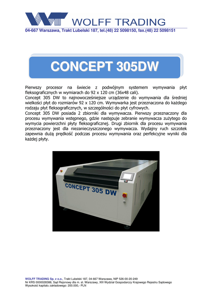 04-667 Warszawa, Trakt Lubelski 187, tel.(48) 22 5098150, fax.(48) 22 5098151 CONCEPT 305DW Pierwszy procesor na świecie z podwójnym systemem wymywania płyt fleksograficznych w wymiarach do 92 x 120 cm (36x48 cali). Concept 305 DW to najnowocześniejsze urządzenie do wymywania dla średniej wielkości płyt do rozmiarów 92 x 120 cm. Wymywarka jest przeznaczona do każdego rodzaju płyt fleksograficznych, w szczególności do płyt cyfrowych. Concept 305 DW posiada 2 zbiorniki dla wymywacza. Pierwszy przeznaczony dla procesu wymywania wstępnego, gdzie następuje zebranie wymywacza zużytego do wymycia powierzchni płyty fleksograficznej. Drugi zbiornik dla procesu wymywania przeznaczony jest dla niezanieczyszczonego wymywacza. Wydajny ruch szczotek zapewnia dużą prędkość podczas procesu wymywania oraz perfekcyjne wyniki dla każdej płyty. WOLFF TRADING Sp. z o.o., Trakt Lubelski 187, 04-667 Warszawa, NIP 526-00-20-249 Nr KRS 0000028388, Sąd Rejonowy dla m. st. Warszawy, XIII Wydział Gospodarczy Krajowego Rejestru Sądowego Wysokość kapitału zakładowego: 200.000,- PLN Właściwości: • • • • • • • • • podwójny i niezależny system hydrauliczny z dwoma zbiornikami automatyczny proces wymywania i czyszczenia płyty sterownik PLC, 20 kanałów pamięci łatwy w obsłudze panel dotykowy szczotki rotacyjne w ruchu oscylacyjnym w przeciwnych kierunkach - napędzane mechanicznie zintegrowany ogrzewacz/ochładzacz wymywacza z kontrolą temperatury pomiar zawartości oraz automatyczne uzupełnienie wymywacza zintegrowany system usuwania oparów wymywacza perforator do płyt Specyfikacja techniczna Model Rodzaj płyt Rozmiar płyt (max) PRZYŁĄCZA Energia (eksploatacja) Energia (zasilanie) Concept 305 DW PŁYTY Płyty fleksograficzne 920x1200 mm Skompresowane powietrze Wyciąg powietrza OGÓLNE Wymiary (bez opakowania) Waga (bez opakowania) Wymiary ( z opakowaniem) Waga (z opakowaniem) 8,5 kW – 13/24A 400V 3PH + N / 230V 3PH – 50/60 Hz 6 bar 300 m3/h 1700 1070 1900 1400 x 3820 x 970mm kg x 4100 x 1300 mm kg WOLFF TRADING Trakt Lubelski 187 04-667 Warszawa Tel. 0225098150 [email protected] str. 2