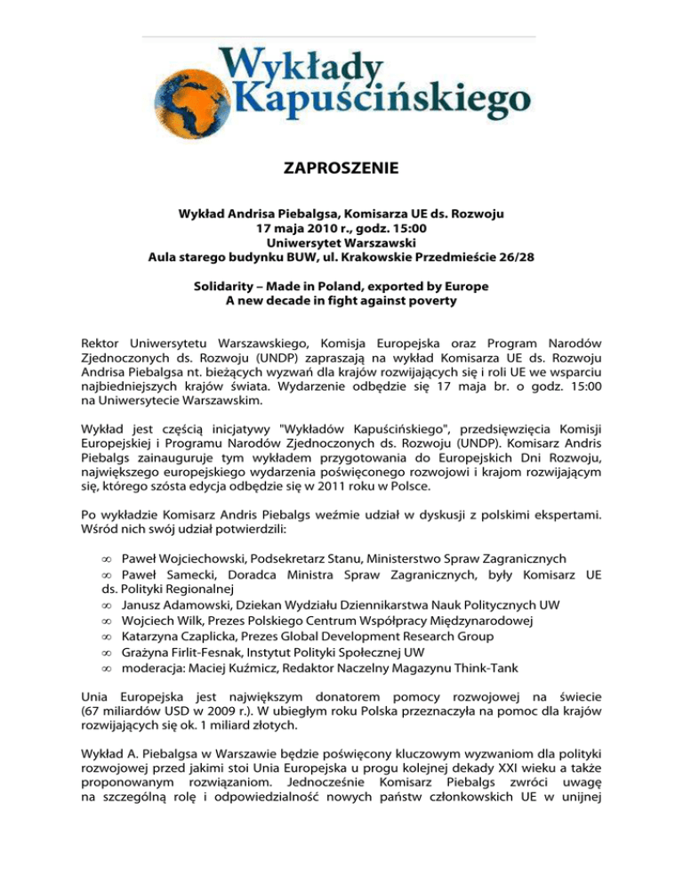 ZAPROSZENIE Wykład Andrisa Piebalgsa, Komisarza UE ds. Rozwoju 17 maja 2010 r., godz. 15:00 Uniwersytet Warszawski Aula starego budynku BUW, ul. Krakowskie Przedmieście 26/28 Solidarity – Made in Poland, exported by Europe A new decade in fight against poverty Rektor Uniwersytetu Warszawskiego, Komisja Europejska oraz Program Narodów Zjednoczonych ds. Rozwoju (UNDP) zapraszają na wykład Komisarza UE ds. Rozwoju Andrisa Piebalgsa nt. bieżących wyzwań dla krajów rozwijających się i roli UE we wsparciu najbiedniejszych krajów świata. Wydarzenie odbędzie się 17 maja br. o godz. 15:00 na Uniwersytecie Warszawskim. Wykład jest częścią inicjatywy "Wykładów Kapuścińskiego", przedsięwzięcia Komisji Europejskiej i Programu Narodów Zjednoczonych ds. Rozwoju (UNDP). Komisarz Andris Piebalgs zainauguruje tym wykładem przygotowania do Europejskich Dni Rozwoju, największego europejskiego wydarzenia poświęconego rozwojowi i krajom rozwijającym się, którego szósta edycja odbędzie się w 2011 roku w Polsce. Po wykładzie Komisarz Andris Piebalgs weźmie udział w dyskusji z polskimi ekspertami. Wśród nich swój udział potwierdzili: • Paweł Wojciechowski, Podsekretarz Stanu, Ministerstwo Spraw Zagranicznych • Paweł Samecki, Doradca Ministra Spraw Zagranicznych, były Komisarz UE ds. Polityki Regionalnej • Janusz Adamowski, Dziekan Wydziału Dziennikarstwa Nauk Politycznych UW • Wojciech Wilk, Prezes Polskiego Centrum Współpracy Międzynarodowej • Katarzyna Czaplicka, Prezes Global Development Research Group • Grażyna Firlit-Fesnak, Instytut Polityki Społecznej UW • moderacja: Maciej Kuźmicz, Redaktor Naczelny Magazynu Think-Tank Unia Europejska jest największym donatorem pomocy rozwojowej na świecie (67 miliardów USD w 2009 r.). W ubiegłym roku Polska przeznaczyła na pomoc dla krajów rozwijających się ok. 1 miliard złotych. Wykład A. Piebalgsa w Warszawie będzie poświęcony kluczowym wyzwaniom dla polityki rozwojowej przed jakimi stoi Unia Europejska u progu kolejnej dekady XXI wieku a także proponowanym rozwiązaniom. Jednocześnie Komisarz Piebalgs zwróci uwagę na szczególną rolę i odpowiedzialność nowych państw członkowskich UE w unijnej polityce rozwojowej i realizacji Milenijnych Celów Rozwoju. Komisarz chciałby także przy tej okazji odnieść się do roli Polski w zakresie rozwoju podczas zbliżającej się Prezydencji Polski w Radzie UE. „Wykłady Kapuścińskiego”: Eksperci z dziedziny polityki rozwojowej przybliżają tę tematykę studentom i szerszej publiczności na najbardziej prestiżowych uniwersytetach wszystkich dwunastu nowych państw członkowskich UE. Do tej pory w „Wykładach Kapuścińskiego” wzięli udział m.in. Paul Collier, Francois Bourguignon, Książe Norwegii Haakon, Dirk Messner, Simon Maxwell, Carol Lancaster, Eveline Herfkens. Potwierdzenie uczestnictwa w wykładzie: [email protected] do dn. 13 maja 2010 r. Wykład i dyskusja odbędą się wyłącznie w języku angielskim.