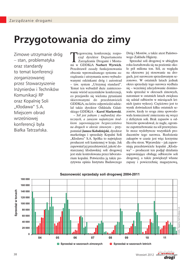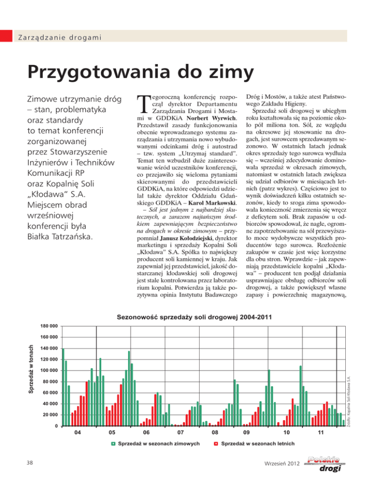 Zarządzanie drogami Przygotowania do zimy Zimowe utrzymanie dróg – stan, problematyka oraz standardy to temat konferencji zorganizowanej przez Stowarzyszenie Inżynierów i Techników Komunikacji RP oraz Kopalnię Soli „Kłodawa” S.A. Miejscem obrad wrześniowej konferencji była Białka Tatrzańska. egoroczną konferencję rozpoczął dyrektor Departamentu Zarządzania Drogami i Mostami w GDDKiA Norbert Wyrwich. Przedstawił zasady funkcjonowania obecnie wprowadzanego systemu zarządzania i utrzymania nowo wybudowanymi odcinkami dróg i autostrad – tzw. system „Utrzymaj standard”. Temat ten wzbudził duże zainteresowanie wśród uczestników konferencji, co przejawiło się wieloma pytaniami skierowanymi do przedstawicieli GDDKiA, na które odpowiedzi udzielał także dyrektor Oddziału Gdańskiego GDDKiA – Karol Markowski. – Sól jest jednym z najbardziej skutecznych, a zarazem najtańszym środkiem zapewniającym bezpieczeństwo na drogach w okresie zimowym – przypomniał Janusz Kołodziejski, dyrektor marketingu i sprzedaży Kopalni Soli „Kłodawa” S.A. Spółka to największy producent soli kamiennej w kraju. Jak zapewniał jej przedstawiciel, jakość dostarczanej kłodawskiej soli drogowej jest stale kontrolowana przez laboratorium kopalni. Potwierdza ją także pozytywna opinia Instytutu Badawczego T Dróg i Mostów, a także atest Państwowego Zakładu Higieny. Sprzedaż soli drogowej w ubiegłym roku kształtowała się na poziomie około pół miliona ton. Sól, ze względu na okresowe jej stosowanie na drogach, jest surowcem sprzedawanym sezonowo. W ostatnich latach jednak okres sprzedaży tego surowca wydłuża się – wcześniej zdecydowanie dominowała sprzedaż w okresach zimowych, natomiast w ostatnich latach zwiększa się udział odbiorów w miesiącach letnich (patrz wykres). Częściowo jest to wynik doświadczeń kilku ostatnich sezonów, kiedy to sroga zima spowodowała konieczność zmierzenia się wręcz z deficytem soli. Brak zapasów u odbiorców spowodował, że nagłe, ogromne zapotrzebowanie na sól przewyższało moce wydobywcze wszystkich producentów tego surowca. Rozłożenie zakupów w czasie jest więc korzystne dla obu stron. Wprawdzie – jak zapewniają przedstawiciele kopalni „Kłodawa” – producent ten podjął działania usprawniające obsługę odbiorców soli drogowej, a także powiększył własne zapasy i powierzchnię magazynową, Sezonowość sprzedaży soli drogowej 2004-2011 180 000 140 000 120 000 100 000 Źródło: Kopalnia Soli Kłodawa S.A. Sprzedaż w tonach 160 000 80 000 60 000 40 000 20 000 0 04 05 06 07 Sprzedaż w sezonach zimowych 38 08 09 10 Sprzedaż w sezonach letnich Wrzesień 2012 11 z nawierzchniami betonowymi jak i asfaltowymi, zwrócił uwagę na różnice pomiędzy utrzymaniem zimowym jednego i drugiego rodzaju nawierzchni. Jak zauważył, nawierzchnia betonowa jest mniej higroskopijna, szron pojawia się na niej rzadziej. Szybciej się jednak wychładza w stosunku do asfaltu. Na nawierzchni betonowej uzyskuje się również gorszą jakość odśnieżania, ponieważ błoto pośniegowe pozostaje w porach pomiędzy kruszywem. Droga betonowa szybciej przesycha. Plusem tego jest mniejsze narażenie na powstawanie oblodzenia i szronu, minusem fakt, że przy akcjach zwalczających oblodze- Spotkanie zgromadziło liczne grono uczestników Wrzesień 2012 Fot. Julian Szałański Gospodarze oraz goście konferencji Fot. Julian Szałański jednak, aby nie dopuścić do sytuacji gdy brakuje soli na potrzeby utrzymania zimowego dróg, konieczne jest wcześniejsze ogłaszanie przetargów przez jednostki budżetowe oraz odpowiednio wczesne zakupy i magazynowanie soli przez odbiorców. Spotkanie w Białce Tatrzańskiej było też okazją do podzielenia się doświadczeniami na temat utrzymania zimowego, w tym dotyczącego nawierzchni betonowej. Na przykładzie autostrady A2 na odcinku Świecko-Nowy Tomyśl omówił je Włodzimierz Matczak, dyrektor spółki Autostrada Eksploatacja. Od początku grudnia 2011 roku spółka rozpoczęła eksploatację liczącego 105 km odcinka o nawierzchni betonowej. W zakresie zimowego utrzymania drogi tej kategorii jej zadaniem jest m.in. usuwanie śniegu w ciągu 30 minut od otrzymania zawiadomienia lub rozpoznania opadów śniegu. Przy przeciętnych opadach śniegu i normalnych warunkach ruchu droga powinna być oczyszczona w ciągu dwóch godzin po ustaniu opadów podczas dnia i w ciągu czterech godzin po ustaniu opadów śniegu w czasie nocy. W warunkach obfitych opadów otwarty musi być co najmniej jeden pas ruchu w każdym kierunku, z ruchem zorganizowanym w formie konwoju posuwającego się za pługiem. Przedstawiciel Autostrady Eksploatacji, mając doświadczenia zarówno nie woda wraz z rozpuszczoną w niej solą szybciej spływa z nawierzchni, konieczne jest więc częstsze posypywanie, a co za tym idzie, większe zużycie soli. O doświadczeniach letniego i zimowego utrzymania A1 na odcinku Gdańsk-Toruń mówił z kolei Paweł Przybyła, z firmy Intertoll Polska – operatora koncesyjnego płatnego odcinka od Rusocina do Torunia. Firma obsługuje 152 km autostrady A1, w tym 9 MOP-ów, 9 węzłów autostradowych, 152 obiekty mostowe, wraz z najdłuższym mostem w Polsce przez Wisłę o długości niemal 2 km. Zajmuje się także utrzymaniem 16 przejść dla zwierząt, ponad 300 przepustów drogowych, stacji meteo, 2 punktów poboru opłat i 8 stacji poboru opłat, a także 3 obwodów utrzymania. W ramach planu zimowego spółka posiada 3 magazyny soli o pojemności łącznie około 8 tys. ton. Kolejne 7 tys. ton tego surowca przechowywanych jest na pryzmach. Uczestnicy spotkania w Białce Tatrzańskiej mieli także okazję zapoznać się m.in. z doświadczeniami utrzymania zimowego w Kraju Pardubickim w Czechach oraz możliwościami jakie w utrzymaniu zimowym stwarzają nowe technologie. EWA FERT 39