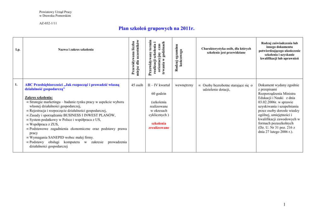Powiatowy Urząd Pracy w Drawsku Pomorskim AZ-032-1/11 1. ABC Przedsiębiorczości „Jak rozpocząć i prowadzić własną działalność gospodarczą” II – IV kwartał 60 godzin Zakres szkolenia: • Strategie marketingu – badanie rynku pracy w aspekcie wyboru własnej działalności gospodarczej, • Rejestracja i rozpoczęcie działalności gospodarczej, • Zasady i sporządzanie BUSINESS I INWEST PLANÓW, • System podatkowy w Polsce i współpraca z US, • Współpraca z ZUS, • Podstawowe zagadnienia ekonomiczne oraz podstawy prawa pracy • Wymagania SANEPID wobec małej firmy. • Podstawy obsługi komputera w zakresie prowadzenia działalności gospodarczej (szkolenia realizowane w okresach cyklicznych ) szkolenia zrealizowane Rodzaj egzaminu końcowego 45 osób realizacji szkolenia i orientacyjny czas trwania w godzinach Nazwa i zakres szkolenia Przewidywany termin Lp. Przewidywana liczba miejsc dla uczestników Plan szkoleń grupowych na 2011r. wewnętrzny Charakterystyka osób, dla których szkolenie jest przewidziane • Osoby bezrobotne starające się o udzielenie dotacji, Rodzaj zaświadczenia lub innego dokumentu potwierdzającego ukończenie szkolenia i uzyskanie kwalifikacji lub uprawnień Dokument wydany zgodnie z przepisami Rozporządzenia Ministra Edukacji i Nauki z dnia 03.02.2006r. w sprawie uzyskiwania i uzupełniania przez osoby dorosłe wiedzy ogólnej, umiejętności i kwalifikacji zawodowych w formach pozaszkolnych (Dz. U. Nr 31 poz. 216 z dnia 27 lutego 2006 r.). 1 2. Technolog prac wykończeniowych w budownictwie 12 osób Szkolenia z zakresu umiejętności aktywnego poszukiwania pracy Zakres szkolenia: • Reakcja w trudnych sytuacjach, • Kompetencje i predyspozycje zawodowe, • Bariery na drodze do zatrudnienia, • Zarządzanie sobą podczas poszukiwania zatrudnienia, • Analiza rynku pracy, • Formy zatrudnienia, • Wizytówka zawodowa – dokumenty aplikacyjne, • Sztuka mówienia i prezentacji, • Zachowanie asertywne w poszukiwaniu pracy, • Oferta na rynku pracy, • Przygotowanie do rozmowy z pracodawcą, • Rozmowa kwalifikacyjna, • Edukacja dla rynku pracy, • Plan poszukiwania pracy, • Podjęcie zatrudnienia. wewnętrzny • Wykształcenie minimum podstawowe, • Brak przeciwwskazań lekarskich do wykonywania zawodu, Dokument wydany zgodnie z przepisami Rozporządzenia Ministra Edukacji i Nauki z dnia 03.02.2006r. w sprawie uzyskiwania i uzupełniania przez osoby dorosłe wiedzy ogólnej, umiejętności i kwalifikacji zawodowych w formach pozaszkolnych (Dz. U. Nr 31 poz. 216 z dnia 27 lutego 2006 r.). wewnętrzny • Osoby które, nie posiadają doświadczenia w poszukiwaniu pracy, które utraciły motywacje do poszukiwania pracy w związku z długotrwałym niepowodzeniem w jej poszukiwaniu lub osoby, które chcą powrócić na rynek pracy po długim okresie braku aktywności zawodowej, • Osoby skierowane przez doradcę zawodowego, objęte indywidualnym procesem doradczym Dokument wydany zgodnie z przepisami Rozporządzenia Ministra Edukacji i Nauki z dnia 03.02.2006r. w sprawie uzyskiwania i uzupełniania przez osoby dorosłe wiedzy ogólnej, umiejętności i kwalifikacji zawodowych w formach pozaszkolnych (Dz. U. Nr 31 poz. 216 z dnia 27 lutego 2006 r.). 300 godzin Zakres szkolenia: • Bezpieczeństwo i higiena pracy, • Przygotowanie stanowiska pracy, • Przygotowanie powierzchni pod malowanie, • Prace malarskie, • Przygotowanie powierzchni pod posadzki, • Wykonywanie zabudów z płyt kartonowo-gipsowych, • Układanie płytek ceramicznych, • Prace murarskie. 3. II – III kwartał szkolenie zrealizowane 70 osób 7 grup II – IV kwartał 80 godzin szkolenia zrealizowane Sporządziła: Anna Winnicka Plan szkoleń upowszechniono w dniu 20.03.2011r. 2 UWAGA!!! INFORMACJA DLA OSÓB BEZROBOTNYCH Dokładne terminy naboru na dany kierunek szkolenia będą aktualizowane i upowszechniane w dokumencie pod nazwą „Informacja o zapisach na szkolenie”, dlatego teŜ osoby zainteresowane szkoleniami proszone są o utrzymywanie stałego kontaktu z urzędem pracy. Dodatkowe informacje moŜna uzyskać w PUP w Drawsku Pom., bądź filiach urzędu w Złocieńcu i Czaplinku oraz oddziale zamiejscowym w Kaliszu Pom. W przypadku zainteresowania szkoleniem, osoby proszone są o składanie „Karty Kandydata na szkolenie” w terminach podanych w „Informacji o zapisach na szkolenie” ( patrz: data rozpoczęcia i zakończenia zapisów na szkolenie) Na szkolenie nie mogą być kwalifikowane osoby korzystające wcześniej ze szkoleń, w przypadku których łączne koszty wszystkich szkoleń (tzn. naleŜność dla instytucji szkoleniowej, ubezpieczenie, przejazd, zakwaterowanie, wyŜywienie podczas szkolenia, badania lekarskie, koszt egzaminu) w ciągu ostatnich 3 lat przekroczyłyby 10-krotność minimalnego wynagrodzenia. W przypadku problemów organizacyjnych urząd zastrzega moŜliwość zmiany terminu szkolenia. Natomiast w przypadku duŜego zainteresowania lub w przypadku trudności przy naborze kandydatów na szkolenie urząd zastrzega moŜliwość zmiany liczby uczestników. 3